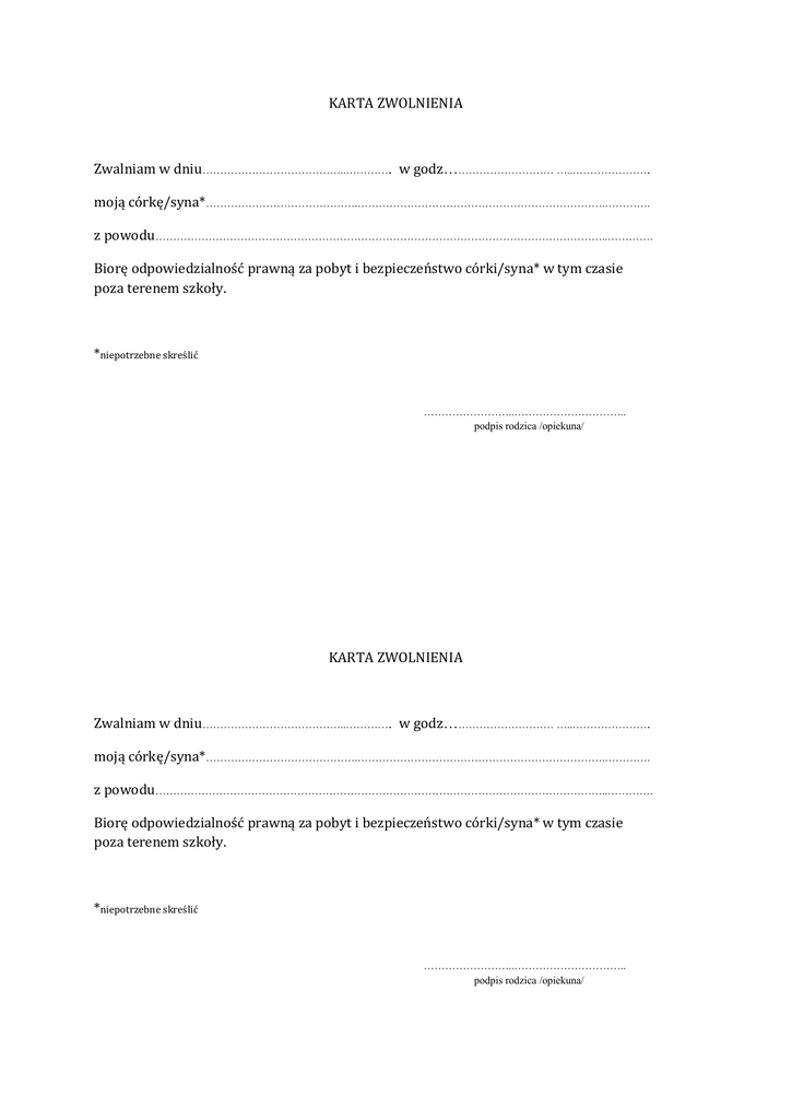 KARTA ZWOLNIENIA Zwalniam w dniu…………………………………..…………. w godz………………………… …..…………………. moją córkę/syna*…………………………………….…………………………………………………………….…………. z powodu………………………………………………………………………………………………………………..…………. Biorę odpowiedzialność prawną za pobyt i bezpieczeństwo córki/syna* w tym czasie poza terenem szkoły. *niepotrzebne skreślić ……………………..………………………….. podpis rodzica /opiekuna/ KARTA ZWOLNIENIA Zwalniam w dniu…………………………………..…………. w godz………………………… …..…………………. moją córkę/syna*…………………………………….…………………………………………………………….…………. z powodu………………………………………………………………………………………………………………..…………. Biorę odpowiedzialność prawną za pobyt i bezpieczeństwo córki/syna* w tym czasie poza terenem szkoły. *niepotrzebne skreślić ……………………..………………………….. podpis rodzica /opiekuna/