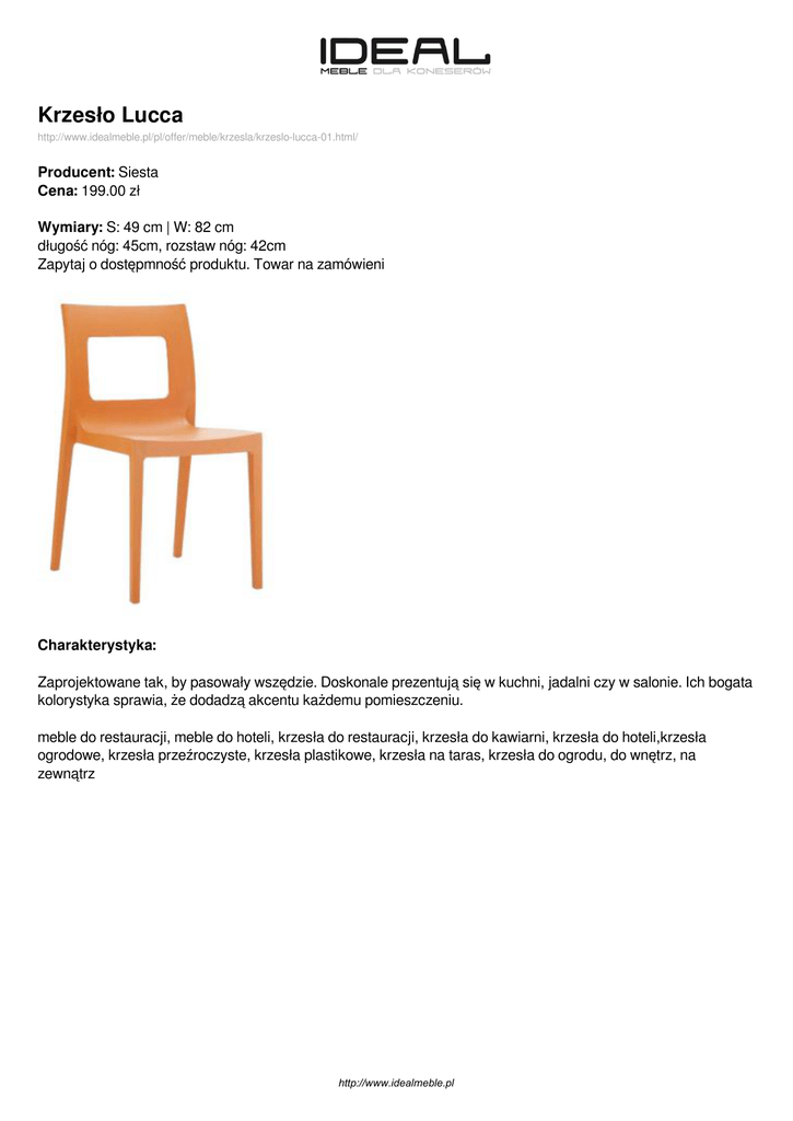 Krzesło Lucca http://www.idealmeble.pl/pl/offer/meble/krzesla/krzeslo-lucca-01.html/ Producent: Siesta Cena: 199.00 zł Wymiary: S: 49 cm | W: 82 cm długość nóg: 45cm, rozstaw nóg: 42cm Zapytaj o dostępmność produktu. Towar na zamówieni Charakterystyka: Zaprojektowane tak, by pasowały wszędzie. Doskonale prezentują się w kuchni, jadalni czy w salonie. Ich bogata kolorystyka sprawia, że dodadzą akcentu każdemu pomieszczeniu. meble do restauracji, meble do hoteli, krzesła do restauracji, krzesła do kawiarni, krzesła do hoteli,krzesła ogrodowe, krzesła przeźroczyste, krzesła plastikowe, krzesła na taras, krzesła do ogrodu, do wnętrz, na zewnątrz http://www.idealmeble.pl Dostępne wersje produktu: nazwa produktu Krzesło Lucca warianty kolor biały cena 199.00zł dostępne Na zamówienie Krzesło Lucca kolor jasny niebieski 199.00zł Na zamówienie Krzesło Lucca kolor jasno szary 199.00zł Na zamówienie Krzesło Lucca kolor beżowy 199.00zł Na zamówienie Krzesło Lucca kolor pomarańczowy 199.00zł Na zamówienie http://www.idealmeble.pl Zdjęcia produktu: http://www.idealmeble.pl Powered by TCPDF (www.tcpdf.org)