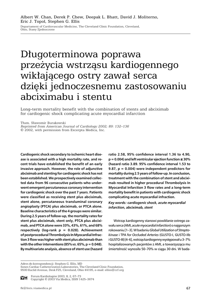 Albert W. Chan, Derek P. Chew, Deepak L. Bhatt, David J. Moliterno, Eric J. Topol, Stephen G. Ellis Departament of Cardiovascular Medicine, The Cleveland Clinic Foundation, Cleveland, Ohio, Stany Zjednoczone Długoterminowa poprawa przeżycia wstrząsu kardiogennego wikłającego ostry zawał serca dzięki jednoczesnemu zastosowaniu abciximabu i stentu Long-term mortality benefit with the combination of stents and abciximab for cardiogenic shock complicating acute myocardial infarction Tłum. Sławomir Burakowski Reprinted from American Journal of Cardiology 2002; 89: 132–136 © 2002, with permission from Excerpta Medica, Inc. Cardiogenic shock secondary to ischemic heart disease is associated with a high mortality rate, and recent trials have established the benefit of an early invasive approach. However, the role of adjunctive abciximab and stenting for cardiogenic shock has not been established. We prospectively examined collected data from 96 consecutive patients who underwent emergent percutaneous coronary intervention for cardiogenic shock over the past 7 years. Patients were classified as receiving stent plus abciximab, stent alone, percutaneous transluminal coronary angioplasty (PTCA) plus abciximab, or PTCA alone. Baseline characteristics of the 4 groups were similar. During 2.5 years of follow-up, the mortality rates for stent plus abciximab, stent only, PTCA plus abciximab, and PTCA alone were 33%, 43%, 61%, and 68% respectively (log-rank p = 0.028). Achievement of postprocedural Thrombolysis In Myocardial Infraction 3 flow was higher with stent plus abciximab than with the other interventions (85% vs. 65%, p = 0.048). By multivariate analysis, absence of stent use (hazard ratio 2.58, 95% confidence interval 1.36 to 4.90, p = 0.004) and left ventricular ejection function £ 30% (hazard ratio 3.89. 95% confidence interval 1.53 to 9.87, p = 0.004) were independent predictors for mortality during 2.5 years of follow-up. In conclusion, treatment with the combination of stent and abciximab resulted in higher procedural Thrombolysis In Myocardial Infarction 3 flow rates and a long-term mortality benefit in patients with cardiogenic shock complicating acute myocardial infraction. Key words: cardiogenic shock, acute myocardial infarction, abciximab, stent Wstrząs kardiogenny stanowi powikłanie ostrego zawału serca (AMI, acute myocardial infarction) o najgorszym rokowaniu [1–3]. W badaniu Global Utilization of Streptokinase i TPA for Occluded Arteries (GUSTO-I, GUSTO-IIb i GUSTO-III) [4–6], wstrząs kardiogenny występował u 3–7% hospitalizowanych pacjentów z AMI, a towarzysząca mu śmiertelność wynosiła 50–70% w ciągu 30 dni. W bada- Adres do korespondencji: Stephen G. Ellis, MD Sones Cardiac Catheterization Laboratories, The Cleveland Clinic Foundation, 9500 Euclid Avenue, Desk F25, Cleveland, Ohio 44195, e-mail: [email protected] Forum Kardiologów 2003, 8, 2, 67–73 Copyright © 2003 Via Medica, ISSN 1425–3674 [email protected] 67 Forum Kardiologów 2003, tom 8, nr 2 niu SHould we emergently revascularize Occluded Coronary arteries for cardiogenic shocK (SHOCK) [7] stwierdzono korzyści z rewaskularyzowania w trybie nagłym zamkniętych naczyń wieńcowych w przebiegu wstrząsu kardiogennego. Po przeprowadzeniu powyższej próby (1993– –1998) nastąpiły istotne zmiany w dziedzinie kardiologii inwazyjnej. Obecnie rutynowo w czasie interwencji wieńcowych wykonuje się stentowanie oraz podaje się leki z grupy inhibitorów receptora płytkowego IIb/IIIa [8–16]. Pacjentów z objawami wstrząsu kardiogennego nie włączano jednak do większości dużych badań oceniających leczenie inhibitorami receptora glikoproteinowego IIb/IIIa. Nie badano dotychczas wpływu łącznego użycia stentu oraz inhibitora receptora glikoproteinowego IIb/IIIa na wynik leczenia pacjentów ze wstrząsem kardiogennym. Brak skuteczności leczenia trombolitycznego pacjentów z wstrząsem kardiogennym, który wykazano w badaniu Gruppo Italiano per lo Studio della Sopravvivenza nell’Infarto-1(GISSI) [17], prawdopodobnie był spowodowany niedostateczną penetracją leków trombolitycznych w obręb skrzepliny w sytuacji niezapewniającej odpowiedniego ciśnienia perfuzji [18]. Dlatego też autorzy przeprowadzili badanie oceniające rolę użycia stentów, abciximabu lub obu tych środków jednocześnie w przebiegu wstrząsu kardiogennego będącego powikłaniem AMI. MATERIAŁ I METODY Dobór pacjentów i plan badania Celem badania było porównanie wczesnego i odległego wyniku przezskórnej rewaskularyzcji w leczeniu wstrząsu kardiogennego w przebiegu AMI z jednoczesnym zastosowaniem: I) stentu oraz abciximabu, II) tylko stentu, III) przezskórnej angioplastyki wieńcowej (PTCA, percutaneous transluminal coronary angioplasty) oraz abciximabu lub IV) tylko PTCA. Od stycznia 1993 do czerwca 2000 roku gromadzono dane do analizy (parametry kliniczne, szczegóły zabiegu, wyniki leczenia bezpośredniego i w czasie hospitalizacji), korzystając z metody prospektywnej. Śmiertelność odległą oceniono na podstawie kontroli dokumentacji szpitalnych oraz Głównego Rejestru Zgonów Ubezpieczenia Społecznego Stanów Zjednoczonych. Wstrząs kardiogenny zdefiniowano na podstawie wskaźnika sercowego wynoszącego 2,2 l/min/m2 lub mniej, z ciśnieniem późnorozkurczowym w lewej komorze powyżej 18 mm Hg lub trwającym ponad 30 min spadkiem skurczowego ciśnienia systemowego do 80 mm Hg lub mniej, któremu towarzyszy wypełnienie żył szyjnych, przed przekazaniem do pracowni hemodynamicznej. Ostry zawał serca potwierdzano na podstawie obecności objawów niedokrwienia mięśnia sercowego z towarzyszącym świeżym uniesieniem odcinka ST, nowo powstałym blokiem lewej odnogi, zawałem ściany tylnej z obniżeniem 68 odcinka ST w odprowadzeniach przedsercowych lub stężeniem kinazy kreatynowej 3-krotnie przewyższającym normę. Cewnikowanie serca, łącznie z pomiarem ciśnień w prawej po