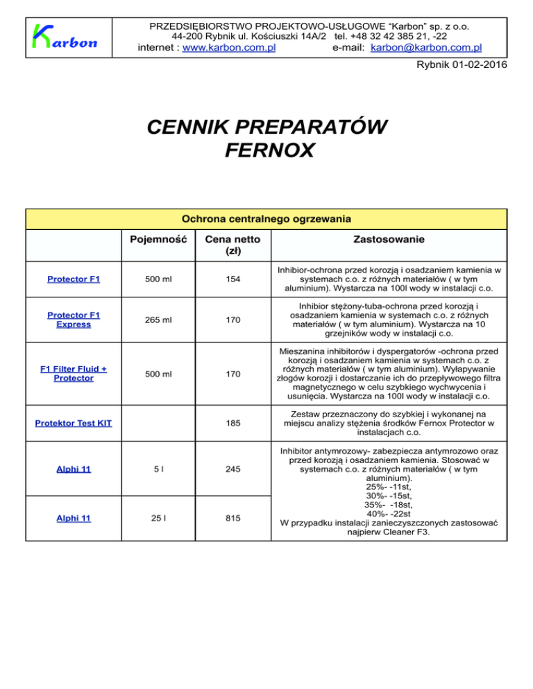 PRZEDSIĘBIORSTWO PROJEKTOWO-USŁUGOWE “Karbon” sp. z o.o. 44-200 Rybnik ul. Kościuszki 14A/2 tel. +48 32 42 385 21, -22 internet : www.karbon.com.pl e-mail: [email protected] Rybnik 01-02-2016 CENNIK PREPARATÓW FERNOX Ochrona centralnego ogrzewania Protector F1 Protector F1 Express F1 Filter Fluid + Protector Pojemność Cena netto (zł) 500 ml 154 Inhibior-ochrona przed korozją i osadzaniem kamienia w systemach c.o. z różnych materiałów ( w tym aluminium). Wystarcza na 100l wody w instalacji c.o. 170 Inhibior stężony-tuba-ochrona przed korozją i osadzaniem kamienia w systemach c.o. z różnych materiałów ( w tym aluminium). Wystarcza na 10 grzejników wody w instalacji c.o. 170 Mieszanina inhibitorów i dyspergatorów -ochrona przed korozją i osadzaniem kamienia w systemach c.o. z różnych materiałów ( w tym aluminium). Wyłapywanie złogów korozji i dostarczanie ich do przepływowego filtra magnetycznego w celu szybkiego wychwycenia i usunięcia. Wystarcza na 100l wody w instalacji c.o. 185 Zestaw przeznaczony do szybkiej i wykonanej na miejscu analizy stężenia środków Fernox Protector w instalacjach c.o. 265 ml 500 ml Protektor Test KIT Alphi 11 5l 245 Alphi 11 25 l 815 Zastosowanie Inhibitor antymrozowy- zabezpiecza antymrozowo oraz przed korozją i osadzaniem kamienia. Stosować w systemach c.o. z różnych materiałów ( w tym aluminium). 25%- -11st, 30%- -15st, 35%- -18st, 40%- -22st W przypadku instalacji zanieczyszczonych zastosować najpierw Cleaner F3. Czyszczenie systemów c.o. Cleaner F3 Cleaner F5 Express 500 ml 280 ml 154 Uniwersalny środek czyszczący-usuwa z instalacji nowych i starych kamień, szlam. 500 ml wystarcza na oczyszczenie średniej instalacji domowej. 170 Uniwersalny środek czyszczący stężony- tuba-usuwa z instalacji nowych i starych kamień, szlam. Tuba wystarcza do czyszczenia instalacji średniej wielkości (ok.10 grzejników) DS 40 System Cleaner 1,9 kg 285 Usuwa kamień kotłowy, czarny osad(magnetyt), szlam i inne osady z kotłów i instalacji c.o.. Sypki proszek łatwy w użyciu z pompą czyszczącą np. Powerflushing. W opakowaniu saszetka z System Neutraliser. System Neutraliser 2 kg 270 Neutralizator do DS40 154 Odkamieniacz do instalacji ciepłej wody: podgrzewaczy, wymienników. Nie używać z cienkościennym, skorodowanym aluminium, stalą galwanizowaną, akrylikiem(np.wanny), emaliowanymi metalami. DS-3 2 kg Likwidacja szumów w c.o. Pojemność Cena netto (zł) Boiler Noise Silencer F2 500 ml 165 Boiler Noise Silencer F2 Express 265 ml Zastosowanie Wycisza pracę kotła, można stosować z innymi środkami Fernox. Do wszystkich rodzajów kotłów, w tym kotłów kombinowanych, wykonanych z różnych metali oraz zawierających aluminium. Wystarcza do typowej (ok.10 grzejnikowej) instalacji c.o. Uszczelnianie instalacji c.o. Leak Sealer F4 500 ml 145 Uszczelnia większość nieszczelności i małych niedostępnych wycieków. Stosować w podgrzanej wodzie. Wystarcza na 80-120 l wody obiegowej. Leak Sealer F4 Express 265 ml 170 Uszczelnia większość nieszczelności i małych niedostępnych wycieków. Stosować w podgrzanej wodzie Dezynfekcja instalacji c.o. AF-10 Biocide 500 ml Ceny mogą ulec zmianie. 180 Uniwersalny środek biobójczy, zapobiegającyrozwojowi bakterii oraz grzybów w instalacjach c.o.. Należy stosować razem z Fernox Protector F1. Zapobiega ponownemu powstaniu galaretowatych osadów w zbiornikach zasilających i naczyniach wzbiorczych. Eliminuje gazy fermentacyjne. Wystarcza na max. 20 grzejników(poj.200l)