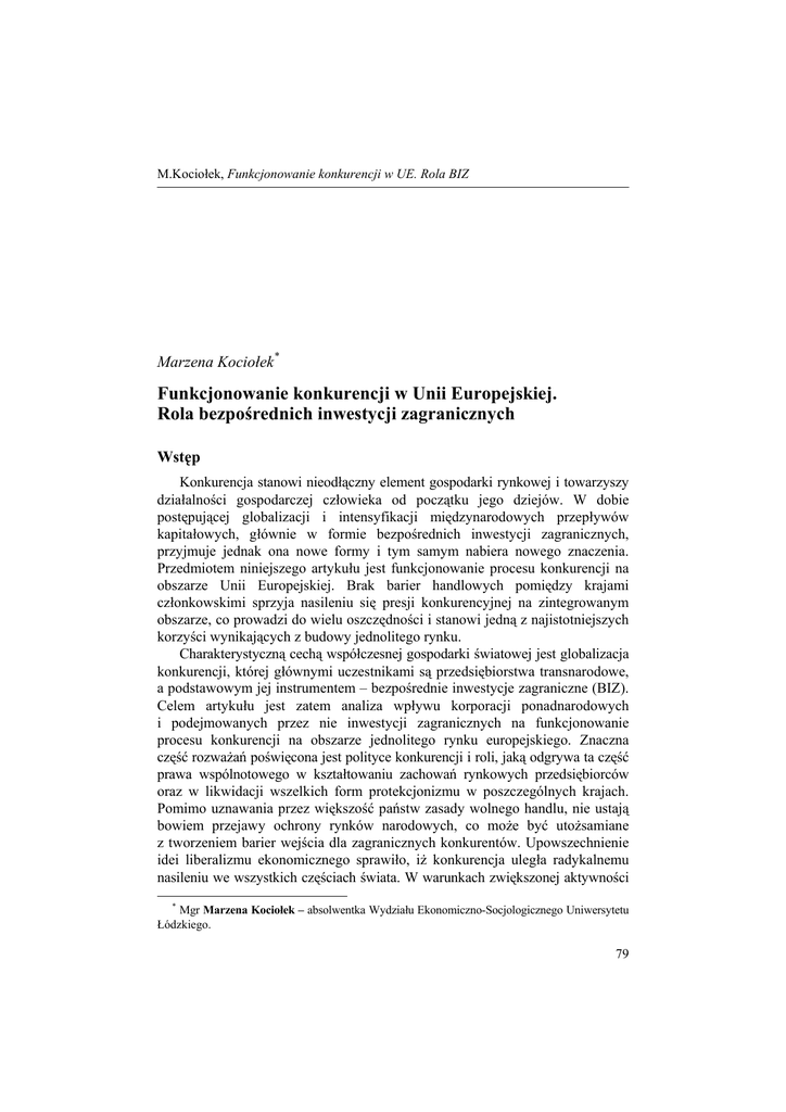 M.Kociołek, Funkcjonowanie konkurencji w UE. Rola BIZ Marzena Kociołek * Funkcjonowanie konkurencji w Unii Europejskiej. Rola bezpośrednich inwestycji zagranicznych Wstęp Konkurencja stanowi nieodłączny element gospodarki rynkowej i towarzyszy działalności gospodarczej człowieka od początku jego dziejów. W dobie postępującej globalizacji i intensyfikacji międzynarodowych przepływów kapitałowych, głównie w formie bezpośrednich inwestycji zagranicznych, przyjmuje jednak ona nowe formy i tym samym nabiera nowego znaczenia. Przedmiotem niniejszego artykułu jest funkcjonowanie procesu konkurencji na obszarze Unii Europejskiej. Brak barier handlowych pomiędzy krajami członkowskimi sprzyja nasileniu się presji konkurencyjnej na zintegrowanym obszarze, co prowadzi do wielu oszczędności i stanowi jedną z najistotniejszych korzyści wynikających z budowy jednolitego rynku. Charakterystyczną cechą współczesnej gospodarki światowej jest globalizacja konkurencji, której głównymi uczestnikami są przedsiębiorstwa transnarodowe, a podstawowym jej instrumentem – bezpośrednie inwestycje zagraniczne (BIZ). Celem artykułu jest zatem analiza wpływu korporacji ponadnarodowych i podejmowanych przez nie inwestycji zagranicznych na funkcjonowanie procesu konkurencji na obszarze jednolitego rynku europejskiego. Znaczna część rozważań poświęcona jest polityce konkurencji i roli, jaką odgrywa ta część prawa wspólnotowego w kształtowaniu zachowań rynkowych przedsiębiorców oraz w likwidacji wszelkich form protekcjonizmu w poszczególnych krajach. Pomimo uznawania przez większość państw zasady wolnego handlu, nie ustają bowiem przejawy ochrony rynków narodowych, co może być utożsamiane z tworzeniem barier wejścia dla zagranicznych konkurentów. Upowszechnienie idei liberalizmu ekonomicznego sprawiło, iż konkurencja uległa radykalnemu nasileniu we wszystkich częściach świata. W warunkach zwiększonej aktywności * Mgr Marzena Kociołek – absolwentka Wydziału Ekonomiczno-Socjologicznego Uniwersytetu Łódzkiego. 79 Studia Europejskie, 4/2003 firm zarówno krajowych, jak i zagranicznych utrzymanie właściwego funkcjonowania jednolitego rynku europejskiego ma bardzo duże znaczenie. 1. Istota konkurencji na obszarze Unii Europejskiej Konkurencja jest jednym z podstawowych elementów gospodarki opartej na systemie wolnego rynku. Trudno mówić o mechanizmie rynkowym pomijając jej znaczącą rolę. Z jednej strony jest ona czynnikiem prowadzącym do równowagi rynku, natomiast z drugiej – jest tym elementem, który pobudza podmioty gospodarcze do działania, do wdrażania innowacji mających na celu poprawę ich pozycji rynkowej. Konkurencja sprawia, że każda transakcja ekonomiczna jest kontrolowana przez kalkulację dochodu, rachunek zysków i strat. Konkurencja jest postrzegana jako czynnik stymulujący rozwój gospodarczy oraz prowadzący w najlepszy sposób do efektywnej alokacji czynników produkcji. Przedstawiciele ekonomii klasycznej definiowali rynek jako samoczynnie działający mechanizm regulowania procesów gospodarczych, a jego głównym instrumentem była wolna konkurencja. Analiza działalności gospodarczej na przestrzeni wieków wskazuje jednak, że każde przedsiębiorstwo działa w mniej lub bardziej niedoskonałym otoczeniu, w którym istnieje wiele czynników zakłócających funkcjonowanie systemu konkurencji. Do najistotniejszych z nich należą bariery wejścia i wyjścia z rynku, siła ekonomiczna przedsiębiorstw, skoncentrowana struktura rynkowa. Do nasilenia ich występowania przyczynia się współcześnie liberalizacja przepływów kapitałowych, głównie w formie BIZ. Z drugiej strony, prowadzenie działalności gospodarczej w podlegającej globalizacji gospodarce światowej otwiera dla przedsiębiorstw, zarówno z krajów rozwiniętych, jak i rozwijających się, bezprecedensowe możliwości. Konkurencja to nieodłączny element funkcjonowania rynku, a więc dotyczy wszystkich podmiotów na nim funkcjonujących, zatem udział w procesie konkurencji nie jest przedmiotem decyzji podejmowanej przez przedsiębiorstwo. Przedmiotem takiej decyzji może być jedynie kwestia, w jaki sposób konkurować, jaką drogę obrać, aby osiągnąć najkorzystniejsze warunki do prowadzenia działalności gospodarczej. Jako siłę koordynującą, równoważącą wielkość produkcji z popytem, postrzega się konkurencję cenową. Wynikiem liberalizacji i likwidacji wszelkich barier na obszarze Unii Europejskiej jest nasilenie się tego rodzaju konkurencji, co odczuwają przede wszystkim przedsiębiorstwa funkcjonujące dotychczas wyłącznie na rynkach narodowych. 1 Drogą rozwoju dla słabszych podmiotów może być rozwijanie konkurencji pozacenowej, a więc za pomocą takich 1 s.93. 80 A.Sznajder, Euromarketing. Uwarunkowania na rynku Unii Europejskiej, Warszawa 1999, M.Kociołek, Funkcjonowanie konkurencji w UE. Rola BIZ środków jak reklama, jakość wyrobów i świadczonych usług. W rzeczywistości gospodarczej obie formy konkurowania występują jednocześnie i wzajemnie się uzupełniają. W zależności od stosowanych instrumentów konkurencji i zasięgu działania, przedsiębiorstwa można podzielić na cztery grupy. (Por.: schemat 1.) Schemat 1. Konkurenci na rynku europejskim Cenowa TRADYCJONALIŚCI EKSPANSJONIŚCI Pozacenowa PIONIERZY ODKRYWCY KONKURENCJA Krajowy Paneuropejski Zasięg działania Źródło: Opracowanie własne. „Tradycjonaliści” to przedsiębiorstwa działające na wybranym rynku narodowym, na którym są już dobrze znane nabywcom. Przeważnie są to niewielkie firmy, ale o ugruntowanej pozycji i wysokim udziale rynkowym. Operują zwykle w tradycyjnych branżach konsumpcyjnych. Zniesienia barier nie traktują jako możliwości rozwoju, lecz jako zagrożenie ze strony zagranicznych konkurentów. „Ekspansjoniści” to przedsiębiorstwa funkcjonujące na rozległym rynku europejskim, na co p