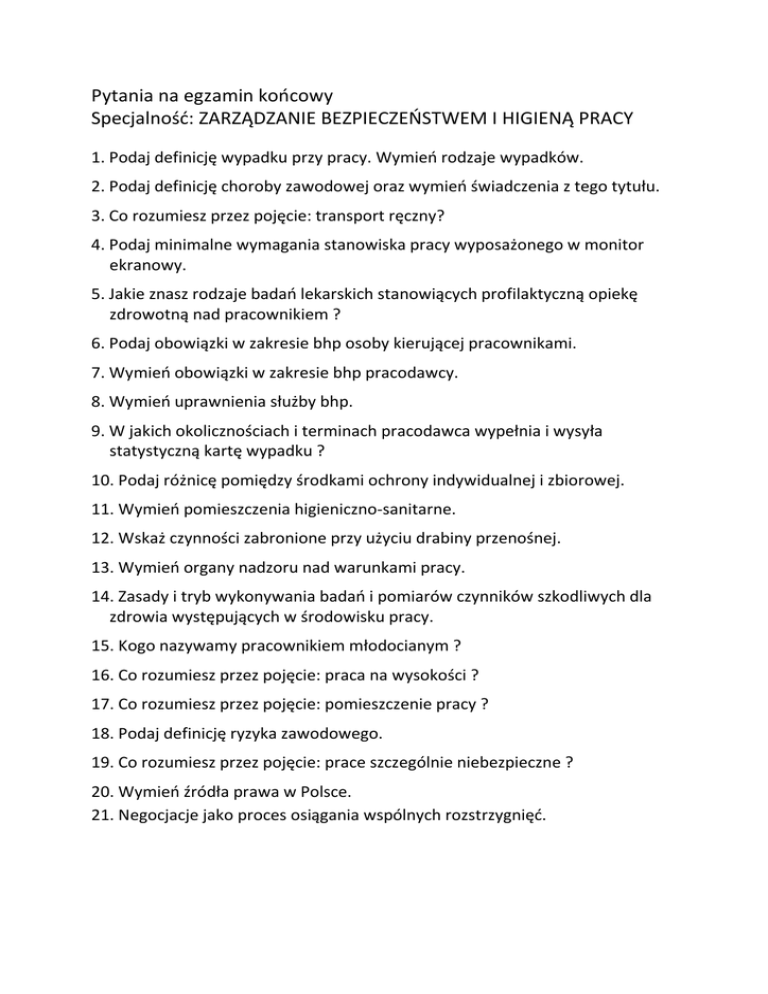 Pytania na egzamin końcowy Specjalność: ZARZĄDZANIE BEZPIECZEŃSTWEM I HIGIENĄ PRACY 1. Podaj definicję wypadku przy pracy. Wymień rodzaje wypadków. 2. Podaj definicję choroby zawodowej oraz wymień świadczenia z tego tytułu. 3. Co rozumiesz przez pojęcie: transport ręczny? 4. Podaj minimalne wymagania stanowiska pracy wyposażonego w monitor ekranowy. 5. Jakie znasz rodzaje badań lekarskich stanowiących profilaktyczną opiekę zdrowotną nad pracownikiem ? 6. Podaj obowiązki w zakresie bhp osoby kierującej pracownikami. 7. Wymień obowiązki w zakresie bhp pracodawcy. 8. Wymień uprawnienia służby bhp. 9. W jakich okolicznościach i terminach pracodawca wypełnia i wysyła statystyczną kartę wypadku ? 10. Podaj różnicę pomiędzy środkami ochrony indywidualnej i zbiorowej. 11. Wymień pomieszczenia higieniczno-sanitarne. 12. Wskaż czynności zabronione przy użyciu drabiny przenośnej. 13. Wymień organy nadzoru nad warunkami pracy. 14. Zasady i tryb wykonywania badań i pomiarów czynników szkodliwych dla zdrowia występujących w środowisku pracy. 15. Kogo nazywamy pracownikiem młodocianym ? 16. Co rozumiesz przez pojęcie: praca na wysokości ? 17. Co rozumiesz przez pojęcie: pomieszczenie pracy ? 18. Podaj definicję ryzyka zawodowego. 19. Co rozumiesz przez pojęcie: prace szczególnie niebezpieczne ? 20. Wymień źródła prawa w Polsce. 21. Negocjacje jako proces osiągania wspólnych rozstrzygnięć.