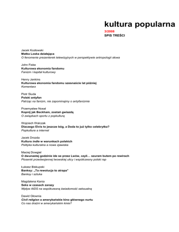 kultura popularna 3/2008 SPIS TREŚCI Jacek Kozłowski Matka Loska działająca O fenomenie prezenterek telewizyjnych w perspektywie antropologii słowa John Fiske Kulturowa ekonomia fandomu Fanizm i kapitał kulturowy Henry Jenkins Kulturowa ekonomia fandomu szesnaście lat później Komentarz Piotr Siuda Polski antyfan Patrząc na fanizm, nie zapominajmy o antyfanizmie Przemysław Nosal Kopnij jak Beckham, zostań gwiazdą O związkach sportu z popkulturą Wojciech Walczak Dlaczego Elvis to jeszcze bóg, a Doda to już tylko celebrytka? Popkultura a internet Jacek Drozda Kultura indie w warunkach polskich Polityka kulturalna a nowe zjawiska Maciej Dowgiel O dwunastej godzinie ide se przez Lwów, czyli… szuram butem po rewirach Piosenki przedwojennej lwowskiej ulicy i współczesny polski rap Łukasz Biskupski Banksy: „Ta rewolucja to atrapa” Banksy i sztuka Magdalena Kania Seks w czasach zarazy Wpływ AIDS na współczesną świadomość seksualną Dawid Głownia Civil religion a amerykańskie kino głównego nurtu Co nas drażni w amerykańskim kinie? Agata Dimmich blogi.o.modzie.ulicznej.pl Próba semiologicznej analizy nowej formy tekstu mody – blogu ze zdjęciami mody ulicznej Maciej Duda Wysokie i niskie Popularna proza kobieca Boris Firsov Kultura i proces transformacji Kulturowe przemiany dzisiejszej Rosji Tomasz Zarycki Przeszłość komunistyczna w rosyjskiej kulturze popularnej Kto powiedział, że źle nam się żyło? recenzje