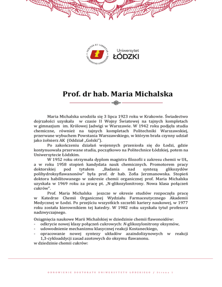 Prof. dr hab. Maria Michalska Maria Michalska urodziła się 3 lipca 1923 roku w Krakowie. Świadectwo dojrzałości uzyskała w czasie II Wojny Światowej na tajnych kompletach w gimnazjum im. Królowej Jadwigi w Warszawie. W 1942 roku podjęła studia chemiczne, również na tajnych kompletach Politechniki Warszawskiej, przerwane wybuchem Powstania Warszawskiego, w którym brała czynny udział jako żołnierz AK (Oddział „Golski”). Po zakończeniu działań wojennych przeniosła się do Łodzi, gdzie kontynuowała przerwane studia, początkowo na Politechnice Łódzkiej, potem na Uniwersytecie Łódzkim. W 1952 roku otrzymała dyplom magistra filozofii z zakresu chemii w UŁ, a w roku 1958 stopień kandydata nauk chemicznych. Promotorem pracy doktorskiej pod tytułem „Badania nad syntezą glikozydów polihydroksyflawanonów” była prof. dr hab. Zofia Jerzmanowska. Stopień doktora habilitowanego w zakresie chemii organicznej prof. Maria Michalska uzyskała w 1969 roku za pracę pt. „N-glikozylonitrony. Nowa klasa połączeń cukrów”. Prof. Maria Michalska jeszcze w okresie studiów rozpoczęła pracę w Katedrze Chemii Organicznej Wydziału Farmaceutycznego Akademii Medycznej w Łodzi. Po przejściu wszystkich szczebli kariery naukowej, w 1977 roku została kierownikiem tej katedry. W 1982 roku uzyskała tytuł profesora nadzwyczajnego. Osiągnięcia naukowe Marii Michalskiej w dziedzinie chemii flawonoidów: - odkrycie nowej klasy połączeń cukrowych: N-glikozylonitrony oksymów, - udowodnienie mechanizmu klasycznej reakcji Kostaneckiego, - opracowanie nowej syntezy układów azaindolizynowych w reakcji 1,3-cykloaddycji zasad azotowych do oksymu flawanonu. w dziedzinie chemii cukrów: O D N O W I E N I E D O K T O R A T U U N I W E R S Y T E T U Ł Ó D Z K I E G O / S t r o n a 1 O D N O W I E N I E - D O K T O R A T U U N I W E R S Y T E T U Ł Ó D Z K I E G O otrzymanie nieznanych dotychczas tio- i selenofosforanów cukrów, które znajdują zastosowałanie w syntezie glikozydowych pochodnych cukrów, cukrów nienasyconych oraz merkaptanów i episulfidów cukrów, opracowanie stereoselektywnej syntezy trudno dostępnych glikozydów 2-deoksycukrów z wykorzystaniem ditiofosforanów cukrów, udowodnienie udziału pentakoordynacyjnego produktu przejściowego w procesie transfosforylacji tiofosforanów cukrów, zaobserwowanie tworzenia się kompleksów molekularnych tiofosforanów cukrów z izopropanolem i kwasu dialkoksymonotiofosforowego z imidazolem oraz ustaliła ich strukturę. Badania przeprowadzone przez prof. Marię Michalską zostały wykorzystane przez innych badaczy i stanowią oryginalny polski wkład w dziedzinę chemii cukrów. W okresie kiedy kierowała Katedrą Chemii Organicznej jednostka ta stała się jednym z liczących się w świecie centrum badań naukowych w tej dziedzinie. Warto podkreślić, że kilku absolwentów Wydziału Mat-Fiz-Chem UŁ kontynuowało pod kierunkiem prof. Marii Michalskiej swoje kariery naukowe. Wyniki swoich badań prof. M. Michalska publikowała w prestiżowych czasopismach o zasięgu międzynarodowym, m.in.: J. Am. Chem. Soc., J. Org. Chem., Tetrahedron , Tetrahedron Letters, J. Chem. Soc., J. Chem.Soc. Chem. Communications, Synthesis. W roku 1974 przebywała na Stypendium Rockefellera w University Chemical Laboratory, University of East Anglia, Norwich. Prowadziła również wykłady jako Visiting Profesor w licznych ośrodkach naukowych za granicą m.in. Bochum University, Niemcy (1986), Gainesville, University of Florida, USA (1987), Madison, University of Wisconsin, USA (1988), University of Jerusalem,Izrael (1992), Instytut Maxa Plancka Medycyny Eksperymentalnej, Getynga , Niemcy (1989). Maria Michalska wygłosiła szereg referatów plenarnych na Międzynarodowych Zjazdach Naukowych, m. in. w Moskwie w 1983 r., w Lyngby w Danii w 1984 r. oraz w Krakowie w 1993 r. Ponadto wielokrotnie była zapraszana do wygłaszania referatów ilustrujących jej dorobek naukowy do USA, Japonii, ZSRR i Chin. W dniu 17 czerwca 2003 roku w Łodzi zostało zorganizowane Ogólnopolskie Sympozjum z udziałem prelegentów z zagranicy dedykowane prof. Marii Michalskiej .Obecnie profesor Michalska jest od kilku lat na emeryturze. O D N O W I E N I E D O K T O R A T U U N I W E R S Y T E T U Ł Ó D Z K I E G O / S t r o n a 2