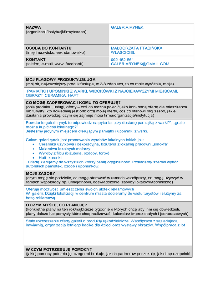 NAZWA (organizacji/instytucji/firmy/osoba) GALERIA RYNEK OSOBA DO KONTAKTU (imię i nazwisko, ew. stanowisko) MAŁGORZATA PTASIŃSKA WŁAŚCICIEL KONTAKT (telefon, e-mail, www, facebook) 602-152-861 [email protected] MÓJ FLAGOWY PRODUKT/USŁUGA (mój hit, najważniejszy produkt/usługa, w 2-3 zdaniach, to co mnie wyróżnia, misja) PAMIĄTKI I UPOMINKI Z WARKI, WIDOKÓWKI Z NAJCIEKAWSZYMI MIEJSCAMI, OBRAZY, CERAMIKA, HAFT. CO MOGĘ ZAOFEROWAĆ i KOMU TO OFERUJĘ? (opis produktu, usługi, oferty – coś co można polecić jako konkretną ofertę dla mieszkańca lub turysty, kto dokładniej jest odbiorcą mojej oferty, coś co stanowi mój zasób, jakie działania prowadzę, czym się zajmuje moja firma/organizacja/instytucja) Powstanie galerii rynyk to odpowiedz na pytania: „czy dostanę pamiątkę z warki?”, „gdzie można kupić coś lokalnego?” Jesteśmy jedynym miejscem oferującym pamiątki i upominki z warki. Celem galeri rynek jest promowanie wyrobów lokalnych takich jak: Ceramika użytkowa i dekoracyjna, biżuteria z lokalnej pracowni „smokfa” Malarstwo lokalnych malarzy Wyroby z filcu (biżuteria, ozdoby, torby) Haft, koronki . Ofertę kierujemy do wszystkich którzy cenią oryginalność. Posiadamy szeroki wybór autorskich pamiątek, ozdób i upominków. MOJE ZASOBY (czym mogę się podzielić, co mogę oferować w ramach współpracy, co mogę użyczyć w ramach współpracy np. umiejętności, doświadczenie, zasoby lokalowe/techniczne) Oferuję możliwość umieszczenia swoich ulotek reklamowych W galerii. Dzięki lokalizacji w centrum miasta docieramy do wielu turystów i służymy za bazę reklamową. O CZYM MYŚLĘ, CO PLANUJĘ? (konkretne plany na ten rok/najbliższe tygodnie o których chcę aby inni się dowiedzieli, plany dalsze lub pomysły które chcę realizować, kalendarz imprez stałych i jednorazowych) Stałe rozrzeszanie oferty galerii o produkty rękodzielnicze. Współpraca z sąsiadującą kawiarnią, organizacja letniego kącika dla dzieci oraz wystawy obrazów. Współpraca z lot W CZYM POTRZEBUJĘ POMOCY? (jakiej pomocy potrzebuję, czego mi brakuje, jakich partnerów poszukuję, jak chcę uzupełnić swoją ofertę) Dostępność do ofert lokalnych organiacji turystycznych DZIAŁANIA PROMOCYJNE (jakie prowadziłem do tej pory działania promocyjne, dobre praktyki, planowane działania) 1) 2) 3) 4) Wystawa „zielono mi” z okazji 50-lecia twórczości mieszkanki warki . Wakacyjne malowanki Powarsztatowa wystawa ceramiki,,każdy lepić może ‘’ Wystawa „warka w grafice” KONTAKTY (z kim warto skontaktować się przed kolejnym spotkaniem, moi sprawdzeni partnerzy, ciekawe kontakty, które mogą być pomocne przy podejmowaniu wspólnych działań, inne osoby do kontaktu z mojej firmy/organizacji i ich wyjątkowe kompetencje) .Pracownia Ceramiczna „Smokfa” Katarzyna Kwiatkowska Multimedialna & Webmastering „Mp Desing” Maciej Ptasiński Stowarzyszenie ‘’50 +Szansą Dla Siebie’’ Anna Szafarz