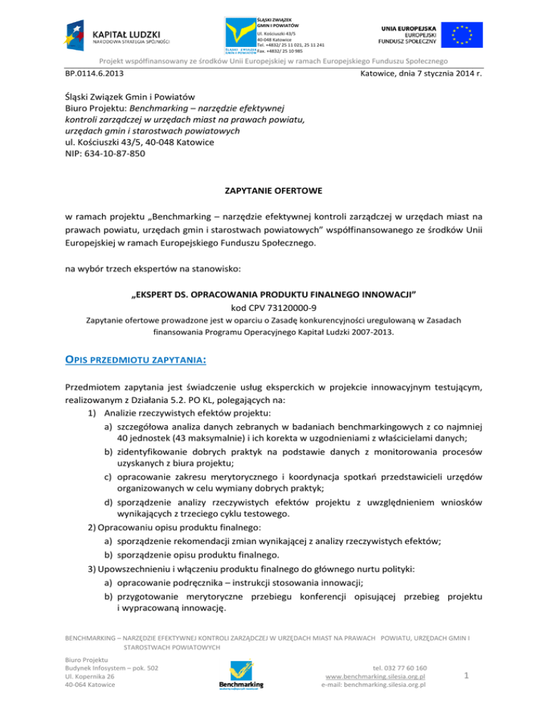 ŚLĄSKI ZWIĄZEK GMIN I POWIATÓW Ul. Kościuszki 43/5 40-048 Katowice Tel. +4832/ 25 11 021, 25 11 241 Fax. +4832/ 25 10 985 Projekt współfinansowany ze środków Unii Europejskiej w ramach Europejskiego Funduszu Społecznego BP.0114.6.2013 Katowice, dnia 7 stycznia 2014 r. Śląski Związek Gmin i Powiatów Biuro Projektu: Benchmarking – narzędzie efektywnej kontroli zarządczej w urzędach miast na prawach powiatu, urzędach gmin i starostwach powiatowych ul. Kościuszki 43/5, 40-048 Katowice NIP: 634-10-87-850 ZAPYTANIE OFERTOWE w ramach projektu „Benchmarking – narzędzie efektywnej kontroli zarządczej w urzędach miast na prawach powiatu, urzędach gmin i starostwach powiatowych” współfinansowanego ze środków Unii Europejskiej w ramach Europejskiego Funduszu Społecznego. na wybór trzech ekspertów na stanowisko: „EKSPERT DS. OPRACOWANIA PRODUKTU FINALNEGO INNOWACJI” kod CPV 73120000-9 Zapytanie ofertowe prowadzone jest w oparciu o Zasadę konkurencyjności uregulowaną w Zasadach finansowania Programu Operacyjnego Kapitał Ludzki 2007-2013. OPIS PRZEDMIOTU ZAPYTANIA: Przedmiotem zapytania jest świadczenie usług eksperckich w projekcie innowacyjnym testującym, realizowanym z Działania 5.2. PO KL, polegających na: 1) Analizie rzeczywistych efektów projektu: a) szczegółowa analiza danych zebranych w badaniach benchmarkingowych z co najmniej 40 jednostek (43 maksymalnie) i ich korekta w uzgodnieniami z właścicielami danych; b) zidentyfikowanie dobrych praktyk na podstawie danych z monitorowania procesów uzyskanych z biura projektu; c) opracowanie zakresu merytorycznego i koordynacja spotkań przedstawicieli urzędów organizowanych w celu wymiany dobrych praktyk; d) sporządzenie analizy rzeczywistych efektów projektu z uwzględnieniem wniosków wynikających z trzeciego cyklu testowego. 2) Opracowaniu opisu produktu finalnego: a) sporządzenie rekomendacji zmian wynikającej z analizy rzeczywistych efektów; b) sporządzenie opisu produktu finalnego. 3) Upowszechnieniu i włączeniu produktu finalnego do głównego nurtu polityki: a) opracowanie podręcznika – instrukcji stosowania innowacji; b) przygotowanie merytoryczne przebiegu konferencji opisującej przebieg projektu i wypracowaną innowację. BENCHMARKING – NARZĘDZIE EFEKTYWNEJ KONTROLI ZARZĄDCZEJ W URZĘDACH MIAST NA PRAWACH POWIATU, URZĘDACH GMIN I STAROSTWACH POWIATOWYCH Biuro Projektu Budynek Infosystem – pok. 502 Ul. Kopernika 26 40-064 Katowice tel. 032 77 60 160 www.benchmarking.silesia.org.pl e-mail: benchmarking.silesia.org.pl 1 ŚLĄSKI ZWIĄZEK GMIN I POWIATÓW Ul. Kościuszki 43/5 40-048 Katowice Tel. +4832/ 25 11 021, 25 11 241 Fax. +4832/ 25 10 985 Projekt współfinansowany ze środków Unii Europejskiej w ramach Europejskiego Funduszu Społecznego Szczegółowy opis przedmiotu zapytania ofertowego zawarty został w załączniku nr 1a / 1b oraz 1c, odpowiednio: 1a) ekspert ds. opracowania produktu finalnego innowacji z doświadczeniem praktycznym w zakresie zarządzania jednostką sektora finansów publicznych, 1b) ekspert ds. opracowania produktu finalnego innowacji z doświadczeniem praktycznym w zakresie zarządzania jednostką sektora finansów publicznych, 1c) ekspert ds. opracowania produktu finalnego innowacji ze specjalizacją w zakresie zarządzania procesami. Obowiązki Wykonawcy, prawa autorskie itp. określone zostały we wzorze umowy – załącznik nr 3. Dokumenty wypracowane w ramach dotychczasowej realizacji projektu dostępne są na portalu projektu www.benchmarking.silesia.org.pl w zakładce „o projekcie”. ZAŁOŻENIA PROJEKTU : Projekt „Benchmarking…” dedykowany jest jednostkom sektora finansów publicznych i ma na celu poprawę jakości usług publicznych poprzez wzrost efektywności funkcjonujących w urzędach systemów zarządzania z uwzględnieniem benchmarkingu jako istotnego elementu kontroli zarządczej. Projekt będzie realizowany do dnia 30 kwietnia 2015 roku. Produktem finalnym projektu, który przełoży się na podniesienie jakości usług publicznych świadczonych przez urzędy będzie zestaw narzędzi składający się z: modelu prowadzenia benchmarkingu, schematu kompetencyjnego, zestawu wskaźników monitorowania efektywności usług publicznych dla kluczowych procesów realizowanych przez urzędy, narzędzia informatycznego wspierającego benchmarking, portalu projektu. Grupą docelową dla rozwiązań, które wypracowane zostaną w projekcie są przede wszystkim rozumiane przez pryzmat kontroli zarządczej I stopnia urzędy miast, gmin i starostwa powiatowe. Odbiorcami efektów innowacji będą także mieszkańcy oraz przedsiębiorcy gmin i powiatów, w których wdrożony zostanie benchmarking w pełnym zakresie, a który to pozytywnie wpłynie na jakość świadczonych przez dane jednostki usług publicznych. WYMAGANIA DOTYCZĄCE OFERENTÓW: DLA OSOBY APLIKUJĄCEJ NA STANOWISKO eksperta ds. opracowania produktu finalnego innowacji z doświadczeniem praktycznym w zakresie zarządzania jednostką sektora finansów publicznych (dokumentacja oznaczona 1a i 1b): 1. 2. Wykształcenie wyższe, pożądane z zakresu administracji publicznej czy też prawa administracyjnego – stopień co najmniej magistra, Status pracownika jednostki samorządowej lub pracownika organizacji/instytucji, której cel działalności skierowany jest na bezpośrednią współpracę z samorządem terytorialnym - na stanowisku kierowniczym (co najmniej 5-cio letni staż pracy), BENCHMARKING – NARZĘDZIE EFEKTYWNEJ KONTROLI ZARZĄDCZEJ W URZĘDACH MIAST NA PRAWACH POWIATU, URZĘDACH GMIN I STAROSTWACH POWIATOWYCH Biuro Projektu Budynek Infosystem – pok. 502 Ul. Kopernika 26 40-064 Katowice tel. 032 77 60 160 www.benchmarking.silesia.org.pl e-mail: benchmarking.silesia.org.pl 2 ŚLĄSKI ZWIĄZEK GMIN I POWIATÓW Ul. Kościuszki 43/5 40-048 Katowice Tel. +4832/ 25 11 021, 25 11 241 Fax. +4832/ 25 10 985 Projekt współfinansowany ze środków Unii Europ