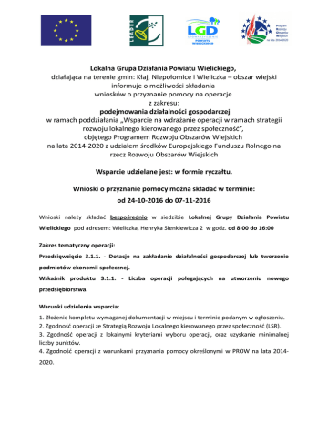 Lokalna Grupa Działania Powiatu Wielickiego, działająca na terenie gmin: Kłaj, Niepołomice i Wieliczka – obszar wiejski informuje o możliwości składania wniosków o przyznanie pomocy na operacje z zakresu: podejmowania działalności gospodarczej w ramach poddziałania „Wsparcie na wdrażanie operacji w ramach strategii rozwoju lokalnego kierowanego przez społeczność”, objętego Programem Rozwoju Obszarów Wiejskich na lata 2014-2020 z udziałem środków Europejskiego Funduszu Rolnego na rzecz Rozwoju Obszarów Wiejskich Wsparcie udzielane jest: w formie ryczałtu. Wnioski o przyznanie pomocy można składać w terminie: od 24-10-2016 do 07-11-2016 Wnioski należy składać bezpośrednio w siedzibie Lokalnej Grupy Działania Powiatu Wielickiego pod adresem: Wieliczka, Henryka Sienkiewicza 2 w godz. od 8:00 do 16:00 Zakres tematyczny operacji: Przedsięwzięcie 3.1.1. - Dotacje na zakładanie działalności gospodarczej lub tworzenie podmiotów ekonomii społecznej. Wskaźnik produktu 3.1.1. - Liczba operacji polegających na utworzeniu nowego przedsiębiorstwa. Warunki udzielenia wsparcia: 1. Złożenie kompletu wymaganej dokumentacji w miejscu i terminie podanym w ogłoszeniu. 2. Zgodność operacji ze Strategią Rozwoju Lokalnego kierowanego przez społeczność (LSR). 3. Zgodność operacji z lokalnymi kryteriami wyboru operacji, oraz uzyskanie minimalnej liczby punktów. 4. Zgodność operacji z warunkami przyznania pomocy określonymi w PROW na lata 20142020. Kryteria wyboru operacji: Lokalne kryteria wyboru operacji znajdują się na stronie LGD – www.lgdpowiatwielicki.eu oraz w wersji papierowej w Biurze LGD. Minimalna liczba punktów, której uzyskanie jest warunkiem wyboru operacji wynosi: 50% możliwej do uzyskania maksymalnej liczby punktów tj. 10 Formularz wniosku o przyznanie pomocy, wniosku o płatność oraz projekt umowy o udzielenie wsparcia dostępne są na stronie internetowej Urzędu Marszałkowskiego Województwa Małopolskiego - www.prow.malopolska.pl Formularz wniosku o udzielenie wsparcia, formularz wniosku o płatność, formularz umowy o udzielenie wsparcia, LSR, kryteria wyboru operacji są udostępnione na stronie: Lokalnej Grupy Działania Powiatu Wielickiego – www.lgdpowiatwielicki.eu oraz do wglądu w Biurze Lokalnej Grupy Działania Powiatu Wielickiego - Wieliczka, ul. Henryka Sienkiewicza 2 w godz. od 8:00 do 16:00 Wysokość dostępnych środków w ramach naboru wynosi 400 000 zł. Kwota dostępna na jednego Beneficjenta wynosi 50 000 zł Wykaz dokumentów niezbędnych do wyboru projektów: 1. Wniosek o przyznanie pomocy wraz z wymaganymi załącznikami w formie drukowanej 2. Wniosek o przyznanie pomocy wraz z wymaganymi załącznikami w formie elektronicznej 3. Oświadczenie wnioskodawcy o wyrażeniu zgody na przetwarzanie danych osobowych Wykaz dokumentów fakultatywnych w celu ustalenia zgodności stanu faktycznego z lokalnymi kryteriami wyboru: 1. Oświadczenie o miejscu zamieszkania (jeśli dotyczy) 2. Porozumienie o współpracy w ramach partnerstwa przy realizacji projektu (jeśli dotyczy) Wszelkie informacje niezbędne dla prawidłowego wypełnienia wniosków udzielane są w Biurze Lokalnej Grupy Działania oraz pod numerem tel. 12 288 00 95 w godz. od 8:00 do 16:00