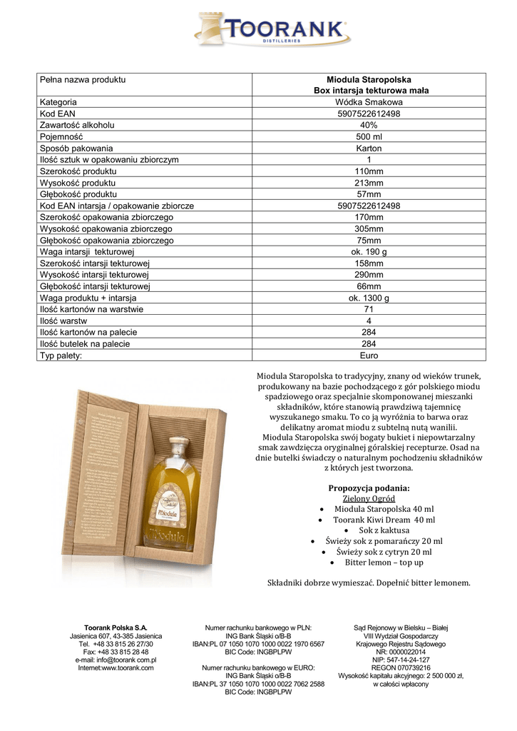 Pełna nazwa produktu Kategoria Kod EAN Zawartość alkoholu Pojemność Sposób pakowania Ilość sztuk w opakowaniu zbiorczym Szerokość produktu Wysokość produktu Głębokość produktu Kod EAN intarsja / opakowanie zbiorcze Szerokość opakowania zbiorczego Wysokość opakowania zbiorczego Głębokość opakowania zbiorczego Waga intarsji tekturowej Szerokość intarsji tekturowej Wysokość intarsji tekturowej Głębokość intarsji tekturowej Waga produktu + intarsja Ilość kartonów na warstwie Ilość warstw Ilość kartonów na palecie Ilość butelek na palecie Typ palety: Miodula Staropolska Box intarsja tekturowa mała Wódka Smakowa 5907522612498 40% 500 ml Karton 1 110mm 213mm 57mm 5907522612498 170mm 305mm 75mm ok. 190 g 158mm 290mm 66mm ok. 1300 g 71 4 284 284 Euro Miodula Staropolska to tradycyjny, znany od wieków trunek, produkowany na bazie pochodzącego z gór polskiego miodu spadziowego oraz specjalnie skomponowanej mieszanki składników, które stanowią prawdziwą tajemnicę wyszukanego smaku. To co ją wyróżnia to barwa oraz delikatny aromat miodu z subtelną nutą wanilii. Miodula Staropolska swój bogaty bukiet i niepowtarzalny smak zawdzięcza oryginalnej góralskiej recepturze. Osad na dnie butelki świadczy o naturalnym pochodzeniu składników z których jest tworzona. Propozycja podania: Zielony Ogród Miodula Staropolska 40 ml Toorank Kiwi Dream 40 ml Sok z kaktusa Świeży sok z pomarańczy 20 ml Świeży sok z cytryn 20 ml Bitter lemon – top up Składniki dobrze wymieszać. Dopełnić bitter lemonem. Toorank Polska S.A. Jasienica 607, 43-385 Jasienica Tel. +48 33 815 26 27/30 Fax: +48 33 815 28 48 e-mail: info@toorank com.pl Internet:www.toorank.com Numer rachunku bankowego w PLN: ING Bank Śląski o/B-B IBAN:PL 07 1050 1070 1000 0022 1970 6567 BIC Code: INGBPLPW Numer rachunku bankowego w EURO: ING Bank Śląski o/B-B IBAN:PL 37 1050 1070 1000 0022 7062 2588 BIC Code: INGBPLPW Sąd Rejonowy w Bielsku – Białej VIII Wydział Gospodarczy Krajowego Rejestru Sądowego NR: 0000022014 NIP: 547-14-24-127 REGON 070739216 Wysokość kapitału akcyjnego: 2 500 000 zł, w całości wpłacony