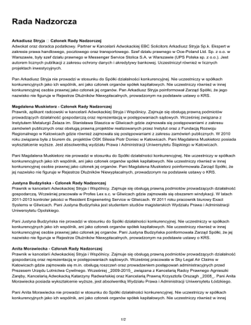 Rada Nadzorcza Arkadiusz Stryja Członek Rady Nadzorczej Adwokat oraz doradca podatkowy. Partner w Kancelarii Adwokackiej EBC Solicitors Arkadiusz Stryja Sp.k. Ekspert w zakresie prawa handlowego, pocztowego oraz transportowego. Szef działu prawnego w Oce-Poland Ltd. Sp. z o.o. w Warszawie, były szef działu prawnego w Messenger Service Stolica S.A. w Warszawie (UPS Polska sp. z o.o.). Jest autorem licznych publikacji z zakresu ochrony danych i akredytywy bankowej. Uczestniczył również w licznych projektach inwestycyjnych. Pan Arkadiusz Stryja nie prowadzi w stosunku do Spółki działalności konkurencyjnej. Nie uczestniczy w spółkach konkurencyjnych jako ich wspólnik, ani jako członek organów spółek kapitałowych. Nie uczestniczy również w innej konkurencyjnej osobie prawnej jako członek jej organów. Pan Arkadiusz Stryja poinformował Zarząd Spółki, że jego nazwisko nie figuruje w Rejestrze Dłużników Niewypłacalnych, prowadzonym na podstawie ustawy o KRS. Magdalena Muskietorz - Członek Rady Nadzorczej Prawnik, aplikant radcowski w kancelarii Adwokackiej Stryja i Wspólnicy. Zajmuje się obsługą prawną podmiotów prowadzących działalność gospodarczą oraz reprezentacją w postępowaniach sądowych. Wcześniej związana z Instytutem Metalurgii Żelaza im. Stanisława Staszica w Gliwicach gdzie zajmowała się postępowaniami z zakresu zamówień publicznych oraz obsługą prawną projektów realizowanych przez Instytut oraz z Fundacją Rozwoju Regionalnego w Katowicach gdzie również zajmowała się postępowaniami z zakresu zamówień publicznych. W 2010 roku związana była z biurem ds. projektów OSK Silesia Piotr Doniec w Katowicach. Pani Magdalena Muskietorz posiada wykształcenie wyższe. Jest absolwentką wydziału Prawa i Administracji Uniwersytetu Śląskiego w Katowicach. Pani Magdalena Muskietorz nie prowadzi w stosunku do Spółki działalności konkurencyjnej. Nie uczestniczy w spółkach konkurencyjnych jako ich wspólnik, ani jako członek organów spółek kapitałowych. Nie uczestniczy również w innej konkurencyjnej osobie prawnej jako członek jej organów. Pani Magdalena Muskietorz poinformowała Zarząd Spółki, że jej nazwisko nie figuruje w Rejestrze Dłużników Niewypłacalnych, prowadzonym na podstawie ustawy o KRS. Justyna Budzyńska - Członek Rady Nadzorczej Prawnik w kancelarii Adwokackiej Stryja i Wspólnicy. Zajmuje się obsługą prawną podmiotów prowadzących działalność gospodarczą. Wcześniej pracowała w Profes Lex s.c. w Gliwicach gdzie zajmowała się obszarem windykacji. W latach 2011-2013 kontroler jakości w Resident Engeenering Service w Gliwicach. W 2011 roku pracownik biurowy Exact Systems w Gliwicach. Pani Justyna Budzyńska jest studentem studiów magisterskich Wydziału Prawa i Administracji Uniwersytetu Opolskiego. Pani Justyna Budzyńska nie prowadzi w stosunku do Spółki działalności konkurencyjnej. Nie uczestniczy w spółkach konkurencyjnych jako ich wspólnik, ani jako członek organów spółek kapitałowych. Nie uczestniczy również w innej konkurencyjnej osobie prawnej jako członek jej organów. Pani Justyna Budzyńska poinformowała Zarząd Spółki, że jej nazwisko nie figuruje w Rejestrze Dłużników Niewypłacalnych, prowadzonym na podstawie ustawy o KRS. Anita Morawiecka - Członek Rady Nadzorczej Prawnik w kancelarii Adwokackiej Stryja i Wspólnicy. Zajmuje się obsługą prawną podmiotów prowadzących działalność gospodarczą oraz reprezentacją w postępowaniach sądowych. Wcześniej pracowała w Sky Legal Air Claims w Katowicach gdzie zajmowała się m.in. obsługą roszczeń oraz prowadzeniem postępowań administracyjnych przed Prezesem Urzędu Lotnictwa Cywilnego. Wcześniej _2009-2015_ związana z Kancelarią Radcy Prawnego Agnieszki Zaręby, Kancelarią Adwokacką Katarzyny Radwańskiej oraz Kancelarią Prawną Krzysztofa Orszagh _2008_. Pani Anita Morawiecka posiada wykształcenie wyższe, jest absolwentką Wydziału Prawa i Administracji Uniwersytetu Łódzkiego. Pani Anita Morawiecka nie prowadzi w stosunku do Spółki działalności konkurencyjnej. Nie uczestniczy w spółkach konkurencyjnych jako ich wspólnik, ani jako członek organów spółek kapitałowych. Nie uczestniczy również w innej 1/2 konkurencyjnej osobie prawnej jako członek jej organów. Pani Anita Morawiecka poinformowała Zarząd Spółki, że jej nazwisko nie figuruje w Rejestrze Dłużników Niewypłacalnych, prowadzonym na podstawie ustawy o KRS. Bartłomiej Wołyńczyk - Członek Rady Nadzorczej Pan Bartłomiej Wołyńczyk nie prowadzi w stosunku do Spółki działalności konkurencyjnej. Nie uczestniczy w spółkach konkurencyjnych jako ich wspólnik, ani jako członek organów spółek kapitałowych. Nie uczestniczy również w innej konkurencyjnej osobie prawnej jako członek jej organów. Pan Bartłomiej Wołyńczyk poinformował Zarząd Spółki, że jego nazwisko nie figuruje w Rejestrze Dłużników Niewypłacalnych, prowadzonym na podstawie ustawy o KRS. 2/2