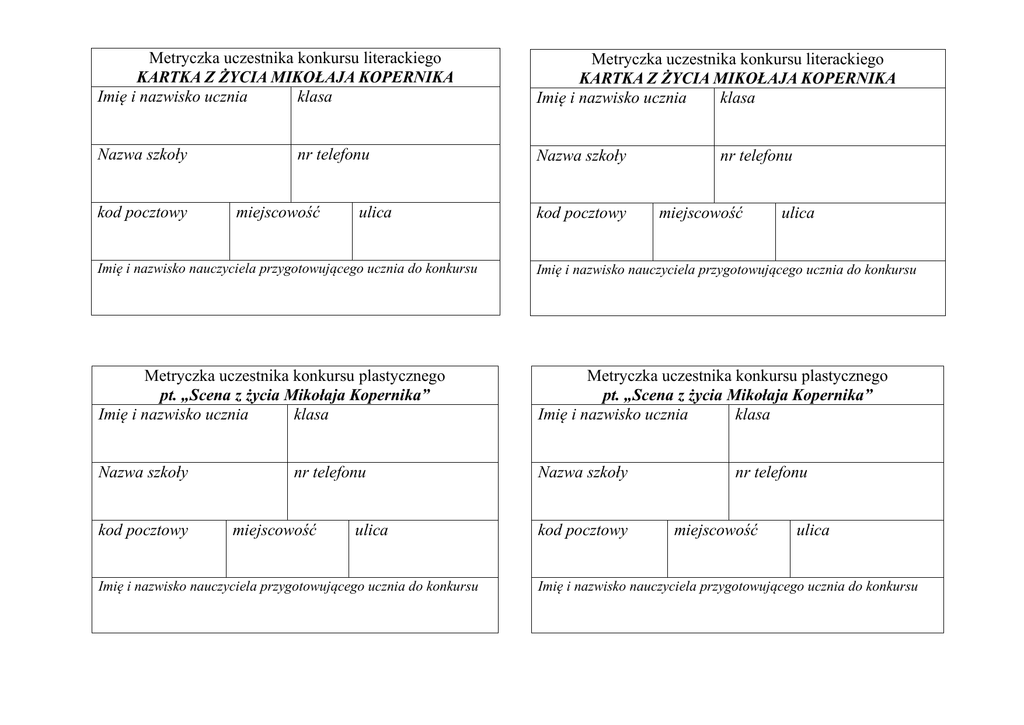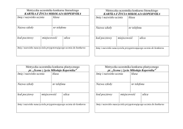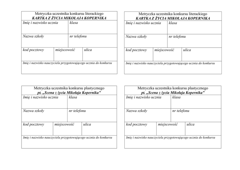 Metryczka uczestnika konkursu literackiego KARTKA Z ŻYCIA MIKOŁAJA KOPERNIKA Imię i nazwisko ucznia klasa Metryczka uczestnika konkursu literackiego KARTKA Z ŻYCIA MIKOŁAJA KOPERNIKA Imię i nazwisko ucznia klasa Nazwa szkoły Nazwa szkoły kod pocztowy nr telefonu miejscowość ulica kod pocztowy nr telefonu miejscowość ulica Imię i nazwisko nauczyciela przygotowującego ucznia do konkursu Imię i nazwisko nauczyciela przygotowującego ucznia do konkursu Metryczka uczestnika konkursu plastycznego pt. „Scena z życia Mikołaja Kopernika” Imię i nazwisko ucznia klasa Metryczka uczestnika konkursu plastycznego pt. „Scena z życia Mikołaja Kopernika” Imię i nazwisko ucznia klasa Nazwa szkoły Nazwa szkoły kod pocztowy nr telefonu miejscowość ulica Imię i nazwisko nauczyciela przygotowującego ucznia do konkursu kod pocztowy nr telefonu miejscowość ulica Imię i nazwisko nauczyciela przygotowującego ucznia do konkursu