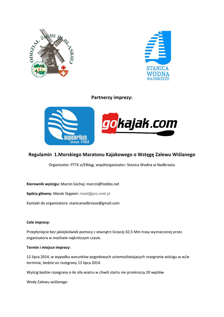 Partnerzy imprezy: Regulamin 1.Morskiego Maratonu Kajakowego o Wstęgę Zalewu Wiślanego Organizator: PTTK o/Elbląg, współorganizator: Stanica Wodna w Nadbrzeżu Kierownik wyścigu: Marcin Sochaj: [email protected] Sędzia główny: Marek Stępieo: [email protected] Kontakt do organizatora: [email protected] Cele imprezy: Przepłynięcie bez jakiejkolwiek pomocy z zewnątrz liczacej 42,5 Mm trasy wyznaczonej przez organizatora w możliwie najkrótszym czasie. Termin i miejsce imprezy: 12 lipca 2014, w wypadku warunków pogodowych uniemozliwiajacych rozegranie wiścigu w w/w terminie, bedzie on rozegrany 13 lipca 2014. Wyścig bedzie rozegrany o ile siła wiatru w chwili startu nie przekroczy 20 węzłów Wody Zalewu wiślanego Start: Na godzinę przed startem odbędzie się obowiązkowa dla wszystkich zawodników inspekcja sprzętu. Zawodnik, który nie przeszedł inspekcji technicznej przez sędziego głównego, nie zostanie dopuszczony do startu. Odbędzie się 12 lipca 2014 o godzinie 0800 w porcie w Nadbrzeżu. Linię startu wyznaczaja słupki z chorągiewkami po obu stronach kanału portowego. Na linię startu mozna wpłynad dopiero po sygnale startu. Kajaki które wpłynęły na nią wcześniej (popełniły falstart) muszą sie wycofad poza linię startu i ponownie na nią wpłynad po sygnale startu. Sygnały startowe: 5minut do startu – sygnał dźwiękowy (buczek) 1minuta do startu – sygnał dzwiękowy (gong) Start – sygnał dźwiękowy (buczek) Trasa: Wiedzie dookoła Zalewu Wiślanego i wymaga ominięcia lewą burtą następujących znaków kursowych: Pława „3” toru podejsciowego do Tolkmicka. Pława „3/F” toru podejsciowego do Fromborka . Pława „3” toru podejściowego do Nowej Pasłęki Pława „3” toru podejsciowego do Piasków Pława „KM-E” przy torze podejsciowym do Krynicy Morskiej Pława „K-4” toru podejściowego do Kątów Rybackich Meta: Linia mety jest taka sama jak linia startu. Linia mety zostanie zamknieta po upływie czasu równego dwukrotnemu czasowi pierwszego na mecie. płynięcia 1. ZGŁOSZENIA: Zgłoszenia można przesyład pocztą elektroniczną na adres: [email protected] W ramach zgłoszenia należy: podad dane osobowe (imię i nazwisko, adres, PESEL oraz numer telefonu jaki będzie używany przez uczestnika podczas imprezy) wpłacid kwotę wpisowego: 50 PLN bezpośrednio przed zawodami Dokonanie opłaty wpisowej w wymaganym terminie jest warunkiem niezbędnym do przyjęcia zgłoszenia. Termin zgłoszeo: do 12 lipca 2014 2. WARUNKI UCZESTNICTWA: 2.1. W imprezie mogą wziąd udział tylko osoby pełnoletnie, posiadające umiejętnośd pływania wpław i doświadczenie w uprawianiu kajakarstwa morskiego. 2.2. Zgłoszenie uczestnictwa w określonym przez Organizatora terminie oraz opłacenie wpisowego. 2.3. Uczestnicy mogą startowad w jednej z kategorii: K1K, K1M, K2K, K2M, K2Mix. Warunkiem klasyfikowania kategorii jest start co najmniej 3 osad. W wypadku braku wymaganego minimum uczestnicy będą klasyfikowani w klasyfikacji generalnej. 3. SPRZĘT: 3.1. Kajak morski. Za kajak morski uważa się kajak dowolnej konstrukcji wyposażony w: kokpit z fartuchem, dwie niezależne stałe komory wypornościowe, olinowanie pokładu składajace sie co najmniej z linki biegnacej dookoła pokładu i kooczącej sie nie dalej niż 50cm od dziobu i rufy. Do wyścigu dopuszcza się kajaki surf ski lub sit on top, o ile jest on wyposażony w smycz, którą kajakarz ma na stałe przyczepioną do ciała 3.2. Obowiazkowy sprzęt dodatkowy Kamizelka asekuracyjna lub ratunkowa którą kajakarz musi cały czas mied na sobie. Sprzet do wzywania pomocy. Jeden z: wodoodporne UKF działające na zakresach morskich, wodoodporny (lub zabezpieczony tak by umożliwiał rozmowę podczas pływania wpław) telefon komórkowy z szybkim wybieraniem telefonów stacji SAR Tolkmicko i organizatora, PLB, SPOT, lub inny który kierownik wyścigu uzna za wystarczający. Kompas lub busola Odpowiedni strój. Ze względu na rozległośd akwenu uczestnik musi byd przygotowany na spędzenie w wodze 1h od momentu wezwania pomocy. Czołówka (latarka) wraz z zapasowymi bateriami Każdy zawodnik ma obowiązek mied na kamizelce koszulkę dostarczoną przez organizatora, na której będzie numer startowy 4. Przerwanie płynięcia: Uczestnik który zrezygnował z udziału w wyścigu musi niezwłocznie skontaktowad sie z organizatorem i poinformowad go oswoich zamiarach co do celu płyniecia. W wypadku zakooczenia płynięcia w miejscu innym niż Stanica Wodna w Nadbrzeżu uczestnik musi samodzielnie zapewnid sobie transport do bazy. 5. DYSKWALIFIKACJA Uczestnik zostanie zdyskwalifikowany za: Korzystanie z jakiejkolwiek pomocy osób nie startujacych w wyścigu Umyślne lub przypadkowe skrócenie trasy, Używanie nieregulaminowego (niesprawnego) kajaka, Niekompletny sprzęt obowiązkowy, Spożywanie alkoholu na trasie. 6. PROTESTY Protest może składad tylko uczestnik który ukooczył wyscig. Protest należy zgłosic podczas przekraczania lini mety. Protesty będa rozpatrywane w godzinę po zamknieciu lini mety. 7. ŚWIADCZENIA ORGANIZATORA: W ramach wpisowego uczestnik otrzymuje: ubezpieczenie, mapę trasy miejsce na polu namiotowym ciepły posiłek pamiątkową koszulkę – numer startowy możliwe jest zakwaterowanie w domkach Stanicy Wodnej w Nadbrzeżu według cennika Stanicy – wymagana wcześniejsza rezerwacja miejsc w ramach zakwaterowania w Stanicy Wodnej w Nadbrzeżu: korzystanie ze wspólnej kuchni, parkingu, WC i pryszniców jest bezpłatne 8. NAGRODY Przewidziane są nagrody dla pierwszych trzech zawodników w każdej z klasyfikowanej kategorii oraz w kategorii generalnej. Po zakooczeniu zawodów przewidziane jest także losowanie nagród wśród zawodników, którzy zakooczyli zawody w regulaminowym czasie. Rozdanie nagród nastąpi po zamknięciu linii mety.
