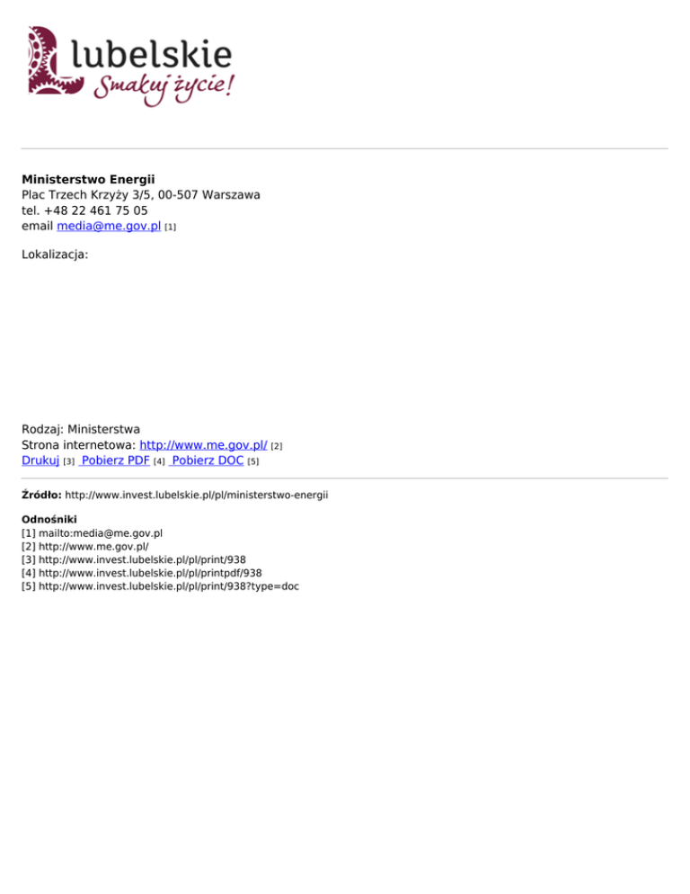 Ministerstwo Energii Plac Trzech Krzyży 3/5, 00-507 Warszawa tel. +48 22 461 75 05 email [email protected] [1] Lokalizacja: Rodzaj: Ministerstwa Strona internetowa: http://www.me.gov.pl/ [2] Drukuj [3] Pobierz PDF [4] Pobierz DOC [5] Źródło: http://www.invest.lubelskie.pl/pl/ministerstwo-energii Odnośniki [1] mailto:[email protected] [2] http://www.me.gov.pl/ [3] http://www.invest.lubelskie.pl/pl/print/938 [4] http://www.invest.lubelskie.pl/pl/printpdf/938 [5] http://www.invest.lubelskie.pl/pl/print/938?type=doc
