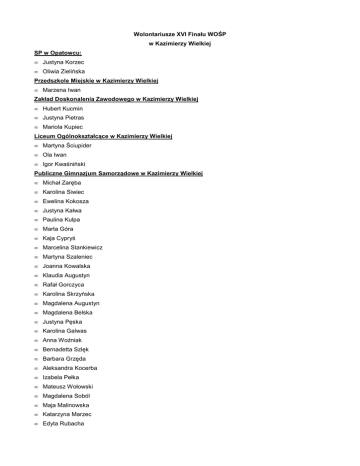 Wolontariusze XVI Finału WOŚP w Kazimierzy Wielkiej SP w Opatowcu: • Justyna Korzec • Oliwia Zielińska Przedszkole Miejskie w Kazimierzy Wielkiej • Marzena Iwan Zakład Doskonalenia Zawodowego w Kazimierzy Wielkiej • Hubert Kucmin • Justyna Pietras • Mariola Kupiec Liceum Ogólnokształcące w Kazimierzy Wielkiej • Martyna Ściupider • Ola Iwan • Igor Kwaśniński Publiczne Gimnazjum Samorządowe w Kazimierzy Wielkiej • Michał Zaręba • Karolina Siwiec • Ewelina Kokosza • Justyna Kałwa • Paulina Kulpa • Marta Góra • Kaja Cypryś • Marcelina Stankiewicz • Martyna Szaleniec • Joanna Kowalska • Klaudia Augustyn • Rafał Gorczyca • Karolina Skrzyńska • Magdalena Augustyn • Magdalena Belska • Justyna Pęska • Karolina Galwas • Anna Woźniak • Bernadetta Szlęk • Barbara Grzęda • Aleksandra Kocerba • Izabela Pełka • Mateusz Wołowski • Magdalena Soból • Maja Malinowska • Katarzyna Marzec • Edyta Rubacha • Patrycja Kurek • Angelika Stępień • Karina Grudzień • Anna Wróblewska • Sławomir Kita • Paulina Węglowska • Karolina śarnowiec • Katarzyna Kowalska • Karolina Gałęziowska • Joanna Pawlik • Dominika Kusak • Karolina Chmura • Rafał Kabat Samorządowa Szkoła Podstawowa Nr 1 w Kazimierzy Wielkiej • Kinga Mucha • Martyna Wąs • Joanna Kolanoś Samorządowa Szkoła Podstawowa w Cudzynowicach • Agnieszka Sobieraj • Angelika Wiejacha Samorządowa Szkoła Podstawowa w Sieradzicach • Mateusz Ciepły • Natalia Ziółek • Justyna Słupik • Adrian Magnes Samorządowa Szkoła Podstawowa w Zięblicach • Paulina Bomba • Anna Kwiecień Zespół Szkół Zawodowych w Odonowie • Dawid Jagielnik • Urszula Zapart • Katarzyna Rutkowska Publiczne Gimnazjum w CzyŜowicach • Kinga Dąbrowska • Paulina Kułaga • Hanna Miałkowska Zespół Szkół Samorządowych w Wielgusie • Paweł Klimek • Katarzyna Marasek • Sylwia Nawrot • Monika Wiśniewska • Dominika Gryszówka Samorządowa Szkoła Podstawowa w Gorzkowie • Bartosz Cham • Aleksandra Dziula • Aleksandra Stachura • Katarzyna Grzywna Samorządowa Szkoła Podstawowa w Kamieńczycach • Rafał Mikina • Marta Wąs • Kamila Chuchmacz Liczba wolontariuszy: 78