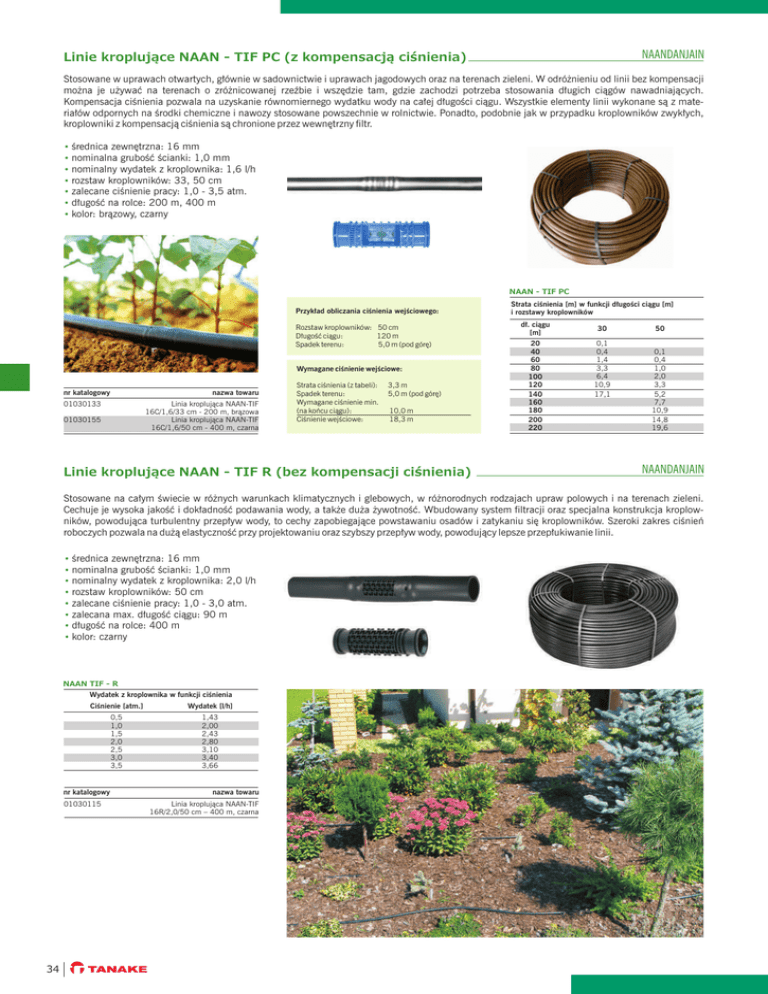 NAANDANJAIN Linie kroplujące NAAN - TIF PC (z kompensacją ciśnienia) Stosowane w uprawach otwartych, głównie w sadownictwie i uprawach jagodowych oraz na terenach zieleni. W odróżnieniu od linii bez kompensacji można je używać na terenach o zróżnicowanej rzeźbie i wszędzie tam, gdzie zachodzi potrzeba stosowania długich ciągów nawadniających. Kompensacja ciśnienia pozwala na uzyskanie równomiernego wydatku wody na całej długości ciągu. Wszystkie elementy linii wykonane są z materiałów odpornych na środki chemiczne i nawozy stosowane powszechnie w rolnictwie. Ponadto, podobnie jak w przypadku kroplowników zwykłych, kroplowniki z kompensacją ciśnienia są chronione przez wewnętrzny filtr. • średnica zewnętrzna: 16 mm • nominalna grubość ścianki: 1,0 mm • nominalny wydatek z kroplownika: 1,6 l/h • rozstaw kroplowników: 33, 50 cm • zalecane ciśnienie pracy: 1,0 - 3,5 atm. • długość na rolce: 200 m, 400 m • kolor: brązowy, czarny NAAN - TIF PC Przykład obliczania ciśnienia wejściowego: Rozstaw kroplowników: 50 cm Długość ciągu: 120 m Spadek terenu: 5,0 m (pod górę) Wymagane ciśnienie wejściowe: nr katalogowy nazwa towaru Linia kroplująca NAAN-TIF 16C/1,6/33 cm - 200 m, brązowa Linia kroplująca NAAN-TIF 16C/1,6/50 cm - 400 m, czarna 01030133 01030155 Strata ciśnienia (z tabeli): Spadek terenu: Wymagane ciśnienie min. (na końcu ciągu): Ciśnienie wejściowe: 3,3 m 5,0 m (pod górę) 10,0 m 18,3 m Linie kroplujące NAAN - TIF R (bez kompensacji ciśnienia) Strata ciśnienia [m] w funkcji długości ciągu [m] i rozstawy kroplowników dł. ciągu [m] 20 40 60 80 100 120 140 160 180 200 220 30 0,1 0,4 1,4 3,3 6,4 10,9 17,1 50 0,1 0,4 1,0 2,0 3,3 5,2 7,7 10,9 14,8 19,6 NAANDANJAIN Stosowane na całym świecie w różnych warunkach klimatycznych i glebowych, w różnorodnych rodzajach upraw polowych i na terenach zieleni. Cechuje je wysoka jakość i dokładność podawania wody, a także duża żywotność. Wbudowany system filtracji oraz specjalna konstrukcja kroplowników, powodująca turbulentny przepływ wody, to cechy zapobiegające powstawaniu osadów i zatykaniu się kroplowników. Szeroki zakres ciśnień roboczych pozwala na dużą elastyczność przy projektowaniu oraz szybszy przepływ wody, powodujący lepsze przepłukiwanie linii. • średnica zewnętrzna: 16 mm • nominalna grubość ścianki: 1,0 mm • nominalny wydatek z kroplownika: 2,0 l/h • rozstaw kroplowników: 50 cm • zalecane ciśnienie pracy: 1,0 - 3,0 atm. • zalecana max. długość ciągu: 90 m • długość na rolce: 400 m • kolor: czarny NAAN TIF - R Wydatek z kroplownika w funkcji ciśnienia Ciśnienie [atm.] Wydatek [l/h] 0,5 1,0 1,5 2,0 2,5 3,0 3,5 1,43 2,00 2,43 2,80 3,10 3,40 3,66 nr katalogowy 01030115 34 nazwa towaru Linia kroplująca NAAN-TIF 16R/2,0/50 cm – 400 m, czarna IRRITEC Linie kroplujące JUNIOR 44 (bez kompensacji ciśnienia) Linia kroplująca JUNIOR może być stosowana w różnorodnych uprawach, jednak ze względu na kolor brązowy najczęściej stosowana jest na terenach zieleni. Linia jest bardzo odporna na obciążenia mechaniczne i wpływ warunków termicznych, zachowując przy tym niezmienność parametrów. Najważniejszym elementem linii jest kroplownik, który kontroluje wydatek wody. Technologia zastosowana w procesie projektowani i produkcji pozwoliła uzyskać kroplownik z doskonałą charakterystyką hydrauliczną umożliwiający stosowanie dłuższych ciągów nawadniających z wysoką równomiernością nawadniania. • średnica zewnętrzna: 16 mm • nominalna grubość ścianki: 1,1 mm • nominalny wydatek z kroplownika: 2,1 l/h • rozstaw kroplowników: 33 cm • zalecane ciśnienie pracy: 1,0 - 3,0 atm. • zalecana max. długość ciągu: 95 m • długość na rolce: 100 m, 400 m • kolor: brązowy nr katalogowy 01030600 01030601 JUNIOR 44 Wydatek z kroplownika w funkcji ciśnienia nazwa towaru Linia kroplująca JUNIOR 44 16R/2,1/33 cm - 100 m, brązowa Linia kroplująca JUNIOR 44 16R/2,1/33 cm - 400 m , brązowa Ciśnienie [atm.] Wydatek [l/h] 0,5 1,0 1,5 2,0 2,5 3,0 1,42 1,98 2,47 2,99 3,30 3,63 AKCESORIA Złączki wciskane serii XFF Złączki wciskane do rur i linii kroplujących o średnicy zewnętrznej 17 mm. Przeznaczone do stosowania z liniami kroplującymi serii XF RAIN BIRD. Zakres ciśnienia roboczego 0 – 3,5 atm. nr katalogowy 01051811 01051812 01051813 01051814 01051815 01051816 01051817 nazwa towaru Przelot XFF 17 – 17 Kolano XFF 17 – 17 Trójnik XFF 17 – 17 – 17 Przelot XFF 17 – 1/2" M Przelot XFF 17 – 3/4" M Trójnik XFF 17 – 1/2" M - 17 Klucz montażowy do złączek XFF Opaski zaciskowe do złączek wciskanych Opaska zaciskowa do montażu złączek wciskanych na przewodach PE o średnicy zewnętrznej 13 – 16 mm. nr katalogowy 01051516 nazwa towaru Opaska zaciskowa 13 - 16 mm Szpilki mocujące do linii kroplujących PALAPLAST Plastikowe szpilki mocujące linie kroplujące i rury PE Ø16 i 20 mm do podłoża. nr katalogowy 01100103 01100102 nazwa towaru Szpilka mocująca 16 mm brązowa Szpilka mocująca 16 - 20 mm czarna 35