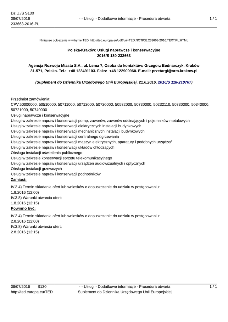 Dz.U./S S130 08/07/2016 233663-2016-PL - - Usługi - Dodatkowe informacje - Procedura otwarta 1/1 Niniejsze ogłoszenie w witrynie TED: http://ted.europa.eu/udl?uri=TED:NOTICE:233663-2016:TEXT:PL:HTML Polska-Kraków: Usługi naprawcze i konserwacyjne 2016/S 130-233663 Agencja Rozwoju Miasta S.A., ul. Lema 7, Osoba do kontaktów: Grzegorz Bednarczyk, Kraków 31-571, Polska. Tel.: +48 123491103. Faks: +48 122909960. E-mail: [email protected] (Suplement do Dziennika Urzędowego Unii Europejskiej, 21.6.2016, 2016/S 118-210767) Przedmiot zamówienia: CPV:50000000, 50510000, 50711000, 50712000, 50720000, 50532000, 50730000, 50232110, 50330000, 50340000, 50721000, 50740000 Usługi naprawcze i konserwacyjne Usługi w zakresie napraw i konserwacji pomp, zaworów, zaworów odcinających i pojemników metalowych Usługi w zakresie napraw i konserwacji elektrycznych instalacji budynkowych Usługi w zakresie napraw i konserwacji mechanicznych instalacji budynkowych Usługi w zakresie napraw i konserwacji centralnego ogrzewania Usługi w zakresie napraw i konserwacji maszyn elektrycznych, aparatury i podobnych urządzeń Usługi w zakresie napraw i konserwacji układów chłodzących Obsługa instalacji oświetlenia publicznego Usługi w zakresie konserwacji sprzętu telekomunikacyjnego Usługi w zakresie napraw i konserwacji urządzeń audiowizualnych i optycznych Obsługa instalacji grzewczych Usługi w zakresie napraw i konserwacji podnośników Zamiast: IV.3.4) Termin składania ofert lub wniosków o dopuszczenie do udziału w postępowaniu: 1.8.2016 (12:00) IV.3.8) Warunki otwarcia ofert: 1.8.2016 (12:15) Powinno być: IV.3.4) Termin składania ofert lub wniosków o dopuszczenie do udziału w postępowaniu: 2.8.2016 (12:00) IV.3.8) Warunki otwarcia ofert: 2.8.2016 (12:15) 08/07/2016 S130 http://ted.europa.eu/TED - - Usługi - Dodatkowe informacje - Procedura otwarta Suplement do Dziennika Urzędowego Unii Europejskiej 1/1