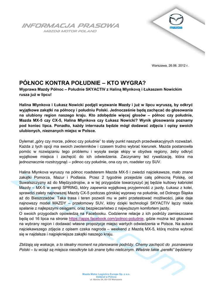 Warszawa, 26.06. 2012 r. PÓ&NOC KONTRA PO&UDNIE – KTO WYGRA? Wyprawa Mazdy Pó noc – Po udnie SKYACTIV z Halin8 Mlynkov8 i &ukaszem Nowickim rusza ju w lipcu! Halina Mlynkova i &ukasz Nowicki podj=li wyzwanie Mazdy i ju w lipcu wyrusz8, by odkry? wyj8tkowe zak8tki na pó nocy i po udniu Polski. JednoczeAnie b=d8 zach=ca? do g osowania na ulubiony region naszego kraju. Kto zdob=dzie wi=cej g osów – pó noc czy po udnie, Mazda MX-5 czy CX-5, Halina Mlynkova czy &ukasz Nowicki? Wynik g osowania poznamy pod koniec lipca. Ponadto, ka dy internauta b=dzie móg dodawa? zdj=cia i opisy swoich ulubionych, nieznanych miejsc w Polsce. Dylemat „góry czy morze, pó noc czy po udnie” to sta y punkt naszych przedwakacyjnych rozwa#a$. Ka#da z tych opcji ma swoich zwolenników i czasem trudno wybra' kierunek. Mazda postanowi a pomóc w rozwi)zaniu tego problemu i wysy a swoje ekipy w obydwa regiony, #eby odkry' wyj)tkowe miejsca i zach*ci' do ich odwiedzenia. Zaczynamy te# rywalizacj*, która ma jednoznacznie rozstrzygn)' – pó noc czy po udnie, ona czy on, roadster czy SUV. Halina Mlynkova wyruszy na pó noc roadsterem Mazda MX-5 i zwiedzi najciekawsze, ma o znane zak)tki Pomorza, Mazur i Podlasia. Przez 2 tygodnie przejedzie ca ) pó nocn) Polsk*, od Suwalszczyzny a# do Mi*dzyzdrojów, a w tej przygodzie towarzyszy' jej b*dzie kultowy kabriolet Mazdy – MX-5 w wersji SPRING, który zapewnia wyj)tkow) przyjemno:' z jazdy. ;ukasz z kolei, sprawdzi zalety najnowszej Mazdy CX-5 podczas górskiej wyprawy na po udnie, od Dolnego =l)ska a# do Bieszczadów. Taka trasa i teren pozwoli mu w pe ni przetestowa' mo#liwo:ci, jakie daje najnowszy model MAZDY – prze omowy SUV, który dzi*ki technologii SKYACTIV )czy niskie spalanie z najlepszymi osi)gami, oraz bezpiecze$stwo z najwy#szym komfortem jazdy. O swoich przygodach opowiedz) na Facebooku. Codzienne relacje z ich podró#y zamieszczane b*d) od 16 lipca na stronie https://apps.facebook.com/polnoc-poludnie, gdzie mo#na te# g osowa' na wybrany region i dodawa' w asne propozycje miejsc wartych odwiedzenia w Polsce. Na autora najciekawszego zdj*cia z opisem czeka nagroda – weekend z Mazd) MX-5, któr) mo#na wybra' si* w najdalsze i najpi*kniejsze zak)tki naszego kraju. Zbli aj si wakacje, a to idealny moment na planowanie podró y. Chemy zach ci do poznawania Polski – tu wci s miejsca nieodkryte lub znane tylko nielicznym. W#a$nie takie „pere#ki” b dziemy Mazda Motor Logistics Europe Sp. z o.o. Oddzia w Polsce ul. I ecka 24, 02-135 Warszawa promowa . Liczymy, e wiele osób w# czy si do akcji, prezentuj c wyj tkowe miejsca. Jednocze$nie sprawdzimy dwa modele Mazdy – Mazd MX-5 i CX-5, ich niezawodno$ i funkcjonalno$ w czasie wyjazdów. Zupe#nie ró ne samochody, ka dy spe#niaj cy wymagania regionu, w którym b dzie testowany – wybrze e zach ca do podró y roadsterem, góry wysoko postawi poprzeczk SUV-owi. Zapraszamy wszystkich do $ledzenia wyprawy i wspólnej zabawy powiedzia a Magdalena W*glewska, Dyrektor PR Mazda Motor Poland. ;ukasz Nowicki z kolei tak opowiedzia o swoim udziale w Wyprawie Pó noc-Po udnie SKYACTIV: Od lat jestem zapalonym podró nikiem, Afryka, Azja by#y celami moich najciekawszych wypraw. A wreszcie kto$ mi przypomnia# has#o - cudze chwalicie, swego nie znacie - i pomy$la#em, e nie musz jecha tak daleko, skoro w moim kraju s miejsca, które naprawd warto zobaczy i które sta si mog nasz wizytówk na $wiecie i powodem do dumy. Przeszed#em wszystkie polskie góry i wiem, e po#udniowe rejony to co$ dla m czyzny - miejsce, w którym mo na prze y niezapomnian przygod ”. Do tego przetestuj mo liwo$ci nowej Mazdy CX-5 – jestem bardzo ciekawy tego modelu. Halina Mlynkowa podkre:la: Mieszkam w Polsce od 13 lat i zda#am sobie spraw jak ma#o ci gle o niej wiem, jak ma#o miejsc uda#o mi si zobaczy , mimo e gra#am koncerty prawie wsz dzie. Wybra#am pó#noc, bo jako Czeszka z pochodzenia zawsze t skni#am za morzem i klimatem, który kojarzy mi si z filmami drogi, które uwielbiam – tylko kabriolet, ja i wiatr we w#osach. Wyprawa Pó noc-Po udnie SKYACTIV rusza ju# 16 lipca. Po dwóch tygodniach b*dzie wiadomo, która wyprawa zyska wi*cej zwolenników– Halina przemierzaj)ca kabrioletem pó noc Polski, czy ;ukasz w CX-5 podbijaj)cy góry na Po udniu. SprawdGmy, gdzie Polacy chc) sp*dza' swoje wakacje i czy znaj) miejsca, które poka#emy. Wi*cej informacji od 16 lipca na stronie: https://apps.facebook.com/polnoc-poludnie ### Kontakt: MAZDA MOTOR POLAND Magdalena W*glewska Tel. +48 606 600 260 e-mail: [email protected], strona prasowa: www.mazda-press.pl Mazda Motor Logistics Europe Sp. z o.o. Oddzia w Polsce ul. I ecka 24, 02-135 Warszawa