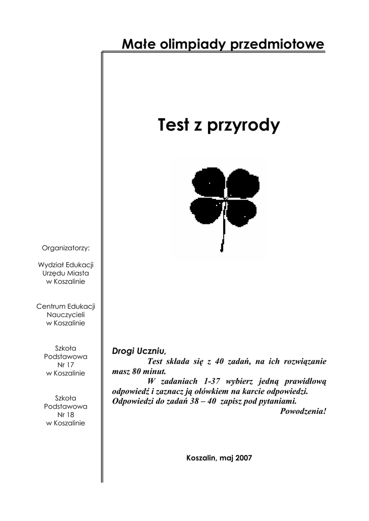 Małe olimpiady przedmiotowe Test z przyrody Organizatorzy: Wydział Edukacji Urzędu Miasta w Koszalinie Centrum Edukacji Nauczycieli w Koszalinie Szkoła Podstawowa Nr 17 w Koszalinie Szkoła Podstawowa Nr 18 w Koszalinie Drogi Uczniu, Test składa się z 40 zadań, na ich rozwiązanie masz 80 minut. W zadaniach 1-37 wybierz jedną prawidłową odpowiedź i zaznacz ją ołówkiem na karcie odpowiedzi. Odpowiedzi do zadań 38 – 40 zapisz pod pytaniami. Powodzenia! Koszalin, maj 2007 1.”Pustyniami porostowymi” nazywamy: A) miejsca w bardzo duŜym stopniu zanieczyszczone CO2 i pyłami B) obszary w znacznym stopniu zanieczyszczone SO2 C) obszary w niewielkim stopniu zanieczyszczone SO2 D) miejsca bardzo zapylone 2. Jak przebiega rozwój jedwabnika morwowego? A) jajo, poczwarka, postać dorosła B) jajo, gąsienica, poczwarka, postać dorosła C) gąsienica, pędrak, postać dorosła D) jajo, pędrak, imago, poczwarka 3. Co nazywamy gejzerem? A) basen z gorącą wodą. B) ciepłe źródło siarkowe. C) studnię artezyjską D) źródło gorącej wody wytryskującej z ziemi 4. Jeśli w uŜywanym przez ciebie mikroskopie powiększenie obiektywu wynosi 20x, a okularu 10x, to obserwowany obiekt będzie powiększony: A) 30x B) 20x C) 200x D) 10x 5. Nad Zwrotnikiem KozioroŜca Słońce góruje w zenicie: A) 22 grudnia B) 22 czerwca C) 23 września D) 21 marca 6. Która z wymienionych niŜej cech nie przystosowuje Ŝaby do Ŝycia na lądzie? A) oczy pokryte powiekami B) płuca jako narząd oddechowy C) błony pomiędzy palcami kończyn D) śluz na skórze zabezpieczający przed wyschnięciem 7. Który z opisów krain geograficznych Polski nie jest poprawny? A) Krajobraz krasowy występuje na Nizinie Mazowieckiej. B) Nizina Śląska jest krainą o bardzo korzystnych warunkach rozwoju rolnictwa. C) Pojezierze Mazurskie to region typowo turystyczny. D) Polesie Lubelskie i Nizina Podlaska to krainy najsłabiej rozwinięte gospodarczo. 2 8. Które z wymienionych zwierząt zaliczamy do stałocieplnych? A) ropucha szara B) jaszczurka zwinka C) szczupak D) kaczka lodówka 9. Na mapach fizycznych przedstawiających morza lub oceany zamknięte linie łączące punkty o tej samej głębokości to: A) poziomice B) izobaty C) izohiety D) izobary 10. Jak nazywamy obfite w wodę źródło krasowe wypływające ze skał wapiennych? A) potok B) wywierzysko C) siklawa D) strumień 11. Gdzie dokonuje się analiza wzrokowa widzianego przedmiotu? A) w soczewce oka B) w nerwie wzrokowym C) w płacie potylicznym mózgu D) w siatkówce oka 12. Kogo w przyrodzie określa się mianem obojnaka? A) organizm bezpłciowy B) organizm jednopłciowy C) organizm rozdzielnopłciowy D) organizm obupłciowy 13. Komórka zwierzęca róŜni sie od komórki roślinnej tym, Ŝe nie posiada: A) chloroplastów i cytoplazmy B) ściany komórkowej i cytoplazmy C) błony komórkowej i jądra komórkowego D) ściany komórkowej i chloroplastów 14. Cząsteczka wody składa się z: A) kilku atomów tlenu B) 2 atomów tlenu i 1 atomu wodoru C) 2 atomów tlenu i 2 atomów wodoru D) 1 atomu tlenu i 2 atomów wodoru 3 15. Wyobraź sobie, Ŝe stoją przed tobą dwie nieopisane probówki. W jednej z nich znajduje się tlen, a w drugiej dwutlenek węgla. Co stanie się z zapaloną zapałką, jeśli włoŜymy ją do probówek? A) w probówce z tlenem zapałka będzie się palić, a w probówce z dwutlenkiem węgla zgaśnie B) w probówce z tlenem zapałka zgaśnie, a w probówce z dwutlenkiem węgla będzie się palić C) w obu probówkach tak samo szybko zapałka zgaśnie D) w obu probówkach będzie się tak samo długo palić 16. Od 2006 roku jedno z ciał niebieskich w Układzie Słonecznym przestało być zaliczane do planet. Jest to: A) Merkury B) Pluton C) Uran D) Saturn 17. Który zestaw prawidłowo przyporządkowuje elementy kwiatu oznaczone na rysunku cyframi? A) 1-słupek, 2-pręciki, 3-płatki korony, 4-działki kielicha B) 1-słupek, 2-działki kielicha, 3-płatki korony, 4-dno kwiatowe C) 1-pręcik, 2-działki kielicha, 3-płatki korony, 4-dno kwiatowe D) 1-dno kwiatowe, 2-pręciki, 3-płatki korony, 4-działki kielicha Mapa do zadań 18-20 4 18. W jakim pasie leŜy miejscowość oznaczona na mapce literą D? A) pasie pojezierzy B) pasie kotlin podkarpackich C) pasie nizin środkowopolskich D) pasie wyŜyn 19. Grupa dzieci z miejscowości oznaczonej literą D na mapie wybiera się na wycieczkę do Szczecina. W jakim kierunku się udadzą. A) na południowy-wschód B) na północny-zachód C) na północny-wschód D) na południe 20. Jakiej odległości w rzeczywistości odpowiada odcinek o długości 2 cm na powyŜszej mapce? A) 2000 km B) 2000 m C) 200 km D) 20 km 21. Który szereg zawiera wyłącznie zwierzęta latające? A) niedźwiedź, dzięcioł, bóbr, kos B) waŜka, sroka, nietoperz, motyl C) papuga, struś, fenek, gawron D) kojot, orzeł, fenek, kangur 22. Którego z podanych miejsc moŜe dotyczyć przedstawiony wykres klimatyczny? A) Alaski B) Niziny Amazonki C) Sahary D) Antarktydy 23. Którego sposobu nie zastosujesz, jeśli chcesz przyspieszyć rozpuszczanie cukru w wodzie? A) podgrzania wody przed wsypaniem do niej cukru B) ochłodzenia wody z cukrem np. przez wstawienie jej do lodówki C) mieszania łyŜeczką wody z cukrem D) rozdrobnienia cukru przed wsypaniem go do wody 5 24. W Polsce spotyka się rośliny zimozielone, które przez cały rok zachowują Ŝywe liście. Który z wymienionych gatunków zalicza się do takich roślin? A) jesion B) modrzew C) wiąz D) cis 25. W Australii rozpoczyna sie zima, gdy w Polsce rozpoczyna się: A) lato B) zima C) wiosna D) jesień 26. Który zestaw zawiera wyłącznie elementy krajobrazu krasowego? A) pagórki, jeziora rynnowe, bagna i torfowiska B) wąwozy lessowe, czarnoziemy, skały wapienne C) granie, piargi, turnie D) jaskinie, stalaktyty, wywierzyska 27.WskaŜ błędne stwierdzenie. A) Oleje wytwarza się między innymi z nasion słonecznika i rzepaku. B) Bawełna i wełna