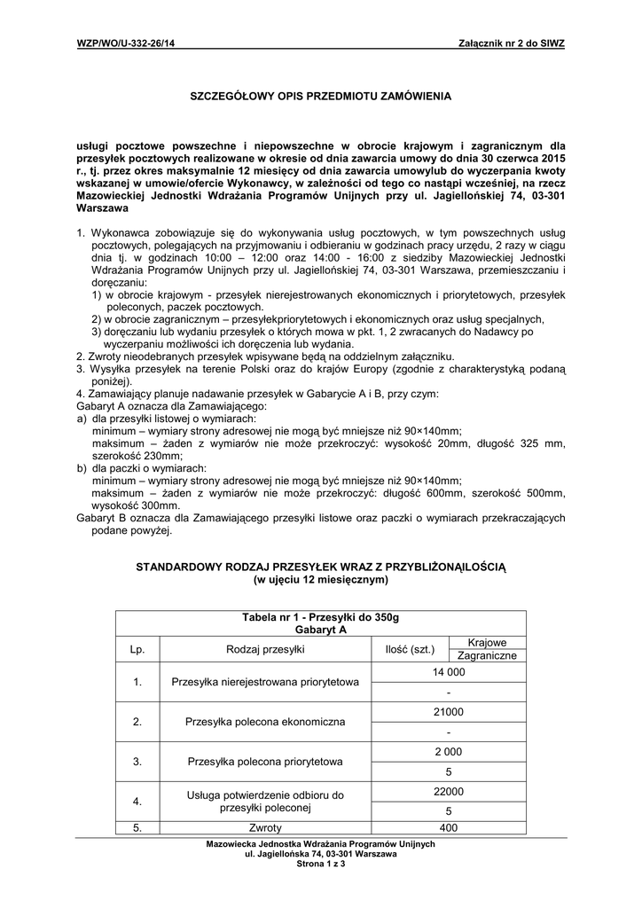 WZP/WO/U-332-26/14 Załącznik nr 2 do SIWZ SZCZEGÓŁOWY OPIS PRZEDMIOTU ZAMÓWIENIA usługi pocztowe powszechne i niepowszechne w obrocie krajowym i zagranicznym dla przesyłek pocztowych realizowane w okresie od dnia zawarcia umowy do dnia 30 czerwca 2015 r., tj. przez okres maksymalnie 12 miesięcy od dnia zawarcia umowylub do wyczerpania kwoty wskazanej w umowie/ofercie Wykonawcy, w zależności od tego co nastąpi wcześniej, na rzecz Mazowieckiej Jednostki Wdrażania Programów Unijnych przy ul. Jagiellońskiej 74, 03-301 Warszawa 1. Wykonawca zobowiązuje się do wykonywania usług pocztowych, w tym powszechnych usług pocztowych, polegających na przyjmowaniu i odbieraniu w godzinach pracy urzędu, 2 razy w ciągu dnia tj. w godzinach 10:00 – 12:00 oraz 14:00 - 16:00 z siedziby Mazowieckiej Jednostki Wdrażania Programów Unijnych przy ul. Jagiellońskiej 74, 03-301 Warszawa, przemieszczaniu i doręczaniu: 1) w obrocie krajowym - przesyłek nierejestrowanych ekonomicznych i priorytetowych, przesyłek poleconych, paczek pocztowych. 2) w obrocie zagranicznym – przesyłekpriorytetowych i ekonomicznych oraz usług specjalnych, 3) doręczaniu lub wydaniu przesyłek o których mowa w pkt. 1, 2 zwracanych do Nadawcy po wyczerpaniu możliwości ich doręczenia lub wydania. 2. Zwroty nieodebranych przesyłek wpisywane będą na oddzielnym załączniku. 3. Wysyłka przesyłek na terenie Polski oraz do krajów Europy (zgodnie z charakterystyką podaną poniżej). 4. Zamawiający planuje nadawanie przesyłek w Gabarycie A i B, przy czym: Gabaryt A oznacza dla Zamawiającego: a) dla przesyłki listowej o wymiarach: minimum – wymiary strony adresowej nie mogą być mniejsze niż 90×140mm; maksimum – żaden z wymiarów nie może przekroczyć: wysokość 20mm, długość 325 mm, szerokość 230mm; b) dla paczki o wymiarach: minimum – wymiary strony adresowej nie mogą być mniejsze niż 90×140mm; maksimum – żaden z wymiarów nie może przekroczyć: długość 600mm, szerokość 500mm, wysokość 300mm. Gabaryt B oznacza dla Zamawiającego przesyłki listowe oraz paczki o wymiarach przekraczających podane powyżej. STANDARDOWY RODZAJ PRZESYŁEK WRAZ Z PRZYBLIŻONĄILOŚCIĄ (w ujęciu 12 miesięcznym) Tabela nr 1 - Przesyłki do 350g Gabaryt A Lp. Rodzaj przesyłki 1. Przesyłka nierejestrowana priorytetowa Krajowe Zagraniczne Ilość (szt.) 14 000 21000 2. Przesyłka polecona ekonomiczna 2 000 3. Przesyłka polecona priorytetowa 5 Usługa potwierdzenie odbioru do przesyłki poleconej 22000 4. 5. Zwroty 400 Mazowiecka Jednostka Wdrażania Programów Unijnych ul. Jagiellońska 74, 03-301 Warszawa Strona 1 z 3 5 WZP/WO/U-332-26/14 Załącznik nr 2 do SIWZ - Tabela nr 2 - Przesyłki od 350g. do 500g. Lp. 1. 2. 3. 4. Lp. 1. 2. 3. 4. Lp. 1. 2. 3. 4. 5. Lp. 1. 2. Rodzaj przesyłki Przesyłka poleconaekonomiczna Przesyłka polecona priorytetowa Przesyłka polecona + ZPO Przesyłka polecona + ZPO + priorytet Gabaryt A Gabaryt B Ilość (szt.) 200 5 250 10 300 10 10 5 Tabela nr 3 –Przesyłki krajowe od 500g. do 1000g. Gabaryt A Rodzaj przesyłki Ilość (szt.) Gabaryt B 400 Przesyłka polecona ekonomiczna 70 30 Przesyłka zwykła priorytetowa 20 Przesyłka polecona 70 priorytetowa 5 +ZPO 400 Przesyłka polecona ekonomiczna + ZPO 70 Tabela nr 4 - Przesyłki krajowe od 1000g. do 2000g. Gabaryt A Rodzaj przesyłki Ilość (szt.) Gabaryt B 5 Przesyłka polecona ekonomiczna 10 5 Przesyłka zwykła priorytetowa 10 5 Przesyłka polecona priorytetowa 10 5 Przesyłka polecona + ZPO 10 5 Przesyłka polecona priorytetowa + ZPO 10 Tabela nr 5 - Przesyłki – paczki krajowe - Gabaryt A Ekonomiczne Rodzaj przesyłki Ilość (szt.) Priorytetowe 10 2 – 5 kg 2 5 5 – 10 kg 1 Mazowiecka Jednostka Wdrażania Programów Unijnych ul. Jagiellońska 74, 03-301 Warszawa Strona 2 z 3 WZP/WO/U-332-26/14 Załącznik nr 2 do SIWZ Tabela nr 6 - Zwroty nieodebranych przesyłek krajowych Lp. Rodzaj przesyłki Ilość (szt.) 1. od 100g do 350g – polecone + priorytet 400 Dodatkowy opis przedmiotu zamówienia: 1. Zastrzegamy sobie możliwość korekty w rodzajach wysyłanych przesyłek, np. mniej wyślemy listów ekonomicznych, a więcej listów poleconych lub mniej wyślemy przesyłek powyżej 350g. a więcej powyżej 500g. 2. Zwroty nie odebranych listów fakturujemy oddzielnie. 3. Zamawiający zastrzega sobie możliwość zmiany w rodzajach wysyłanych przesyłek, np. Zamawiający wyśle mniej przesyłek nierejestrowanych, a więcej rejestrowanych, lub więcej przesyłek krajowych, a mniej zagranicznych. 4. Faktury mają być wystawiane zgodnie z Umową. Mazowiecka Jednostka Wdrażania Programów Unijnych ul. Jagiellońska 74, 03-301 Warszawa Strona 3 z 3