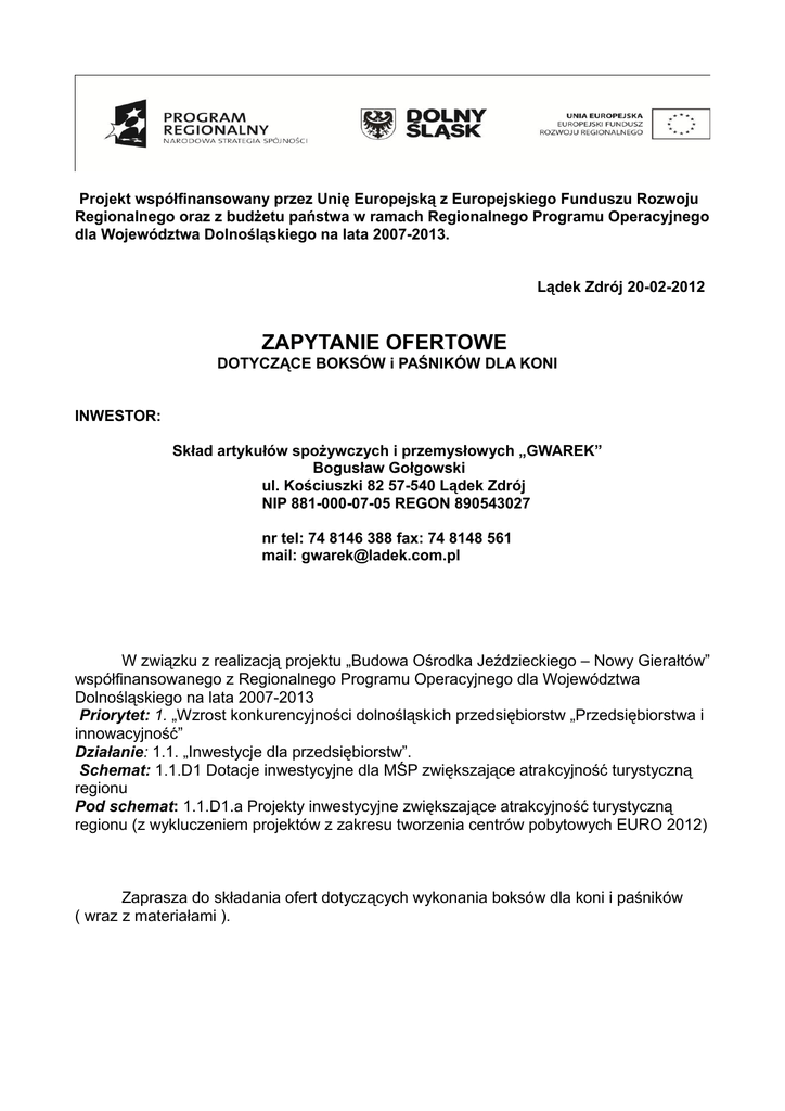 Projekt współfinansowany przez Unię Europejską z Europejskiego Funduszu Rozwoju Regionalnego oraz z budżetu państwa w ramach Regionalnego Programu Operacyjnego dla Województwa Dolnośląskiego na lata 2007-2013. Lądek Zdrój 20-02-2012 ZAPYTANIE OFERTOWE DOTYCZĄCE BOKSÓW i PAŚNIKÓW DLA KONI INWESTOR: Skład artykułów spożywczych i przemysłowych „GWAREK” Bogusław Gołgowski ul. Kościuszki 82 57-540 Lądek Zdrój NIP 881-000-07-05 REGON 890543027 nr tel: 74 8146 388 fax: 74 8148 561 mail: [email protected] W związku z realizacją projektu „Budowa Ośrodka Jeździeckiego – Nowy Gierałtów” współfinansowanego z Regionalnego Programu Operacyjnego dla Województwa Dolnośląskiego na lata 2007-2013 Priorytet: 1. „Wzrost konkurencyjności dolnośląskich przedsiębiorstw „Przedsiębiorstwa i innowacyjność” Działanie: 1.1. „Inwestycje dla przedsiębiorstw”. Schemat: 1.1.D1 Dotacje inwestycyjne dla MŚP zwiększające atrakcyjność turystyczną regionu Pod schemat: 1.1.D1.a Projekty inwestycyjne zwiększające atrakcyjność turystyczną regionu (z wykluczeniem projektów z zakresu tworzenia centrów pobytowych EURO 2012) Zaprasza do składania ofert dotyczących wykonania boksów dla koni i paśników ( wraz z materiałami ). 1. PRZEDMIOT ZAMÓWIENIA: • wykonanie stalowych paśników dla koni o wymiarach min. 70x50x40 (na „kostkę siana”) zabezpieczone antykorozyjnie-cynkowane ogniowo w ilości 11 szt • wykonanie fasad boksów dla koni w ilości 11 sztuk – fasady boksów ocynkowane , malowane na zielono wypełnione tarcicą sosnową obustronnie struganą impregnowaną o grubości 42 mm w kolorze tik – stabilna konstrukcja wykonana z kształtownka zimnogiętego 50x50x3 i ceownika zimnogiętego 50x50x3 i 50x30x3 – zabezpieczene antykorozyjne – cynkowane ogniowo – wentylacja w decse – otwór do zadawania paszy – wysokośc max.2,25 m – długośc fasad 2,60m -2 szt; 2,65-1szt; 2,66-3szt, 2,67-2szt; 2,81m -2szt ; ; 2,91m – 1szt; – drzwi przesuwne z prowadnica górną, blokada zamknięcia oraz z zabezpieczeniem dolnym – niezależnie otwierana krata w drzwiach przesuwnych WYMAGANIA DLA WYKONAWCY: a).Posiadają uprawnienia do wykonywania określonej działalności lub czynności, jeżeli ustawy nakładają obowiązek posiadania takich uprawnień; b). Posiadają niezbędną wiedzę i doświadczenie oraz dysponują potencjałem technicznym i osobami zdolnymi do wykonania zamówienia c) Rozliczenia finansowe z Wykonawcą następować będą po zakończeniu pracy i ich odebraniu przez Zamawiającego. Szczegółowe uzgodnienia Zamawiający zawrze z wybranym Wykonawcą – w umowie. d) Wszelkie prace powinny być wykonane zgodnie z normami i przepisami budowlanymi, w tym w szczególności wynikającymi z: - obowiązującego prawa budowlanego (ustawa z dnia 7 lipca 1994 r. wraz z późn. zm), w tym wszelkie normy i przepisy prawne w zakresie bezpieczeństwa i higieny pracy; e) Wykonawca ponosi wszelkie koszty związane z przygotowaniem i złożeniem oferty. f) oferenci mogą złożyć wyłącznie jedną ofertę g) nie dopuszcza się składania ofert wariantowych h) nie dopuszcza się składania ofert cząstkowych 2.TERMIN I MIEJSCE WYKONANIA ZAMÓWIENA Miejsce realizacji zamówienia: działka nr 15 Nowy Gierałtów 57-550 Stronie Śl. Termin realizacji zamówienia; 30-04-2012 3.SPOSÓB OBLICZANIA CENY Oferowana cena powinna zawierać wszelkie koszty związane z realizacją zamówienia • Cena powinna uwzględniać podatek od towarów i usług i winna być podana dla kategorii prac w PLN (proszę o podanie zarówno kwoty netto, kwoty brutto oraz podatek VAT-kwota ) • Cena podana przez Wykonawcę nie będzie podlegała zmianom przez okres realizacji zamówienia, niezależnie od wszelkich czynników 4.TERMIN, SPOSÓB I MIEJSCE SKŁADANIA OFERT 1. Ofertę w języku polskim, należy złożyć w terminie do dnia 24-02-2012 do godz. 16.00 - pocztą elektroniczną na adres: [email protected] lub za pośrednictwem kuriera lub osobiście (decyduje data wpływu na adres 57-540 Lądek Zdrój ul. Kościuszki 82) 2. Oferty złożone po terminie nie będą rozpatrywane. 5. ZAWARTOŚĆ OFERTY Oferta powinna zawierać: • załącznik nr 1 (formularz ofertowy) • załącznik nr 2 ( oświadczenie o niezaleganiu z płatnościami wobec ZUS i US) • załącznik nr 3 wycena 6.OCENA I WYBÓR NAJKORZYSTNIEJSZEJ OFERTY Zamawiający ustala, że jedynym kryterium, którym będzie się kierował Zamawiający jest cena realizacji zadania. Oferta o najniższej cenie zadania, spełniająca warunki zamówienia zostanie wybrana, chyba że postępowanie zostanie unieważnione. Zamawiający zastrzega sobie prawo unieważnienia postępowania bez podania przyczyn, w szczególności w przypadku zaoferowania przedmiotu zamówienia o zbyt niskiej jakości. 7.ROZSTRZYGNIĘCIE / WYBÓR OFERTY Rozstrzygnięcie procesu wyboru oferty odbędzie się w terminie do 2 dnia od zakończenia terminu składania ofert. Wyniki rozstrzygnięcia wyboru oferty zostaną przekazane do wiadomości wszystkim oferentom drogą mailową lub telefoniczną w terminie do 3 dni od daty zakończenia terminu składania ofert. 8.MOŻLIWOŚĆ UZYSKANIA DODATKOWYCH WYJAŚNIEŃ Dodatkowych informacji oraz wyjaśnień związanych z niniejszym zapytaniem ofertowym udziela Pan Bogusław Gołgowski nr tel 74 8146 388 mail: [email protected] 9. KLAUZULE DODATKOWE Informujemy, że w przypadku, kiedy w terminie wskazanym przez niniejsze Zapytanie nie wpłynie żadna oferta lub mniej niż dwie ważne oferty, Zamawiający unieważni to postępowanie i dokona wyboru dowolnego wykonawcy, który spełni wszystkie kryteria i warunki określone w zapytaniu. Zamawiający zastrzega sobie prawo do unieważnienia postępowania również z innych ważnych przyczyn, o których będzie zobowiązany powiadomić oferentów. ZAŁ. NR 1 …............................................................ data i miejscowość FORMULARZ