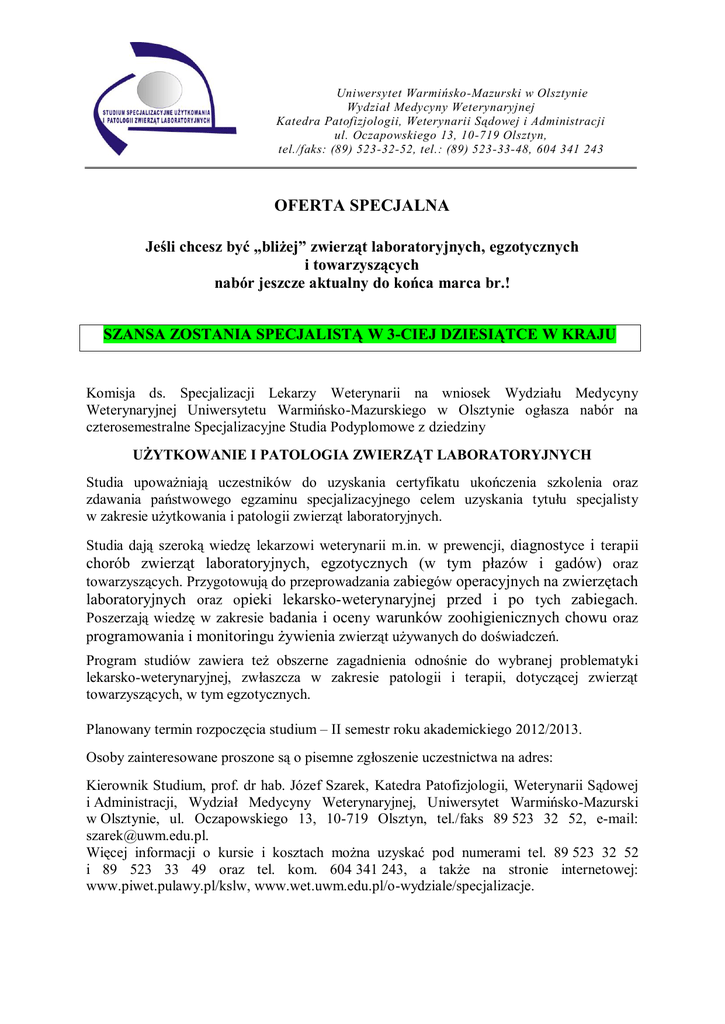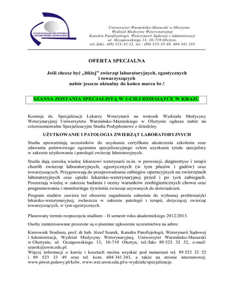 Uniwersytet Warmińsko-Mazurski w Olsztynie Wydział Medycyny Weterynaryjnej Katedra Patofizjologii, Weterynarii Sądowej i Administracji ul. Oczapowskiego 13, 10-719 Olsztyn, tel./faks: (89) 523-32-52, tel.: (89) 523-33-48, 604 341 243 OFERTA SPECJALNA Jeśli chcesz być „bliżej” zwierząt laboratoryjnych, egzotycznych i towarzyszących nabór jeszcze aktualny do końca marca br.! SZANSA ZOSTANIA SPECJALISTĄ W 3-CIEJ DZIESIĄTCE W KRAJU Komisja ds. Specjalizacji Lekarzy Weterynarii na wniosek Wydziału Medycyny Weterynaryjnej Uniwersytetu Warmińsko-Mazurskiego w Olsztynie ogłasza nabór na czterosemestralne Specjalizacyjne Studia Podyplomowe z dziedziny UŻYTKOWANIE I PATOLOGIA ZWIERZĄT LABORATORYJNYCH Studia upoważniają uczestników do uzyskania certyfikatu ukończenia szkolenia oraz zdawania państwowego egzaminu specjalizacyjnego celem uzyskania tytułu specjalisty w zakresie użytkowania i patologii zwierząt laboratoryjnych. Studia dają szeroką wiedzę lekarzowi weterynarii m.in. w prewencji, diagnostyce i terapii chorób zwierząt laboratoryjnych, egzotycznych (w tym płazów i gadów) oraz towarzyszących. Przygotowują do przeprowadzania zabiegów operacyjnych na zwierzętach laboratoryjnych oraz opieki lekarsko-weterynaryjnej przed i po tych zabiegach. Poszerzają wiedzę w zakresie badania i oceny warunków zoohigienicznych chowu oraz programowania i monitoringu żywienia zwierząt używanych do doświadczeń. Program studiów zawiera też obszerne zagadnienia odnośnie do wybranej problematyki lekarsko-weterynaryjnej, zwłaszcza w zakresie patologii i terapii, dotyczącej zwierząt towarzyszących, w tym egzotycznych. Planowany termin rozpoczęcia studium – II semestr roku akademickiego 2012/2013. Osoby zainteresowane proszone są o pisemne zgłoszenie uczestnictwa na adres: Kierownik Studium, prof. dr hab. Józef Szarek, Katedra Patofizjologii, Weterynarii Sądowej i Administracji, Wydział Medycyny Weterynaryjnej, Uniwersytet Warmińsko-Mazurski w Olsztynie, ul. Oczapowskiego 13, 10-719 Olsztyn, tel./faks 89 523 32 52, e-mail: [email protected]. Więcej informacji o kursie i kosztach można uzyskać pod numerami tel. 89 523 32 52 i 89 523 33 49 oraz tel. kom. 604 341 243, a także na stronie internetowej: www.piwet.pulawy.pl/kslw, www.wet.uwm.edu.pl/o-wydziale/specjalizacje. Zgłoszenie na studia powinno zawierać dokumenty przewidziane Rozporządzeniem Ministra Rolnictwa i Gospodarki Żywnościowej (DzU z 28. 11. 1994 r., Nr 131, poz. 667): wniosek zainteresowanego skierowany do Komisji, zawierający imię i nazwisko wnioskodawcy, datę i miejsce urodzenia oraz adres zamieszkania, informację o przebiegu pracy zawodowej oraz ukończonych kursach specjalizacyjnych i ewentualnych publikacjach, a także aktualne miejsce pracy, odpis dyplomu lekarza weterynarii, odpis zaświadczenia okręgowej izby lekarsko-weterynaryjnej o stwierdzeniu prawa wykonywania zawodu, deklarację o pokryciu kosztów specjalizacji przez lekarza weterynarii lub zatrudniający zakład pracy (1 700 zł za jeden semestr), dokument potwierdzający co najmniej dwuletni staż pracy zawodowej. O kolejności przyjęcia na studia decyduje staż pracy i uprzednio ukończone kursy specjalizacyjne oraz kolejność zgłoszenia. Kierownik Studium zastrzega sobie możliwość przesunięcia terminu rozpoczęcia I semestru. Kierownik Studium Specjalizacyjnego Użytkowania i Patologii Zwierząt Laboratoryjnych Prof. dr hab. Józef Szarek Dziekan Wydziału Medycyny Weterynaryjnej Prof. dr hab. Andrzej Koncicki