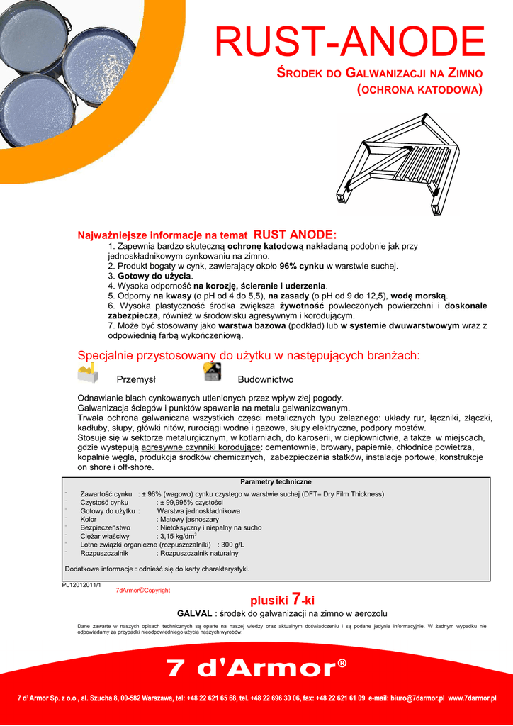 RUST-ANODE ŚRODEK DO GALWANIZACJI NA ZIMNO (OCHRONA KATODOWA) O Najważniejsze informacje na temat RUST ANODE: 1. Zapewnia bardzo skuteczną ochronę katodową nakładaną podobnie jak przy jednoskładnikowym cynkowaniu na zimno. 2. Produkt bogaty w cynk, zawierający około 96% cynku w warstwie suchej. 3. Gotowy do użycia. 4. Wysoka odporność na korozję, ścieranie i uderzenia. 5. Odporny na kwasy (o pH od 4 do 5,5), na zasady (o pH od 9 do 12,5), wodę morską. 6. Wysoka plastyczność środka zwiększa żywotność powleczonych powierzchni i doskonale zabezpiecza, również w środowisku agresywnym i korodującym. 7. Może być stosowany jako warstwa bazowa (podkład) lub w systemie dwuwarstwowym wraz z odpowiednią farbą wykończeniową. Specjalnie przystosowany do użytku w następujących branżach: Przemysł Budownictwo Odnawianie blach cynkowanych utlenionych przez wpływ złej pogody. Galwanizacja ściegów i punktów spawania na metalu galwanizowanym. Trwała ochrona galwaniczna wszystkich części metalicznych typu żelaznego: układy rur, łączniki, złączki, kadłuby, słupy, główki nitów, rurociągi wodne i gazowe, słupy elektryczne, podpory mostów. Stosuje się w sektorze metalurgicznym, w kotlarniach, do karoserii, w ciepłownictwie, a także w miejscach, gdzie występują agresywne czynniki korodujące: cementownie, browary, papiernie, chłodnice powietrza, kopalnie węgla, produkcja środków chemicznych, zabezpieczenia statków, instalacje portowe, konstrukcje on shore i off-shore. Parametry techniczne Zawartość cynku : ± 96% (wagowo) cynku czystego w warstwie suchej (DFT= Dry Film Thickness) Czystość cynku : ± 99,995% czystości Gotowy do użytku : Warstwa jednoskładnikowa Kolor : Matowy jasnoszary Bezpieczeństwo : Nietoksyczny i niepalny na sucho Ciężar właściwy : 3,15 kg/dm3 Lotne związki organiczne (rozpuszczalniki) : 300 g/L Rozpuszczalnik : Rozpuszczalnik naturalny Dodatkowe informacje : odnieść się do karty charakterystyki. PL12012011/1 7dArmor©Copyright plusiki 7-ki GALVAL : środek do galwanizacji na zimno w aerozolu Dane zawarte w naszych opisach technicznych są oparte na naszej wiedzy oraz aktualnym doświadczeniu i są podane jedynie informacyjnie. W żadnym wypadku nie odpowiadamy za przypadki nieodpowiedniego użycia naszych wyrobów. Właściwości Może być wykorzystywany zarówno jako podkład, jak i jako farba wykończeniowa na starych warstwach Rust-Anode; Może wzmocnić ochronę katodową starej warstwy cynkowania lub wzmocnić poprzednie warstwy Rust-Anode; Ma wysoką odporność na korozję, ścieranie i uderzenia : Rust-Anode może być pokryty odpowiednią farbą System dwuwarstwowy : Jako podkład o grubości od 40 do 80 µm (na sucho) DFT lub w 2 Zastosowania warstwach aż do 160 µm DFT : Od –80 °C do +200/250 °C Odporność na niskie/wysokie temperatury : Od –10 °C do +40 °C (różne czasy utwardzania) Temperatura stosowania : 7,05 m²/kg przy 40 µm DFT Teoretyczna wydajność powlekania : 6,20 m²/kg (przy użyciu pistoletu natryskowego) dla 40 µm Praktyczna wydajność powlekania Odporność na środowisko morskieDFT : Wyjątkowo dobra; zalecany jest system dwuwarstwowy Odporność na działanie kwasów/zasad Wysoka plastyczność Spawalność : : Szacowany okres eksploatacji : Szacowany okres eksploatacji przy nakładan u dwuwarstwowym Przewodność Mgła solna Gięcie Giętkość ONGC -1.181 : Bez pęknięć – Umożliwia dylatację nośnika metalowego Warstwa do 40 µm może być spawana bez wpływu na spoinę (promieniowanie rtg) Podobny jak przy cynkowaniu ogniowym (zależy od grubości warstwy suchej) Podobnie jak przy cynkowaniu ogniowym dwuwarstwowym : : : : : Warstwa sucha charakteryzuje się bardzo dobrą przewodnością ASTM B117 ASTM D-522 ONGC-1-GP-71 Metoda 119.5 Powłoka bogata w cynk organiczny : Może być nakładany w środowisku o odczynie PH od 5,5 aż do 12,5. NAKŁADANIE a) Przygotowanie powierzchni: Stopień czystości standardowy Stopień chropowatości Ra 12,5 µm Powierzchnia powinna być wolna od olejów, smarów oraz innych zanieczyszczeń chemicznych Powierzchnia powinna być wolna od pyłów Maksymalna wilgotność powierzchni 90% Temperatura podłoża powinna wynosić minimum 3 °C powyżej punktu rosy Normalna temperatura stosowania: pomiędzy –5 °C i +40 °C 1. Optymalne: Śrutowanie, intensywne szczotkowanie lub czyszczenie wodą pod bardzo wysokim ciśnieniem i jeszcze jedno czyszczenie wodą. Stopień czystości standardowy, a stopień chropowatości Ra 12,5 µm + 2 warstwy Rust-Anode o grubości od 40 do 60 µm każda. 2. Na stali czarnej: Wyniki będą korzystne na powierzchniach czystych, suchych, niezatłuszczonych. Jednak wraz z upływem czasu może odkładać się zgorzelina i podnosić powłokę. Aby do tego nie dopuścić, trzeba śrutować powierzchnię albo czyścić wodą pod bardzo wysokim ciśnieniem (ze śrutem). 3. Na stali walcowanej na zimno: Słabe przyleganie z powodu wysokiej zawartości proszku cynkowego. Konieczne jest odtłuszczanie i śrutowanie (lub czyszczenie wodą pod bardzo wysokim ciśnieniem i śrutowanie) lub lekkie utlenienie się metalu na wolnym powietrzu w celu „złamania” wypolerowania i uzyskania powierzchni przyczepnej. Można również wykorzystać ściernicę gruboziarnistą, aby nadać powierzchni szorstkość. 4. Na nieznacznie zardzewiałych elementach żelaznych: Należy szczotkować głęboko w celu usunięcia wszystkich przylegających cząstek. Aby zlikwidować pył należy umyć powierzchnię wodą lub parą. Na starych warstwach farby: Nie należy nakładać Rust-Anode na całą powierzchnię, lecz raczej pokrywać obszary zardzewiałe (nie pokrywać powierzchni pokrytych powłoką bitumiczną lub produktów zawierających aluminium). Rust-Anode stanowi ochronę katodową i jest procesem skutecznym tylko przy zapewnieniu bezpośredniego styku z powierzchnią stalową. Na starych powłokach farb proces Rus