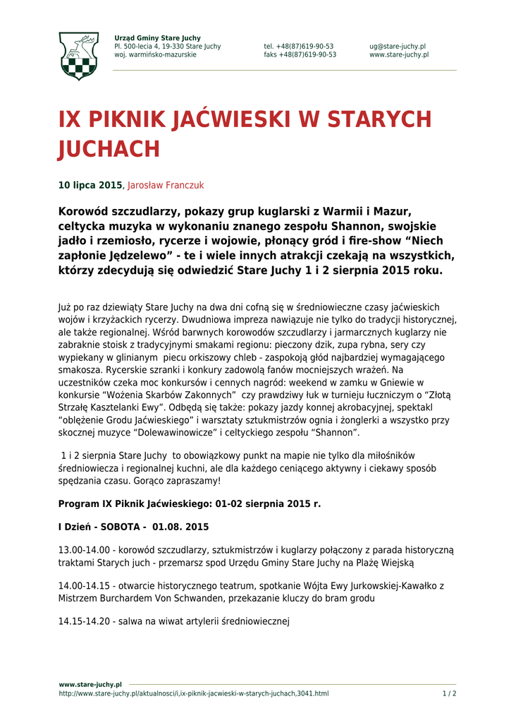 Urząd Gminy Stare Juchy Pl. 500-lecia 4, 19-330 Stare Juchy woj. warmińsko-mazurskie tel. +48(87)619-90-53 faks +48(87)619-90-53 [email protected] www.stare-juchy.pl IX PIKNIK JAĆWIESKI W STARYCH JUCHACH 10 lipca 2015, Jarosław Franczuk Korowód szczudlarzy, pokazy grup kuglarski z Warmii i Mazur, celtycka muzyka w wykonaniu znanego zespołu Shannon, swojskie jadło i rzemiosło, rycerze i wojowie, płonący gród i fire-show “Niech zapłonie Jędzelewo” - te i wiele innych atrakcji czekają na wszystkich, którzy zdecydują się odwiedzić Stare Juchy 1 i 2 sierpnia 2015 roku. Już po raz dziewiąty Stare Juchy na dwa dni cofną się w średniowieczne czasy jaćwieskich wojów i krzyżackich rycerzy. Dwudniowa impreza nawiązuje nie tylko do tradycji historycznej, ale także regionalnej. Wśród barwnych korowodów szczudlarzy i jarmarcznych kuglarzy nie zabraknie stoisk z tradycyjnymi smakami regionu: pieczony dzik, zupa rybna, sery czy wypiekany w glinianym piecu orkiszowy chleb - zaspokoją głód najbardziej wymagającego smakosza. Rycerskie szranki i konkury zadowolą fanów mocniejszych wrażeń. Na uczestników czeka moc konkursów i cennych nagród: weekend w zamku w Gniewie w konkursie “Wożenia Skarbów Zakonnych” czy prawdziwy łuk w turnieju łuczniczym o “Złotą Strzałę Kasztelanki Ewy”. Odbędą się także: pokazy jazdy konnej akrobacyjnej, spektakl “oblężenie Grodu Jaćwieskiego” i warsztaty sztukmistrzów ognia i żonglerki a wszystko przy skocznej muzyce “Dolewawinowicze” i celtyckiego zespołu “Shannon”. 1 i 2 sierpnia Stare Juchy to obowiązkowy punkt na mapie nie tylko dla miłośników średniowiecza i regionalnej kuchni, ale dla każdego ceniącego aktywny i ciekawy sposób spędzania czasu. Gorąco zapraszamy! Program IX Piknik Jaćwieskiego: 01-02 sierpnia 2015 r. I Dzień - SOBOTA - 01.08. 2015 13.00-14.00 - korowód szczudlarzy, sztukmistrzów i kuglarzy połączony z parada historyczną traktami Starych juch - przemarsz spod Urzędu Gminy Stare Juchy na Plażę Wiejską 14.00-14.15 - otwarcie historycznego teatrum, spotkanie Wójta Ewy Jurkowskiej-Kawałko z Mistrzem Burchardem Von Schwanden, przekazanie kluczy do bram grodu 14.15-14.20 - salwa na wiwat artylerii średniowiecznej www.stare-juchy.pl http://www.stare-juchy.pl/aktualnosci/i,ix-piknik-jacwieski-w-starych-juchach,3041.html 1/2 Urząd Gminy Stare Juchy Pl. 500-lecia 4, 19-330 Stare Juchy woj. warmińsko-mazurskie tel. +48(87)619-90-53 faks +48(87)619-90-53 [email protected] www.stare-juchy.pl 15.00 - 18.00 -plenerowe studio Radio Olsztyn Szranki i konkury: 15.00-16.00 - pojedynki rycerskie z użyciem broni średniowiecznej, plasy dwórek, zabawy plebejskie, studio fotograficzne “Gęba Jaćwinga”, warsztaty rzemiosła dawnego, warsztaty kuglarskie, warsztaty kulinarne i zielarskie, warsztaty łucznicze 16.00-17.00 - konkurs rodzinny “Wożenie Skarbów Zakonnych” - do wygrania weekend na zamku w Gniewie 17.00-17.30 - spektakl “U Krzyżaków w Nowicjacie” 17.30-18.00 - pokaz jazdy konnej akrobacyjnej 18.00-19.00 - turniej kuszniczy dla publiczności o “Złoty Bełt Wielkiego Mistrza Burcharda Von Schwonden, turniej jaćwieski i turniej bojowy dla publiczności 19.00-19.30 - koncert chóru “Mazury” 19.30- 21.00 - koncert zespołu “Dolewawinowicze” 21.15 -22.00 - spektakl “Oblężenie Grodu jaćwieskiego przez Krzyżaków” 22.00-23.00 - koncert zespołu muzyki celtyckiej “Shannon” 22.00-23.00 - pokazy sztukmistrzów ognia i żonglerki “Niech zapłonie Jędzelewo” w wykonaniu JAMA- Nieformalnej Grupie Juchowskiej Aktywnej Młodzieży Alternatywnej i Przyjaciół 23.00-02.00 - zabawa taneczna II Dzień -Niedziela - 02.08.2015 11.00-12.00 - IV Mistrzostwa Świata w Strzelaniu z Tataraku 12.00-13.00 - obrzędy Jaćwieskie przy głazie narzutowym - dawnym ołtarzu ofiarnym Jaćwingów 14.00-16.00 - turniej łuczniczy o “Złotą Strzałę Kasztelanki Ewy” 14.00-15.00 - V Mistrzostwa Świata w Strzelaniu z Tataraku 15.00-16.00 - rozstrzygnięcie między-sołeckiego konkursu kulinarnego pod patronatem Marszałka Województwa Warmińsko-Mazurskiego Gustawa Marka Brzezina www.stare-juchy.pl http://www.stare-juchy.pl/aktualnosci/i,ix-piknik-jacwieski-w-starych-juchach,3041.html 2/2