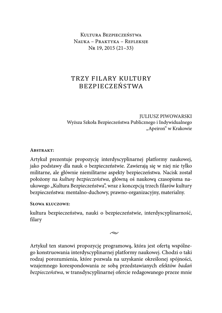 Kultura Bezpieczeństwa Nauka – Praktyka – Refleksje Nr 19, 2015 (21–33) Trzy filary kultury bezpieczeństwa Juliusz Piwowarski Wyższa Szkoła Bezpieczeństwa Publicznego i Indywidualnego „Apeiron” w Krakowie Abstrakt: Artykuł prezentuje propozycję interdyscyplinarnej platformy naukowej, jako podstawy dla nauk o bezpieczeństwie. Zawierają się w niej nie tylko militarne, ale głównie niemilitarne aspekty bezpieczeństwa. Nacisk został położony na kulturę bezpieczeństwa, główną oś naukową czasopisma naukowego „Kultura Bezpieczeństwa”, wraz z koncepcją trzech filarów kultury bezpieczeństwa: mentalno-duchowy, prawno-organizacyjny, materialny. Słowa kluczowe: kultura bezpieczeństwa, nauki o bezpieczeństwie, interdyscyplinarność, filary • Artykuł ten stanowi propozycję programową, która jest ofertą wspólnego konstruowania interdyscyplinarnej platformy naukowej. Chodzi o taki rodzaj porozumienia, które pozwala na uzyskanie określonej spójności, wzajemnego korespondowania ze sobą przedstawianych efektów badań bezpieczeństwa, w transdyscyplinarnej ofercie redagowanego przeze mnie 22 • Juliusz Piwowarski periodyku „Kultura Bezpieczeństwa”, ukształtowanej zgodnie z mottem e pluribus unum. Proponowaną platformą ma być kategoria naukowa określana jako kultura bezpieczeństwa, wraz z jej trzema filarami: indywidualnym, społecznym i materialnym, nawiązującymi do naukowych idei takich postaci, jak Alfred Louis Kroeber, czy Marian Cieślarczyk. • Rozwojowi człowieka oraz codziennemu funkcjonowaniu tworzonych przez niego zbiorowości społecznych – rodzin, społeczności lokalnych, w tym też i grup zawodowych – towarzyszy bezustanne wznoszenie gmachu kultury. Fenomen kultury to ogół materialnych i pozamaterialnych elementów składających się na utrwalony dorobek człowieka. Już w 1871 roku angielski antropolog Edward Tylor sformułował definicję pojęcia kultura1. Według Tylora kultura obejmuje wiedzę, wierzenia, sztukę, moralność, prawo, obyczaje i inne zdolności zdobyte przez człowieka jako członka społeczeństwa. Amerykański antropolog kulturowy Alfred Louis Kroeber (1876–1960) zaprezentował koncepcję kultury, stanowiącą inspirację dla idei filarów kultury bezpieczeństwa. Trzema składowymi kultury w idei Kroebera są rzeczywistość materialna, kultura społeczna i kultura etyczna oraz związany z nią system wartości, czemu Kroeber dał wyraz w dziele zatytułowanym The Nature of Culture (1952)2. • Angielski filozof i socjolog, Roger Vernon Scruton, jest apologetą kultury Zachodu i z namaszczeniem podkreśla – „kultura jest ważna”. Stwierdzenie to, w czasach globalizacji, wcale jednak nie rozbrzmiewa wokół nas na tyle mocno, by nie trzeba go było za Scrutonem coraz silniej powtarzać i potwierdzać w konkretnym działaniu3. Chcąc z podniesionym czołem twier1 E. B. Tylor, Primitive Culture , Vol. 1, Vol. 2, John Murray, London 1871. 2 A. L. Kroeber, The Nature of Culture, University of Chicago Press, Chicago 1952; Idem, Configurations of Culture Growth, University of California Press, Berkeley 1944. 3 D ziałanie w socjologii to taki rodzaj ludzkiego postępowania, z którym podmioty będące ich autorami wiążą pewne znaczenie (sens); Takie ujęcie kategorii działanie rozpowszechniło się dzięki socjologii Maxa Webera – dziś uznawane jest za elementarne pojęcie socjologiczne: „Działanie oznacza ludzkie zachowanie Trzy filary kultury bezpieczeństwa • 23 dzić wobec innych, iż „kultura jest ważna”, należy zatem najpierw zaczynać od siebie. Współcześnie bardzo często spotykane są fałszywe interpretacje wolności, pozbawiające nas kultury, której wzory rzutują na zachowania zgodne z określonymi normami i zasadami. Interpretacje zwalniające nas od obowiązków, czy odpowiedzialności moralnej, tworzą aberracje w subobszarze kultury określanym jako kultura bezpieczeństwa. Pojawiło się zagrożenie, że nasza kultura może zostać zdewaluowana, a moralność zostanie wyeliminowana, ze szkodą dla bezpieczeństwa człowieka. Fenomen kultury bezpieczeństwa jest częścią szeroko odczytywanej kultury. „Jako wyraźnie zarysowująca się domena kultury towarzyszy człowiekowi od jego zarania. Jak zauważa wielu antropologów, z Malinowskim na czele, zapewnienie bezpieczeństwa leżało u podstaw humanizacji i stanowiło conditio sine qua non nie tylko przetrwania gatunku ludzkiego, ale także rozwoju innych płaszczyzn ludzkiej kultury”4. • Można odkryć, że zjawiska społeczne kultura i bezpieczeństwo, funkcjonują w bardzo zbliżony sposób: 1. Zarówno dla bezpieczeństwa, jak i dla kultury – paralelnie – znaczenie mają dwa jednocześnie występujące parametry: przestrzeń oraz czas. 2. Fizyczna przestrzeń daje przykładowo możliwość powstania „regionów bezpieczeństwa” (czy „regionów zagrożeń”), a jednocześnie – pozwala, by dorobek kultury mógł się rozszerzać obejmując coraz to większe terytorium. 3. Z kolei parametr czasu stanowi układ odniesienia, w którym trwa na danym terytorium proces budowania kultury, tożsamy z procesem rozwoju jednostek ludzkich, małych, średnich i wielkich grup (zewnętrzny lub wewnętrzny czyn, zaniechanie lub znoszenie), jeśli i o ile [podmiot] działający, bądź wielu działających, wiąże z nim pewien subiektywny sens”, definiuje Max Weber w dziele Gospodarka i społeczeństwo. Zarys socjologii rozumiejącej, (Wirtschaft und Gesellschaft, Tübingen 1922), Państwowe Wydawnictwo Naukowe, Warszawa 2002, s. 6. 4 S. Jarmoszko, Nowe wzory kultury bezpieczeństwa a procesy deterioracji więzi społecznej, [w:] Jedność i różnorodność. Kultura vs. kultury, E. Rekłajtis, R. Wiśniewski, J. Zdanowski (red.), Aspra-JR, Warszawa 2010; B. Malinowski, Naukowa teoria kultury, [w:] Szkice z teorii kultury, Książka i Wiedza, Warszawa 1958, s. 101. 24 • Juliusz Piwowarski spo