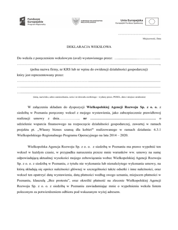 ……………………………… Miejscowość, Data DEKLARACJA WEKSLOWA Do weksla z poręczeniem wekslowym (aval) wystawionego przez: ….....................……………...... ………………….………...............................……………………......................................................., (pełna nazwa firmy, nr KRS lub nr wpisu do ewidencji działalności gospodarczej) który jest reprezentowany przez: ……………………………………………………................................................................................ …............................................................................................................................................................ …............................................................................................................................................................ (imię, nazwisko, adres zamieszkania, seria i nr dowodu osobistego - wydany przez, PESEL, data i miejsce urodzenia) W załączeniu składam do dyspozycji Wielkopolskiej Agencji Rozwoju Sp. z o. o. z siedzibą w Poznaniu poręczony weksel z mojego wystawienia, jako zabezpieczenie prawidłowej realizacji umowy z dnia……………... nr ………………………………………………. o udzielenie wsparcia finansowego na rozpoczęcie działalności gospodarczej, zawartej w ramach projektu pt. „Własny biznes szansą dla kobiet" realizowanego w ramach działania: 6.3.1 Wielkopolskiego Regionalnego Programu Operacyjnego na lata 2014 – 2020. Wielkopolska Agencja Rozwoju Sp. z o. o. z siedzibą w Poznaniu ma prawo wypełnić ten weksel w każdym czasie, w przypadku naruszenia przeze mnie warunków ww. umowy na sumę odpowiadającą aktualnej wysokości mojego zobowiązania wobec Wielkopolskiej Agencji Rozwoju Sp. z o. o. z siedzibą w Poznaniu, z tytułu nie wykonania lub nienależytego wykonania umowy, na którą składają się oprócz należności głównej w szczególności także odsetki i inne należności, oraz weksel ten opatrzyć datą wystawienia, datą płatności według swego uznania, miejscem płatności w Poznaniu, klauzulą „Bez protestu”, oraz określić płatność na zlecenie Wielkopolskiej Agencji Rozwoju Sp. z o. o. z siedzibą w Poznaniu zawiadamiając mnie o wypełnieniu weksla listem poleconym za potwierdzeniem odbioru pod wskazanym wyżej adresem. List ten powinien być wysłany przynajmniej na 14 dni przed terminem płatności weksla. Dwukrotne awizo pod wskazanym w deklaracji adresem będzie uważane za skuteczne doręczenie. Zobowiązuje się do informowania Wielkopolskiej Agencji Rozwoju Sp. z o. o. z siedzibą w Poznaniu o każdorazowej zmianie adresu z tym skutkiem, że list skierowany według ostatnich danych i pod ostatnio znany adres będzie uważany za skutecznie doręczony. Jednocześnie zobowiązuje się zapłacić sumę wekslową bez protestu na żądanie posiadacza weksla jako pokrycie mojego długu wobec Wielkopolskiej Agencji Rozwoju Sp. z o. o. z siedzibą w Poznaniu wynikającego z wymienionej wyżej umowy jej nie wykonania lub nienależytego jej wykonania. Niniejsza deklaracja wekslowa jest bezwarunkowa i nieodwołalna, a wygasa jedynie w przypadku, gdy warunki umowy zostaną przeze mnie dotrzymane. Weksel zostanie zwrócony po zatwierdzeniu rozliczenia wydatków poniesionych przeze mnie w ramach w/w umowy, lecz nie wcześniej niż przed upływem 12 miesięcy od dnia faktycznego rozpoczęcia działalności gospodarczej, zgodnie z aktualnym wpisem do CEIDG. Po wygaśnięciu zabezpieczonej wierzytelności wystawca weksla zostanie pisemnie wezwany przez Wielkopolską Agencje Rozwoju Sp. z o. o. z siedzibą w Poznaniu do odebrania weksla. Jednocześnie wystawca weksla wyraża zgodę na zniszczenie weksla w przypadku nieodebrania go we wskazanym w wezwaniu terminie. ……………………………………… (data i czytelny podpis) Oświadczenie poręczyciela Ja, niżej podpisana/-y …………………………………………….…………………..zamieszkała/-y: ……………………………………………………………...…….., seria i numer dowodu osobistego ……………...…………...………….., PESEL …………………………………….., oświadczam, że zapoznałam/łem się z treścią niniejszej deklaracji wekslowej podpisanej przez mojego małżonka………………(imię i nazwisko)………………... i wyrażam zgodę na jej postanowienia, a tym samym wyrażam zgodę na zaciągnięcie przez małżonka zobowiązań objętych przedmiotową deklaracją i wystawienie przez niego weksla z poręczeniem wekslowym (aval). .................................................................................................. (data i czytelny podpis) Ja, niżej podpisana/-y …………………………….……………………………….…,zamieszkała/-y: …………………………………………...…………….., legitymująca/-y się dowodem osobistym nr ……………………………….., PESEL ……………………………….., jako poręczyciel opisanego wyżej weksla z poręczeniem wekslowym (aval) z klauzulą „bez protestu”, wystawionego przez ………………………………….. wyrażam zgodę na wypełnienie tego weksla przez Wielkopolską Agencje Rozwoju Sp. z o. o. z siedzibą w Poznaniu zgodnie z niniejszą deklaracją wekslową. Wielkopolska Agencja Rozwoju Sp. z o. o. zobowiązuje się zawiadomić mnie o wypełnieniu weksla listem poleconym wysłanym najpóźniej na 14 dni przed terminem płatności weksla na adres: ……………………………………………. Jednocześnie wyrażam zgodę, aby zawiadomienie o wypełnieniu weksla zastąpiło przedstawienie weksla do zapłaty. W razie nieodebrania zawiadomienia za datę doręczenia zawiadomienia uważa się dzień pierwszego awizowania. Zobowiązuje się również do informowania Wielkopolskiej Agen