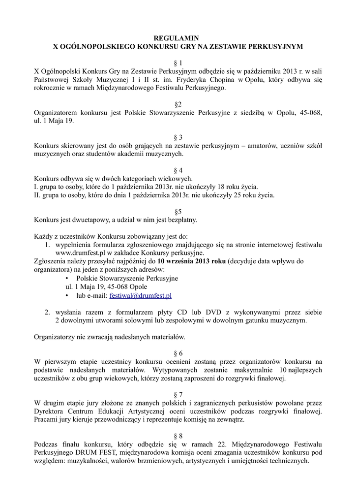 REGULAMIN X OGÓLNOPOLSKIEGO KONKURSU GRY NA ZESTAWIE PERKUSYJNYM §1 X Ogólnopolski Konkurs Gry na Zestawie Perkusyjnym odbędzie się w październiku 2013 r. w sali Państwowej Szkoły Muzycznej I i II st. im. Fryderyka Chopina w Opolu, który odbywa się rokrocznie w ramach Międzynarodowego Festiwalu Perkusyjnego. §2 Organizatorem konkursu jest Polskie Stowarzyszenie Perkusyjne z siedzibą w Opolu, 45-068, ul. 1 Maja 19. §3 Konkurs skierowany jest do osób grających na zestawie perkusyjnym – amatorów, uczniów szkół muzycznych oraz studentów akademii muzycznych. §4 Konkurs odbywa się w dwóch kategoriach wiekowych. I. grupa to osoby, które do 1 października 2013r. nie ukończyły 18 roku życia. II. grupa to osoby, które do dnia 1 października 2013r. nie ukończyły 25 roku życia. §5 Konkurs jest dwuetapowy, a udział w nim jest bezpłatny. Każdy z uczestników Konkursu zobowiązany jest do: 1. wypełnienia formularza zgłoszeniowego znajdującego się na stronie internetowej festiwalu www.drumfest.pl w zakładce Konkursy perkusyjne. Zgłoszenia należy przesyłać najpóźniej do 10 września 2013 roku (decyduje data wpływu do organizatora) na jeden z poniższych adresów: • Polskie Stowarzyszenie Perkusyjne ul. 1 Maja 19, 45-068 Opole • lub e-mail: [email protected] 2. wysłania razem z formularzem płyty CD lub DVD z wykonywanymi przez siebie 2 dowolnymi utworami solowymi lub zespołowymi w dowolnym gatunku muzycznym. Organizatorzy nie zwracają nadesłanych materiałów. §6 W pierwszym etapie uczestnicy konkursu ocenieni zostaną przez organizatorów konkursu na podstawie nadesłanych materiałów. Wytypowanych zostanie maksymalnie 10 najlepszych uczestników z obu grup wiekowych, którzy zostaną zaproszeni do rozgrywki finałowej. §7 W drugim etapie jury złożone ze znanych polskich i zagranicznych perkusistów powołane przez Dyrektora Centrum Edukacji Artystycznej oceni uczestników podczas rozgrywki finałowej. Pracami jury kieruje przewodniczący i reprezentuje komisję na zewnątrz. §8 Podczas finału konkursu, który odbędzie się w ramach 22. Międzynarodowego Festiwalu Perkusyjnego DRUM FEST, międzynarodowa komisja oceni zmagania uczestników konkursu pod względem: muzykalności, walorów brzmieniowych, artystycznych i umiejętności technicznych. §9 Po przesłuchaniu wszystkich uczestników organizatorzy przewidują następujący podział nagród: Grand Prix, 1 miejsce w grupie młodszej oraz 1 miejsce w grupie starszej oraz ewentualne wyróżnienia, jednak jury ma prawo dowolnego podziału nagród. Obrady komisji są niejawne. Na zakończenie konkursu będzie przedstawiona zbiorcza klasyfikacja uczestników konkursu i odpowiednio przyznane miejsca. Przy podziale miejsc nie będą brane pod uwagę gatunki muzyczne prezentowane przez poszczególnych uczestników Konkursu, ale wyłącznie poziom technicznych umiejętności i muzykalności. Decyzje jury są ostateczne. § 10 Konkurs odbędzie się w październiku 2013r. Dokładna data zostanie umieszczona na stronie internetowej www.drumfest.pl w nieprzekraczalnym terminie do dnia 24 września 2013 r. Wszyscy uczestnicy, którzy zgłosili swój udział w konkursie zostaną poinformowani o terminie finału mailem. § 11 Każdy z uczestników finałowej rozgrywki będzie zobowiązany do zaprezentowania przed Jury konkursu 2 utwory - jeden solowy i 1 jeden z podkładem muzycznym. Czas trwania tych utworów nie powinien przekraczać 15 min (łącznie). § 12 Każdy uczestnik Konkursu otrzyma z rąk przewodniczącego Jury okolicznościowy dyplom uczestnictwa w konkursie i nagrody ufundowane przez sponsorów. § 13 Po zakończeniu Konkursu organizatorzy przewidują możliwość bezpośrednich konsultacji z członkami Jury, podczas których będą omawiane wszystkie konkursowe występy. § 14 Lista wszystkich nagrodzonych osób znajdzie się na stronie www.drumfest.pl § 15 Wszyscy uczestnicy konkursu pokrywają sami koszty podróży i pobytu podczas jego trwania. § 16 Konkurs odbywa się przy udziale publiczności. § 17 Organizator zastrzega sobie prawo rejestracji konkursu. § 18 Nagrody w konkursie: Grand Prix - 500 zł I miejsce w każdej grupie wiekowej – nagrody rzeczowe