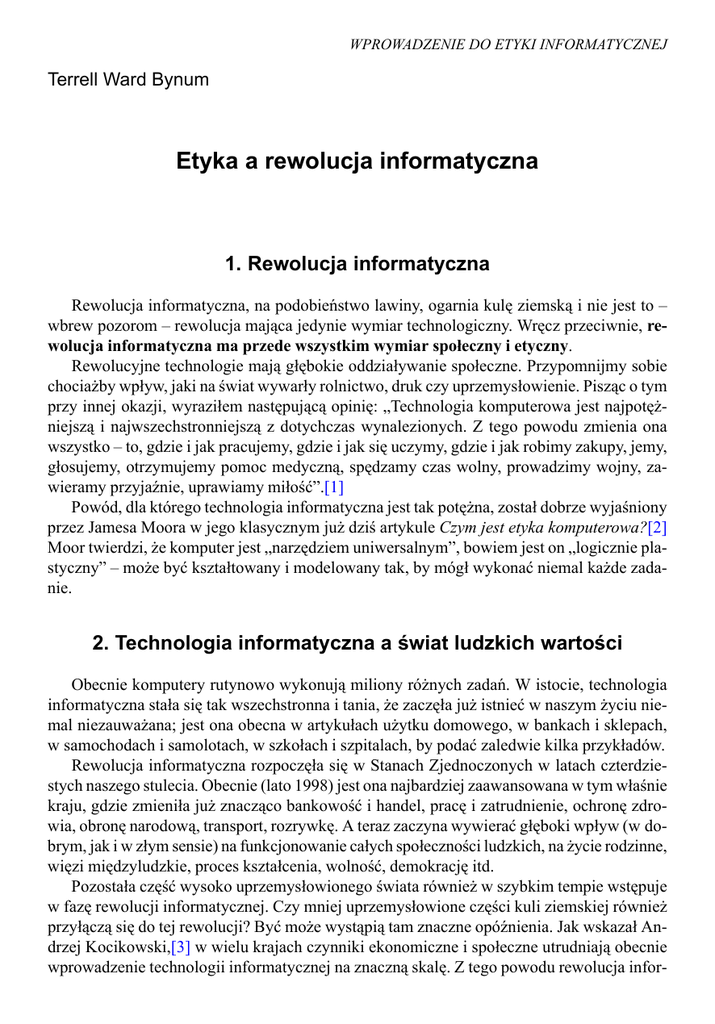 WPROWADZENIE DO ETYKI INFORMATYCZNEJ Terrell Ward Bynum Etyka a rewolucja informatyczna 1. Rewolucja informatyczna Rewolucja informatyczna, na podobieństwo lawiny, ogarnia kulę ziemską i nie jest to – wbrew pozorom – rewolucja mająca jedynie wymiar technologiczny. Wręcz przeciwnie, rewolucja informatyczna ma przede wszystkim wymiar społeczny i etyczny. Rewolucyjne technologie mają głębokie oddziaływanie społeczne. Przypomnijmy sobie chociażby wpływ, jaki na świat wywarły rolnictwo, druk czy uprzemysłowienie. Pisząc o tym przy innej okazji, wyraziłem następującą opinię: „Technologia komputerowa jest najpotężniejszą i najwszechstronniejszą z dotychczas wynalezionych. Z tego powodu zmienia ona wszystko – to, gdzie i jak pracujemy, gdzie i jak się uczymy, gdzie i jak robimy zakupy, jemy, głosujemy, otrzymujemy pomoc medyczną, spędzamy czas wolny, prowadzimy wojny, zawieramy przyjaźnie, uprawiamy miłość”.[1] Powód, dla którego technologia informatyczna jest tak potężna, został dobrze wyjaśniony przez Jamesa Moora w jego klasycznym już dziś artykule Czym jest etyka komputerowa?[2] Moor twierdzi, że komputer jest „narzędziem uniwersalnym”, bowiem jest on „logicznie plastyczny” – może być kształtowany i modelowany tak, by mógł wykonać niemal każde zadanie. 2. Technologia informatyczna a świat ludzkich wartości Obecnie komputery rutynowo wykonują miliony różnych zadań. W istocie, technologia informatyczna stała się tak wszechstronna i tania, że zaczęła już istnieć w naszym życiu niemal niezauważana; jest ona obecna w artykułach użytku domowego, w bankach i sklepach, w samochodach i samolotach, w szkołach i szpitalach, by podać zaledwie kilka przykładów. Rewolucja informatyczna rozpoczęła się w Stanach Zjednoczonych w latach czterdziestych naszego stulecia. Obecnie (lato 1998) jest ona najbardziej zaawansowana w tym właśnie kraju, gdzie zmieniła już znacząco bankowość i handel, pracę i zatrudnienie, ochronę zdrowia, obronę narodową, transport, rozrywkę. A teraz zaczyna wywierać głęboki wpływ (w dobrym, jak i w złym sensie) na funkcjonowanie całych społeczności ludzkich, na życie rodzinne, więzi międzyludzkie, proces kształcenia, wolność, demokrację itd. Pozostała część wysoko uprzemysłowionego świata również w szybkim tempie wstępuje w fazę rewolucji informatycznej. Czy mniej uprzemysłowione części kuli ziemskiej również przyłączą się do tej rewolucji? Być może wystąpią tam znaczne opóźnienia. Jak wskazał Andrzej Kocikowski,[3] w wielu krajach czynniki ekonomiczne i społeczne utrudniają obecnie wprowadzenie technologii informatycznej na znaczną skalę. Z tego powodu rewolucja infor- 26 Terrell Ward Bynum matyczna w regionach, takich jak Europa Wschodnia, Afryka czy Ameryka Łacińska będzie prawdopodobnie przebiegała wolniej niż w krajach wysoko uprzemysłowionych. Z drugiej strony, Krystyna Górniak-Kocikowska zauważa, że „Komputery nie znają granic. Sieci komputerowe, w odróżnieniu od innych środków masowego przekazu, mają rzeczywiście globalny charakter”.[4] A Jacek Sójka konstatuje: „Dostęp do przestrzeni cybernetycznej jest dużo łatwiejszy niż do światowych technik biznesu i zarządzania. Dzięki technologii informatycznej peryferie nie istnieją. Nawet odległe kraje rozwijające się mogą w pełni uczestniczyć w przestrzeni cybernetycznej i korzystać z nowych możliwości oferowanych przez globalne sieci (...), sieć stanowi jedyny obszar wolności w wielu niedemokratycznych krajach. Również możliwości oferowane przez Internet handlowi gwarantują wolność: żaden kraj nie mógłby pozwolić sobie na utratę tego konkurencyjnego przywileju”.[5] Z tych wszystkich powodów, jak również dzięki gwałtownemu spadkowi kosztów technologii komputerowej, rewolucja informatyczna może wywrzeć wpływ na wszystkie rejony kuli ziemskiej szybciej, niż jesteśmy skłonni uwierzyć obecnie. Jest więc nakazem chwili, by decydenci na całym świecie, przywódcy w sferach biznesu i przemysłu, nauczyciele, intelektualiści, zarówno ludzie zajmujący się komputerami profesjonalnie, jak i „zwykli obywatele”, zainteresowali się społecznym i etycznym oddziaływaniem technologii informatycznej. Dla badania i analizy wskazanych wyżej problemów, od trzydziestu lat rozwija się w USA nowa dziedzina akademicka nazywana etyką komputerową. W Stanach Zjednoczonych etyka komputerowa jest przedmiotem wykładanym na uniwersytetach; poświęca się jej konferencje i warsztaty naukowe, powstają materiały do zajęć na studiach, liczne książki i artykuły. Tworzy się organizacje zawodowe i centra badawcze zajmujące się etyką komputerową. W ciągu ostatnich paru lat ten nowy obszar badań spotkał się z zainteresowaniem również w innych krajach. Dla przykładu: w 1995 roku utworzone zostało „Globalne Konsorcjum do Spraw Komputingu i Wartości Społecznych” (Global Consortium on Computing and Social Values), w skład którego wchodzą: Ośrodek Badawczy Komputingu i Społeczeństwa (The Research Center on Computing & Society) przy Southern Connecticut State University, USA, utworzone w 1987 roku; Ośrodek Komputingu i Odpowiedzialności Społecznej (The Centre for Computing and Social Responsibility) przy De Montfort University w Leicester, Wielka Brytania, powstały w 1995 roku; Zakład Etyki Biznesu w Instytucie Kulturoznawstwa przy Uniwersytecie im. Adama Mickiewicza w Poznaniu, utworzony również w tym samym czasie. Te trzy centra badawcze – poprzez publikacje, międzynarodowe konferencje, projekty badawcze, strony WWW i międzynarodowe komitety doradcze – przyczyniły się do rozwoju współpracy badawczej między setkami naukowców na całym świecie. Z innych wydarzeń na szczególną wzmiankę zasługują trzy ważne konferencje, które zgromadziły uczonych z wielu krajów i zaowocowały różnorod