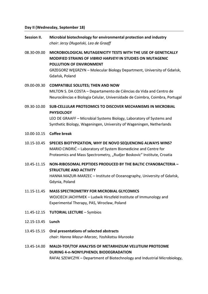 Day II (Wednesday, September 18) Session II. Microbial biotechnology for environmental protection and industry chair: Jerzy Długoński, Leo de Graaff 08.30-09.00 MICROBIOLOGICAL MUTAGENICITY TESTS WITH THE USE OF GENETICALLY MODIFIED STRAINS OF VIBRIO HARVEYI IN STUDIES ON MUTAGENIC POLLUTION OF ENVIRONMENT GRZEGORZ WĘGRZYN – Molecular Biology Department, University of Gdańsk, Gdańsk, Poland 09.00-09.30 COMPATIBLE SOLUTES; THEN AND NOW MILTON S. DA COSTA – Departamento de Ciências da Vida and Centro de Neurociências e Biologia Celular, Universidade de Coimbra, Coimbra, Portugal 09.30-10.00 SUB-CELLULAR PROTEOMICS TO DISCOVER MECHANISMS IN MICROBIAL PHYSIOLOGY LEO DE GRAAFF – Microbial Systems Biology, Laboratory of Systems and Synthetic Biology, Wageningen, University of Wageningen, Netherlands 10.00-10.15 Coffee break 10.15-10.45 SPECIES BIOTYPIZATION, WHY DE NOVO SEQUENCING ALWAYS WINS? MARIO CINDRIĆ – Laboratory of System Biomedicine and Centre for Proteomics and Mass Spectrometry, „Rudjer Boskovic“ Institute, Croatia 10.45-11.15 NON-RIBOSOMAL PEPTIDES PRODUCED BY THE BALTIC CYANOBACTERIA – STRUCTURE AND ACTIVITY HANNA MAZUR-MARZEC – Institute of Oceanography, University of Gdańsk, Gdynia, Poland 11.15-11.45 MASS SPECTROMETRY FOR MICROBIAL GLYCOMICS WOJCIECH JACHYMEK – Ludwik Hirszfeld Institute of Immunology and Experimental Therapy, PAS, Wrocław, Poland 11.45-12.15 TUTORIAL LECTURE – Symbios 12.15-13.45 Lunch 13.45-15.15 Oral presentations of selected abstracts chair: Hanna Mazur-Marzec, Yoshikatsu Murooka 13.45-14.00 MALDI-TOF/TOF ANALYSIS OF METARHIZIUM VELUTIUM PROTEOME DURING 4-n-NONYLPHENOL BIODEGRADATION RAFAŁ SZEWCZYK – Department of Biotechnology and Industrial Microbiology, Institute of Microbiology, Biotechnology and Immunology, Faculty of Biology and Environmental Protection, University of Lodz, Poland 14.00-14.15 BALTIC BACTERIA – EFFECTIVE DEGRADERS OF CYANOBACTERIAL NONRIBOSOMAL PEPTIDES ANNA TORUŃSKA – Laboratory of Biochemical Ecology and Microorganisms, Institute of Oceanography, University of Gdańsk, Poland 14.15-14.30 HALOTOLERANT MICROORGANISMS ASSOCIATED WITH THE PLANTS IN SALINE SOIL SONIA SZYMAŃSKA – Department of Microbiology, Nicolaus Copernicus University in Torun, Poland 14.30-14.45 GENETIC MODIFICATION OF GLYCEROL FERMENTATIVE CATABOLISM IN WILD TYPE STRAIN C. FREUNDII AD970 KATARZYNA CZACZYK – Department of Biotechnology and Food Microbiology, Poznan University of Life Sciences, Poznań, Poland 14.45-15.00 THE TORTUOUS TRIMETHYLAMINE DEGRADATION PATHWAYS IN TWO STRAINS OF GENUS PARACOCCUS (ALPHAPROTEOBACTERIA) KATARZYNA KUŹMICZ – Department of Bacterial Genetics, Institute of Microbiology, Faculty of Biology, University of Warsaw, Poland 15.00-15.15 MOLECULAR METHODS FOR IDENTIFICATION OF BACTERIAL STRAINS COLONIZATION OF HISTORIC BUILDINGS ANNA OTLEWSKA – Institute of Fermentation Technology and Microbiology, Lodz University of Technology, Poland 15.15-16.15 Poster session and coffee break 16.15-19.30 Mass Spectrometry and Proteomics in Microbial Study – sample analysis 20.00 Get-together party