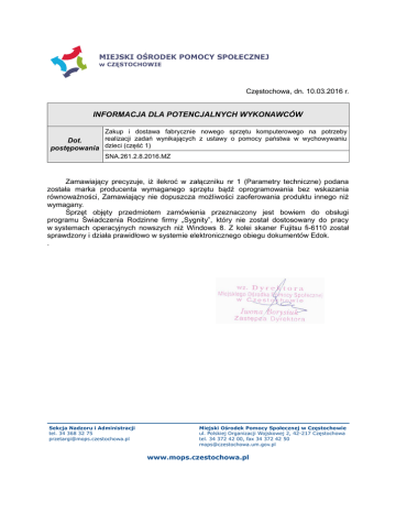 Częstochowa, dn. 10.03.2016 r. INFORMACJA DLA POTENCJALNYCH WYKONAWCÓW Zakup i dostawa fabrycznie nowego sprzętu komputerowego na potrzeby realizacji zadań wynikających z ustawy o pomocy państwa w wychowywaniu Dot. postępowania dzieci (część 1) SNA.261.2.8.2016.MZ Zamawiający precyzuje, iż ilekroć w załączniku nr 1 (Parametry techniczne) podana została marka producenta wymaganego sprzętu bądź oprogramowania bez wskazania równoważności, Zamawiający nie dopuszcza możliwości zaoferowania produktu innego niż wymagany. Sprzęt objęty przedmiotem zamówienia przeznaczony jest bowiem do obsługi programu Świadczenia Rodzinne firmy „Sygnity”, który nie został dostosowany do pracy w systemach operacyjnych nowszych niż Windows 8. Z kolei skaner Fujitsu fi-6110 został sprawdzony i działa prawidłowo w systemie elektronicznego obiegu dokumentów Edok. . Sekcja Nadzoru i Administracji tel. 34 368 32 75 [email protected] Miejski Ośrodek Pomocy Społecznej w Częstochowie ul. Polskiej Organizacji Wojskowej 2, 42-217 Częstochowa tel. 34 372 42 00, fax 34 372 42 50 [email protected] www.mops.czestochowa.pl