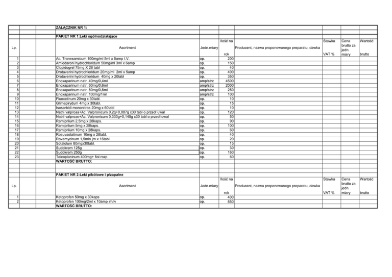 ZAŁĄCZNIK NR 1: PAKIET NR 1:Leki ogólnodziałające Ilość na Lp. 1 2 3 4 5 6 7 8 9 10 11 12 13 14 15 16 17 18 19 20 21 22 23 Asortment Ac. Tranexamicum 100mg/ml 5ml x 5amp I.V. Amiodaroni hydrochloridum 50mg/ml 3ml x 6amp Clopidogrel 75mg X 28 tabl Drotaverini hydrochloridum 20mg/ml 2ml x 5amp Drotaverini hydrochloridum 40mg x 20tabl Enoxaparinum natr. 40mg/0,4ml Enoxaparinum natr. 60mg/0,6ml Enoxaparinum natr. 80mg/0,8ml Enoxaparinum natr. 100mg/1ml Fluoxetinum 20mg x 30tabl. Glimepirydum 4mg x 30tabl. Isosorbidi mononitras 20mg x 60tabl Natrii valproas+Ac. Valpronicum 0,2g+0,087g x30 tabl o przedł uwal Natrii valproas+Ac. Valpronicum 0,333g+0,145g x30 tabl o przedł uwal Ramiprilum 2,5mg x 28kaps. Ramiprilum 5mg x 28kaps. Ramiprilum 10mg x 28kaps. Rosuvastatinum 10mg x 28tabl. Rovamycinum 1,5mln jm x 16tabl Sotalolum 80mgx30tabl. Sudokrem 125g Sudokrem 250g Teicoplaninum 400mg+ fiol rozp WARTOŚĆ BRUTTO: Jedn.miary op. op. op. op. op. amp/strz amp/strz amp/strz amp/strz op. op. op. op. op. op. op. op. op. op. op. op. op. op. Stawka Producent, nazwa proponowanego preparatu, dawka rok 200 150 40 400 350 4500 2000 250 100 10 15 10 120 50 90 100 60 40 20 15 30 160 60 VAT % Cena brutto za jedn. miary Wartość Cena brutto za jedn. miary Wartość brutto PAKIET NR 2:Leki p/bólowe i p/zapalne Ilość na Lp. 1 2 Asortment Ketoprofen 50mg x 30kaps Ketoprofen 100mg/2ml x 10amp im/iv WARTOŚĆ BRUTTO: Jedn.miary op. op. Stawka Producent, nazwa proponowanego preparatu, dawka rok 400 850 VAT % brutto PAKIET NR 3:Leki ogólnodziałające Ilość na Lp. Asortment Jedn.miary Stawka Producent, nazwa proponowanego preparatu, dawka rok 1 2 3 4 5 6 7 8 9 10 11 12 Acetylocysteina 200mg x 20tabl Acetylocysteina 600mg x 20 tabl. musuj. Acetylocysteina 300mg/3ml x 5amp Aluminii acetotartras X 6tabl Cefuroximum 250mg x 10tabl Cefuroximum 500mg x 10tabl. Clindamycinum 300mg x 16kaps Clindamycinum 300mg/2ml x 5amp. Ferri hydroxydi polysomaltosum IM 2ML X 50AMP Ferri hydroxydi polysomaltosum SYROP 50MG/5ML 100ML Ferri hydroxydi saccharum 0,02g/ml 5ml x 5amp. Leko sasz. do dezynf. X 100szt. WARTOŚĆ BRUTTO: op. op. op. op. op. op. op. op. op. op. op. op. VAT % Cena brutto za jedn. miary Wartość Cena brutto za jedn. miary Wartość Cena brutto za jedn. miary Wartość brutto 10 10 50 450 40 20 10 10 3 1 100 25 PAKIET NR 4:Kontrasty , paski do pomiaru glukozy we krwi Ilość na Lp. Asortment Jedn.miary Stawka Producent, nazwa proponowanego preparatu, dawka rok 1 2 3 4 5 Iomeprolum 0,3g jodu/ml 20ml Iomeprolum 0,3g jodu/ml 50ml Paski do pomiaru glukozy we krwi ACCU CHECK ACTIV x 50szt. Paski do pomiaru glukozy we krwi ACCU CHECK GO x 50szt. Urapidilum 25MG/5ML X 5AMP. WARTOŚĆ BRUTTO: fiol. fiol. op. op. op. VAT % brutto 40 140 25 30 30 PAKIET NR 5:Antybiotyki Ilość na Lp. 1 Asortment Amikacinum inj. 500mg / 2ml WARTOŚĆ BRUTTO: Jedn.miary fiol. Stawka Producent, nazwa proponowanego preparatu, dawka rok 2000 VAT % brutto PAKIET NR 6:Antybiotyki Ilość na Lp. 1 2 Asortment Amoksycylina 500mg + kwas klawulanowy 125mg tabl. Amoksycylina 500mg + kwas klawulanowy 100mg inj. WARTOŚĆ BRUTTO: Jedn.miary tabl. fiol. Stawka Producent, nazwa proponowanego preparatu, dawka rok 4410 360 VAT % Ilość na Stawka Cena brutto za jedn. miary Wartość Cena brutto za jedn. miary Wartość Cena brutto za jedn. miary Wartość Cena brutto za jedn. miary Wartość brutto PAKIET NR 7:Antybiotyki Lp. 1 Asortment Amoksycylina 1000mg + kwas klawulanowy 200mg inj. WARTOŚĆ BRUTTO: Jedn.miary fiol. Producent, nazwa proponowanego preparatu, dawka rok 8000 VAT % Ilość na Stawka brutto PAKIET NR 8:Leki przeciwbólowe Lp. 1 Asortment Jedn.miary fiol. Paracetamol r-r do infuzji 10mg/ml WARTOŚĆ BRUTTO: Producent, nazwa proponowanego preparatu, dawka rok 1800 VAT % brutto PAKIET NR 9:Antybiotyki Ilość na Lp. 1 Asortment Ceftriaxon 1g WARTOŚĆ BRUTTO: Jedn.miary fiol. Stawka Producent, nazwa proponowanego preparatu, dawka rok 200 VAT % brutto PAKIET NR 10:Leki ogólnodziałające Ilość na Lp. Asortment Jedn.miary Stawka Producent, nazwa proponowanego preparatu, dawka rok 1 2 3 4 5 6 7 8 9 10 Budesonid 0,125mg/ml 2ml x 20 Budesonid 0,250mg/ml 2ml x 20 Budesonid 0,500mg/ml 2ml x 20 Bupivacaina spinal heavy 0,5% 5mg/ml a 4ml x 5amp. nie wymagane jałowe pakowanie ampułek Bupivacaina z adrenaliną 0,5% 5mg/ml a 20ml x 5fiol. Meropenem 1g inj x10fiol. Metoprololi succinas 100mg x 28tabl o przedł uwal Metoprololi succinas 50mg x 28tabl o przedł uwal Metoprololi tartras 1mg/ml x 5amp. 5ml Torasemid 10mg x 30tabl WARTOŚĆ BRUTTO: VAT % op. op. op. op. 60 50 160 260 op. op. op. op. op. op. 10 50 40 70 10 60 Cena brutto za jedn. miary Wartość Cena brutto za jedn. miary Wartość Cena brutto za jedn. miary Wartość Cena brutto za jedn. miary Wartość brutto PAKIET NR 11:Albuminy Ilość na Lp. 1 Asortment Albuminum humanum 20% 50 ml WARTOŚĆ BRUTTO: PAKIET NR 12:Import docelowy Lp. 1 Jedn.miary fiol. Stawka Producent, nazwa proponowanego preparatu, dawka rok 120 VAT % Ilość na Stawka brutto TERMIN DOSTAWY 30 DNI!!!!! Asortment Methyloergometrine 0,2mg/ml WARTOŚĆ BRUTTO: Jedn.miary amp. Producent, nazwa proponowanego preparatu, dawka rok 200 VAT % brutto PAKIET NR 13:Immunoglobuliny Ilość na Lp. Asortment Jedn.miary rok 1 LUDZKA IG G DO WLEWÓW IV (zawartość IG G co najmniej 95%) w post.roztworu lub subst.suchej WARTOŚĆ BRUTTO: gram Stawka Producent, nazwa proponowanego preparatu, dawka 200 VAT % brutto PAKIET NR 14:Antidota Ilość na Lp. Asortment Jedn.miary Stawka Producent, nazwa proponowanego preparatu, dawka rok 1 Flumazenil 0,5mg/ml x 5amp. WARTOŚĆ BRUTTO: op. VAT % Cena brutto za jedn. miary Wartość Cena brutto za jedn. miary Wartość Cena brutto za jedn. miary Wartość Cena brutto za jedn. miary Wartość brutto 5 PAKIET NR 15:Hormony Ilość na Lp. 1 Asortment Terlipressinum 200mcg/2ml x 5amp WARTOŚĆ BRUTTO: Jedn.miary op. Stawka Producent, nazwa proponowanego preparatu, dawka rok 100 VAT % brutto PA