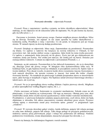 42 Tworzenie słownika – odpowiada Przemek Przemek: Piszę z zapytaniem i prośbą o pytania, na które chciałbym odpowiedzieć. Mam nadzieję, Ŝe nie odpiszesz mi do usłyszenia tylko do napisania. No, bo jak moŜna się słyszeć, gdy się tylko pisze. (...) Zaczynasz w kwietniu. Jesteś pewny swego. Zamiast mógłbym piszesz chciałbym. Silisz się na dowcip. Świetnie, Ŝeś napisał. Ja nie znam sposobu by ciebie identyfikować z konkretną osobą. Prosiłbym o imię i nazwisko. Co do pytań, to inicjatywa jest po twojej stronie. W ramach riposty na dowcip dodaję pozdrawiam. Przemek: Dziękuje za odpowiedz. Masz rację. Zapomniałem się przedstawić. Przemysław się kłania. Co sądzisz o wpływie faz księŜyca na rozwój rolnictwa w Chinach, to był oczywiście Ŝart. Jak moŜna zdobyć ocenę z egzaminu. Jakie kroki ku temu trzeba poczynić. Co sądzisz o sentencjach, które przyszły mi do głowy. śycie jest jak gra elektroniczna nie wiadomo, kiedy jest koniec. Nie sztuka jest tańczyć, ale sztuką jest się bawić. Dziecko jest esencją miłości rodziców. Czekam na odpowiedz z powaŜaniem Przemek. (...) Sentencje, są jak sentencje. Pozostawiłem je bez dalszych komentarzy, ale za to domyślam się, dlaczego jesteś tak pewny swego. W ubiegłym roku dyskutowaliśmy kilka razy. W konkluzji było, Ŝe gdy będziesz bywał na wkładach, to początkiem czerwca br. będzie wpis w twoim indeksie. Przy okazji wyszło, Ŝe prawie kaŜde słowo rozumiemy inaczej. Korzystamy z tych samych słowików, ale pewnie czytamy je inaczej. Jest temat dla ciebie „Zasady tworzenia słowika”. Po notatkach do pierwszego wykładu przepisałem słowa ze skorowidzów nazw, jakie bywają w ksiąŜkach o logice. Nie będziesz umiał utworzyć klarownego słowika z takich nazw, ale wysil się. Przemek: No to ja uporządkuję słowa według alfabetu i będzie pierwszy słowik. Mógłbym je takŜe uporządkować według długości zapisu, itd. (...) Chyba zaczynasz od końca. Sortowanie to czynności mechaniczne. Szkoda czasu na ich planowanie, a tym bardziej na wykonywanie. Od tego są maszyny. Obstaję przy tym, abyś ustalił kilka zasad, które zwykli uŜywać językoznawcy i które trudno wykonać mechanicznie. Przykładowo, w pierwszej kolejności ustalamy pojęcia pierwotne, czyli słowa, które nie będą objaśniane w słowniku. Ich zakres znaczeniowy zostanie określony przez uŜycie. Przytocz własną opinię o stosowaniu zasad przy tworzeniu opisu „pomoc” w programach typu „windows”. Przemek: W rozwoju dowolnej gałęzi wiedzy, kaŜda definicja, pojęcie lub relacja pociąga za sobą inne definicje, pojęcia lub relacje. Taka droga polega na przyjęciu podstawowych, niektórzy autorzy piszą pierwotnych, pojęć i relacji bez podawania ich definicji. Niektóre podstawowe twierdzenia, zwane aksjomatami, muszą być przyjęte bez dowodu. (...) Ponosi cię fantazja, bo deklamujesz fragment z moich notatek. Przemek: Opis "pomoc" w programach typu "windows" zbudowany jest w oparciu o powyŜszą zasadę tworzenia słownika. Przyjęte są podstawowe (zwane teŜ pierwotnymi) pojęcia, bez podawania ich definicji, które ułoŜone są według alfabetu. Pierwotne pojęcia pociągają za sobą inne pojęcia, definicje lub relacje. UwaŜam, Ŝe tak stworzony słownik jest dobry. Wpisując słowo kluczowe dotyczące zamierzonej operacji, wyświetlają się wszystkie moŜliwości związane z tą operacją. Ponadto te podstawowe pojęcia, jak juŜ wyŜej pisałem, ułoŜone są alfabetycznie. To znacznie ułatwia odnalezienie poŜądanego pojęcia. (...) Potraktowałeś mnie jak kucharka. Według kucharki ksiąŜki kucharskie to szczyt literackiego artyzmu. Wypisujemy składniki, jakie posiadamy. Z ksiąŜek wyskakują przepisy na rarytasy. No tak, ale gdy zapytamy kucharkę, dlaczego jej potrawy są smaczne, a nasze się tylko czasami udają, to ona odpowie szczerze. Ja przyrządzam wszystko na wyczucie. Z ksiąŜek kucharskich nie korzystam. Tam są piękne przepisy. Skoro są piękne to zawierają wiele pięknych słów, których znaczenia trzeba szukać w innych pięknych przepisach. Mnie tam czytanie nie bawi. KsiąŜki kucharskie mam, przeglądam je, ale ich dokładnie nie czytam. Przemek: Jak sądzisz. CóŜ optymistycznego mogę odpowiedzieć na zapytanie: Jak radzisz sobie z problemami w systemie windows? Spróbuj sam, zobacz i nie przymuszaj innych do fantazjowania w temacie: Jak radzisz sobie z wirusem, który nie dla wszystkich jest wirusem. Podobno wirus to tylko fragment łańcucha DNA. (...)