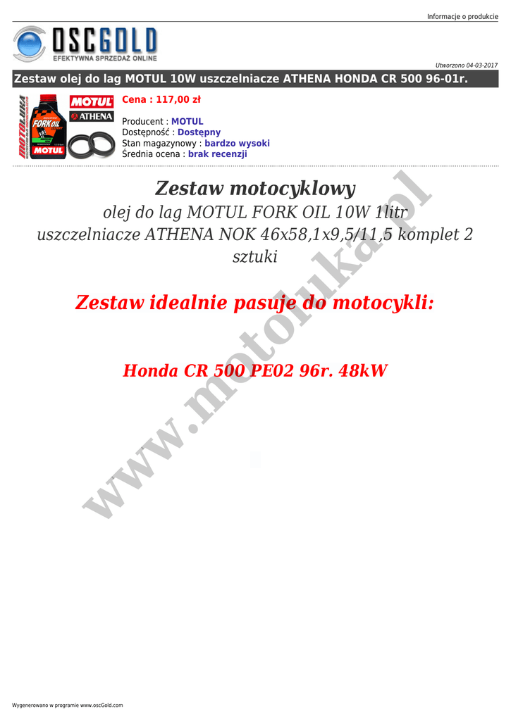 Informacje o produkcie Utworzono 04-03-2017 Zestaw olej do lag MOTUL 10W uszczelniacze ATHENA HONDA CR 500 96-01r. Cena : 117,00 zł Producent : MOTUL Dostępność : Dostępny Stan magazynowy : bardzo wysoki Średnia ocena : brak recenzji a. pl Zestaw motocyklowy uk olej do lag MOTUL FORK OIL 10W 1litr uszczelniacze ATHENA NOK 46x58,1x9,5/11,5 komplet 2 sztuki ot ol Zestaw idealnie pasuje do motocykli: w w w .m Honda CR 500 PE02 96r. 48kW Wygenerowano w programie www.oscGold.com a. pl uk w w w .m ot ol Jeśli potrzebujesz innej lepkości oleju: wybierz 5W, 15W lub 20W i zaznacz w informacji przy zakupie.