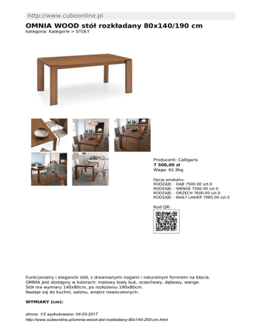 http://www.cubeonline.pl OMNIA WOOD stół rozkładany 80x140/190 cm kategoria: Kategorie > STOŁY Producent: Calligaris 7 500,00 zł Waga: 61.9kg Opcje produktu: RODZAJE: : DĄB 7500.00 szt.0 RODZAJE: : WENGE 7500.00 szt.0 RODZAJE: : ORZECH 7600.00 szt.0 RODZAJE: : BIAŁY LAKIER 7985.00 szt.0 Kod QR: Funkcjonalny i elegancki stół, z drewnianymi nogami i naturalnym fornirem na blacie. OMNIA jest dostępny w kolorach: matowy biały buk, orzechowy, dębowy, wenge. Stół ma wymiary 140x80cm, po rozłożeniu 190x80cm. Nadaje się do kuchni, salonu, wnętrz nowoczesnych. WYMIARY (cm): strona: 1/2 wydrukowano: 04-03-2017 http://www.cubeonline.pl/omnia-wood-stol-rozkladany-80x140-200-cm.html wysokość calkowita: 75 szerokość: 80 długość: 140/190 MATERIAŁ: drewno, fornir - wenge, orzech, dąb, lakierowany na kolor biały - matowy, Inne produkty tej firmy: http://cubeonline.pl/manufacturer/calligaris strona: 2/2 wydrukowano: 04-03-2017 http://www.cubeonline.pl/omnia-wood-stol-rozkladany-80x140-200-cm.html