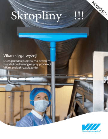 ! Dużo przedsiębiorstw ma problem z wodą kondensacyjną przy produkcj .i Vikan znalazł rozwiązanie! Ć OŚ Vikan sięga wyżej! W NO Skropliny !!! Dla lepszej higieny : Urządzenie to może być używane zarówno podczas produkcji jak i po niej Do usuwania wody kondensacyjne nie trzeba zatrzymywać produkcji wody po czym przechodzą przez kij teleskopowy z przelotem wody i kończąc na jej wypłynięciu do specjalnej buteleczki Vikan lub przez specjalny wąż na podłogę jak i rur. Dostępne w wielu kolorach Wszechstronne rozwiązanie o małej wadze jak i zachowujące ergonomiczną postawę Możliwa sterylizacja ! Art. Nr: 77165, 2973Q5 i 94415 Art. Nr: 77163, 2973Q3 i 94415 Art. Nr: 77163, 2973Q3 i 11005