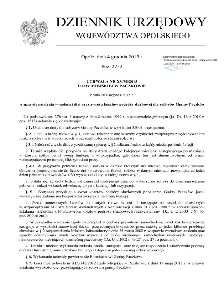 DZIENNIK URZĘDOWY WOJEWÓDZTWA OPOLSKIEGO Opole, dnia 4 grudnia 2015 r. Elektronicznie podpisany przez: TERESA MATCZYŃSKA; OPOLSKI URZĄD WOJEWÓDZKI Poz. 2752 Data: 2015-12-04 14:30:38 UCHWAŁA NR XV/98/2015 RADY MIEJSKIEJ W PACZKOWIE z dnia 26 listopada 2015 r. w sprawie ustalenia wysokości diet oraz zwrotu kosztów podróży służbowej dla sołtysów Gminy Paczków Na podstawie art. 37b ust. 1 ustawy z dnia 8 marca 1990 r. o samorządzie gminnym (j.t. Dz. U. z 2015 r. poz. 1515) uchwala się, co następuje: § 1. Ustala się diety dla sołtysów Gminy Paczków w wysokości 350 zł, miesięcznie. § 2. Dieta, o której mowa w § 1, stanowi rekompensatę kosztów czynności związanych z wykonywaniem funkcji sołtysa wsi wynikających w szczególności ze statutu sołectwa. § 3.1. Należność z tytułu diety zryczałtowanej opisanej w § 2 naliczana będzie za każdy miesiąc pełnienia funkcji. 2. Termin wypłaty diet przypada na 10-ty dzień każdego kolejnego miesiąca, następującego po miesiącu, w którym sołtys pełnił swoją funkcję, a w przypadku, gdy dzień ten jest dniem wolnym od pracy, w następującym po nim najbliższym dniu pracy. § 4.1. W przypadku pełnienia funkcji sołtysa w okresie krótszym niż miesiąc, wysokość diety zostanie obliczona proporcjonalnie do liczby dni sprawowania funkcji sołtysa w danym miesiącu, przyjmując za jeden dzień pełnienia obowiązków 1/30 wysokości diety, o której mowa w § 1. 2. Ustala się, że dieta będzie naliczana od następnego dnia po wyborze na sołtysa do dnia zaprzestania pełnienia funkcji wskutek odwołania, upływu kadencji lub rezygnacji. § 5.1. Sołtysom przysługuje zwrot kosztów podróży służbowych poza teren Gminy Paczków, jeżeli wykonywane zadanie ma bezpośredni związek z pełnioną funkcją. 2. Zwrot poniesionych kosztów, o których mowa w ust. 1 następuje na zasadach określonych w rozporządzeniu Ministra Spraw Wewnętrznych i Administracji z dnia 31 lipca 2000 r. w sprawie sposobu ustalania należności z tytułu zwrotu kosztów podróży służbowych radnych gminy (Dz. U. z 2000 r. Nr 66, poz. 800 ze zm.); 3. W przypadku wyrażenia zgody na przejazd w podróży prywatnym samochodem, zwrot kosztów przejazdu następuje w wysokości stanowiącej iloczyn przejechanych kilometrów przez stawkę za jeden kilometr przebiegu określoną w § 2 rozporządzenia Ministra Infrastruktury z dnia 25 marca 2002 r. w sprawie warunków ustalenia oraz sposobu dokonywania zwrotu kosztów używania do celów służbowych samochodów osobowych, motocykli i motorowerów niebędących własnością pracodawcy (Dz. U. z 2002 r. Nr 27, poz. 271 z późn. zm.). 4. Termin i miejsce wykonania zadania, środki transportu oraz miejsce rozpoczęcia i zakończenia podróży określa Burmistrz Gminy Paczków lub jego zastępca w poleceniu wyjazdu służbowego. § 6. Wykonanie uchwały powierza się Burmistrzowi Gminy Paczków. § 7. Traci moc uchwała nr XIX/142/2012 Rady Miejskiej w Paczkowie z dnia 17 maja 2012 r. w sprawie ustalenia wysokości diet przysługujących sołtysom gminy Paczków. Dziennik Urzędowy Województwa Opolskiego –2– Poz. 2752 § 8. Uchwała wchodzi w życie po upływie 14 dni od dnia ogłoszenia w Dzienniku Urzędowym Województwa Opolskiego i ma zastosowanie do diet należnych od dnia 1 stycznia 2016 r. Przewodniczący Rady Miejskiej w Paczkowie Wiesław Jan Barabasz