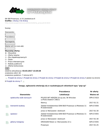 06-300 Przasnysz, ul. B. Joselewicza 6 Grafika : drukuj / nie drukuj http://www.pupprzasnysz.pl/klient/oferty_pracy/st:6.html Szukaj: Stanowisko: Pracodawca: Wymagania: Ważne od (rrrr-mm-dd): Wyszukaj oferty: - Wszystkie - Oferty lokalne - Dla niepełnosprawnych - Staże - Prace interwencyjne - Roboty publiczne - Oferta konkursowa X ostatnia aktualizacja: 03.03.2017 13:20:28 znaleziono ofert: 62 znaleziono podstron: 7 (strona 6/7) Przejdź do strony 1 Przejdź do strony 2 Przejdź do strony 3 Przejdź do strony 4 Przejdź do strony 5 Jesteś na stronie 6 Przejdź do strony 7 Uwaga, ogłoszenia otwierają się w wyskakujących okienkach typu "pop-up" Stanowisko opiekun/ka osób starszych kierownik budowy spawacz główny ksiegowy Pracodawca Nr oferty Lokalizacja Ważna od PFLEGE MIT HERZEN 24 sp.zoo, SK Wrocław ul.Pows.Slaskich 148/11 OfPr/17/023 Niemcy 2017-01-31 Zakład Instalatorstwa DAN BUD Przasnysz ul.Mostowa 11 M.Goleniewski StPr/17/056 praca w Warszawie i okolicach 2017-01-30 Zakład Instalatorstwa DAN BUD Przasnysz ul.Mostowa 11 M.Goleniewski StPr/17/055 praca w Warszawie i okolicach 2017-01-30 DROGSAN Różan ul. Warszawska 22 a StPr/17/045 Przasnysz 2017-01-25 Pracodawca Nr oferty monter instalacji Stanowisko gazowych w samochodach FHU TECHNOMAG Przasnysz ul.R.Hoppego 3b StPr/17/009 Przasnysz 2017-01-05 kieorwca samochodu ciężarowego AG POL Jarosław Burchacki Jednoorżec StPr/16/820 Jednorożec 2016-12-29 OLMATRANS LOGISTYKA Wyrab Karwacki 5 StPr/16/590 Wyrąb Karwacki 2016-08-29 SERVIS MOTO PARTNER Przasnysz ul.Żwirki i Wigury 17 B StPr/16/179 Przasnysz 2016-03-11 SERVIS MOTO PARTNER Przasnysz ul.Żwirki i Wigury 17 B StPr/16/047 Przasnysz 2016-01-29 EURO DOM Bartniki 66 StPr/15/294 Bartniki 2015-06-19 kierowca samochodu ciężarowego opertator koparko ładowarki mechanik samochodów osobowych kierowca samochodu ciężarowego Przejdź do strony 1 Przejdź do strony 2 Przejdź do strony 3 Przejdź do strony 4 Przejdź do strony 5 Jesteś na stronie 6 Przejdź do strony 7 - Oferta lokalna - Prace interwencyjne - Roboty publiczne - Staże - Oferta konkursowa - Dla niepełnosprawnych
