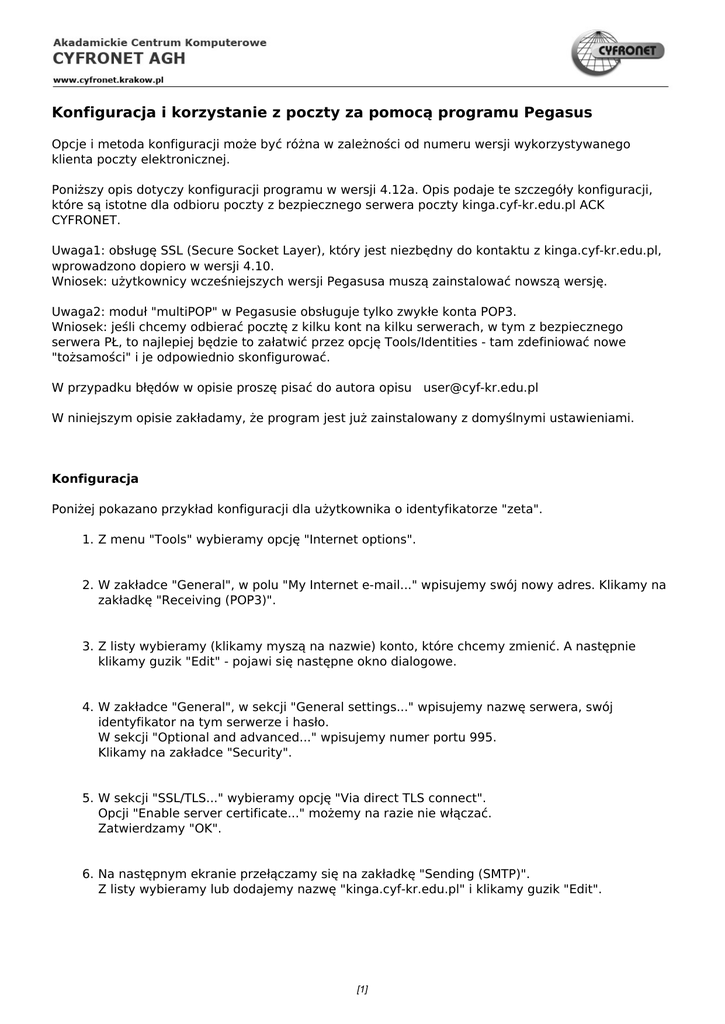 Konfiguracja i korzystanie z poczty za pomocą programu Pegasus Opcje i metoda konfiguracji może być różna w zależności od numeru wersji wykorzystywanego klienta poczty elektronicznej. Poniższy opis dotyczy konfiguracji programu w wersji 4.12a. Opis podaje te szczegóły konfiguracji, które są istotne dla odbioru poczty z bezpiecznego serwera poczty kinga.cyf-kr.edu.pl ACK CYFRONET. Uwaga1: obsługę SSL (Secure Socket Layer), który jest niezbędny do kontaktu z kinga.cyf-kr.edu.pl, wprowadzono dopiero w wersji 4.10. Wniosek: użytkownicy wcześniejszych wersji Pegasusa muszą zainstalować nowszą wersję. Uwaga2: moduł "multiPOP" w Pegasusie obsługuje tylko zwykłe konta POP3. Wniosek: jeśli chcemy odbierać pocztę z kilku kont na kilku serwerach, w tym z bezpiecznego serwera PŁ, to najlepiej będzie to załatwić przez opcję Tools/Identities - tam zdefiniować nowe "tożsamości" i je odpowiednio skonfigurować. W przypadku błędów w opisie proszę pisać do autora opisu [email protected] W niniejszym opisie zakładamy, że program jest już zainstalowany z domyślnymi ustawieniami. Konfiguracja Poniżej pokazano przykład konfiguracji dla użytkownika o identyfikatorze "zeta". 1. Z menu "Tools" wybieramy opcję "Internet options". 2. W zakładce "General", w polu "My Internet e-mail..." wpisujemy swój nowy adres. Klikamy na zakładkę "Receiving (POP3)". 3. Z listy wybieramy (klikamy myszą na nazwie) konto, które chcemy zmienić. A następnie klikamy guzik "Edit" - pojawi się następne okno dialogowe. 4. W zakładce "General", w sekcji "General settings..." wpisujemy nazwę serwera, swój identyfikator na tym serwerze i hasło. W sekcji "Optional and advanced..." wpisujemy numer portu 995. Klikamy na zakładce "Security". 5. W sekcji "SSL/TLS..." wybieramy opcję "Via direct TLS connect". Opcji "Enable server certificate..." możemy na razie nie włączać. Zatwierdzamy "OK". 6. Na następnym ekranie przełączamy się na zakładkę "Sending (SMTP)". Z listy wybieramy lub dodajemy nazwę "kinga.cyf-kr.edu.pl" i klikamy guzik "Edit". [1] 7. W zakładce "General" nie trzeba nic zmieniać, ale upewnić się trzeba czy wybrane są właściwe wartości. Przełączamy się na zakładkę "Security". 8. W sekcji "SSL/TLS ..." wybieramy "Via STARTTLS" oraz można wybrać "Enable server certificate ...". W sekcji "SMTP Authentication" wybieramy opcję "Login to the SMTP server using the following details" i wpisujemy swój identyfikator i hasło. Zatwierdzamy "OK". 9. Następne okno dialogowe zatwierdzamy "OK". To w zasadzie koniec. Powinniśmy teraz spróbować odebrać pocztę - ikonka wskazana na obrazku poniżej: 10. oraz wysłać pocztę – ikonka z lewej. Po wysłaniu należy, po upływie 30 sekund, spróbować odebrać pocztę – okaże się czy serwer nie zwraca nam poczty z komunikatem "550 Relying denied". Jeśli tak będzie, należy dokładnie sprawdzić wszystkie opcje. Gratulacje. Program jest prawidłowo zainstalowany i skonfigurowany do odbioru poczty z serwera kinga.cyf-kr.edu.pl [2] Powered by TCPDF (www.tcpdf.org)
