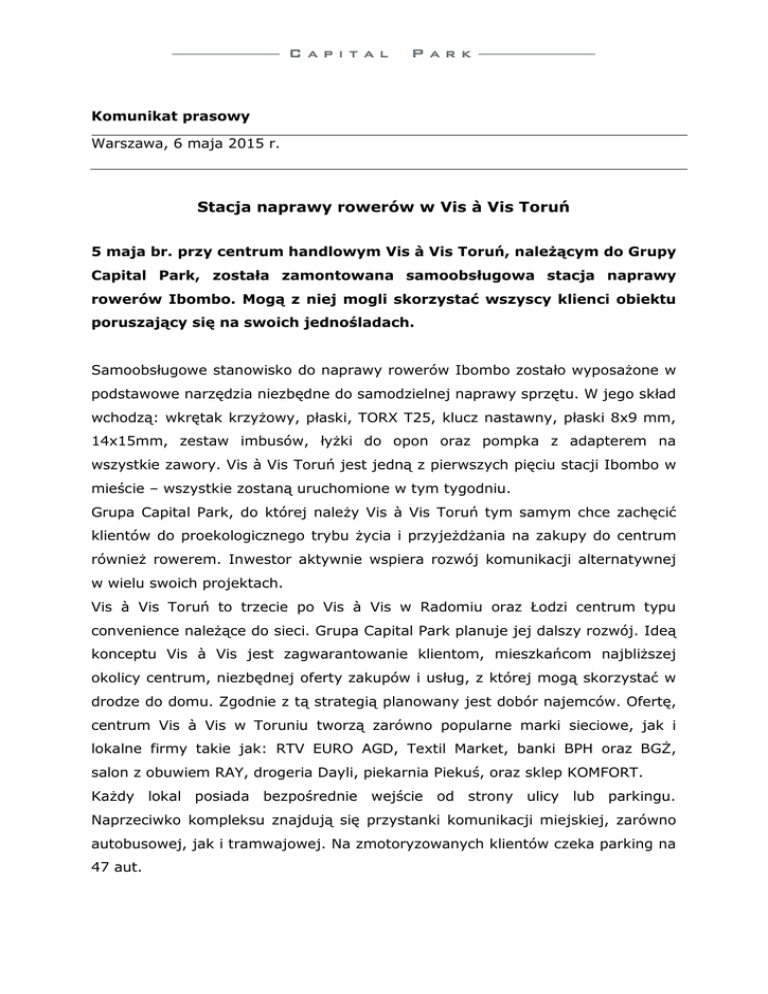 Komunikat prasowy Warszawa, 6 maja 2015 r. INFORMACJA PRASOWA Stacja naprawy rowerów w Vis à Vis Toruń 5 maja br. przy centrum handlowym Vis à Vis Toruń, należącym do Grupy Capital Park, została zamontowana samoobsługowa stacja naprawy rowerów Ibombo. Mogą z niej mogli skorzystać wszyscy klienci obiektu poruszający się na swoich jednośladach. Samoobsługowe stanowisko do naprawy rowerów Ibombo zostało wyposażone w podstawowe narzędzia niezbędne do samodzielnej naprawy sprzętu. W jego skład wchodzą: wkrętak krzyżowy, płaski, TORX T25, klucz nastawny, płaski 8x9 mm, 14x15mm, zestaw imbusów, łyżki do opon oraz pompka z adapterem na wszystkie zawory. Vis à Vis Toruń jest jedną z pierwszych pięciu stacji Ibombo w mieście – wszystkie zostaną uruchomione w tym tygodniu. Grupa Capital Park, do której należy Vis à Vis Toruń tym samym chce zachęcić klientów do proekologicznego trybu życia i przyjeżdżania na zakupy do centrum również rowerem. Inwestor aktywnie wspiera rozwój komunikacji alternatywnej w wielu swoich projektach. Vis à Vis Toruń to trzecie po Vis à Vis w Radomiu oraz Łodzi centrum typu convenience należące do sieci. Grupa Capital Park planuje jej dalszy rozwój. Ideą konceptu Vis à Vis jest zagwarantowanie klientom, mieszkańcom najbliższej okolicy centrum, niezbędnej oferty zakupów i usług, z której mogą skorzystać w drodze do domu. Zgodnie z tą strategią planowany jest dobór najemców. Ofertę, centrum Vis à Vis w Toruniu tworzą zarówno popularne marki sieciowe, jak i lokalne firmy takie jak: RTV EURO AGD, Textil Market, banki BPH oraz BGŻ, salon z obuwiem RAY, drogeria Dayli, piekarnia Piekuś, oraz sklep KOMFORT. Każdy lokal posiada bezpośrednie wejście od strony ulicy lub parkingu. Naprzeciwko kompleksu znajdują się przystanki komunikacji miejskiej, zarówno autobusowej, jak i tramwajowej. Na zmotoryzowanych klientów czeka parking na 47 aut. Dodatkowe informacje: Capital Park Grupa Capital Park jest doświadczonym i aktywnym inwestorem i deweloperem działającym na rynku nieruchomości w Polsce od ponad dziesięciu lat, specjalizującym się w wyszukiwaniu i wykorzystywaniu okazji rynkowych (ang. opportunistic investor). Głównym przedmiotem działalności Grupy jest nabywanie nieruchomości ze znacznym potencjałem budowy wartości, np. poprzez zmianę warunków zagospodarowania przestrzennego lub uzyskanie pozwolenia na budowę, budowę nowych lub przebudowę istniejących obiektów, lub poprawę zarządzania istniejącymi budynkami. Capital Park osiąga dochody z najmu oraz ze sprzedaży nieruchomości lub produktów inwestycyjnych opartych na nieruchomościach. Grupa aktywnie poszukuje możliwości zakupu nowych projektów nieruchomościowych oraz nowych źródeł dochodów i wzrostu wartości w obszarach rynku charakteryzujących się dużym potencjałem rozwoju. Od rozpoczęcia działalności w 2003 roku Grupa przeprowadziła ponad 100 transakcji inwestycyjnych i zarządza portfelem nieruchomości obejmującym 75 projektów o łącznej powierzchni wynajmu brutto ok. 250 tys. mkw., zlokalizowanych w 37 miastach. Spośród tych projektów 39 nieruchomości handlowych typu high-street znajduje się w strukturze nowo utworzonego, innowacyjnego na polskim rynku Real Estate Income Assets FIZ AN, którym Grupa aktywnie zarządza i w którym posiada 15-proc. udział. Na dzień 31 grudnia 2014 r. bieżąca wartość portfela nieruchomości zarządzanych przez Grupę wynosiła 1,6 mld zł. Na dzień 31 grudnia 2014 r. 79% bieżącej wartości portfela Grupy stanowiły nieruchomości w Warszawie, czyli na największym i jednym z najbardziej perspektywicznych rynków nieruchomości komercyjnych w Polsce. Biuro prasowe Capital Park Katarzyna Mituła tel. 0 48 22 642 24 16, + 48 783 23 83 83 email: [email protected]