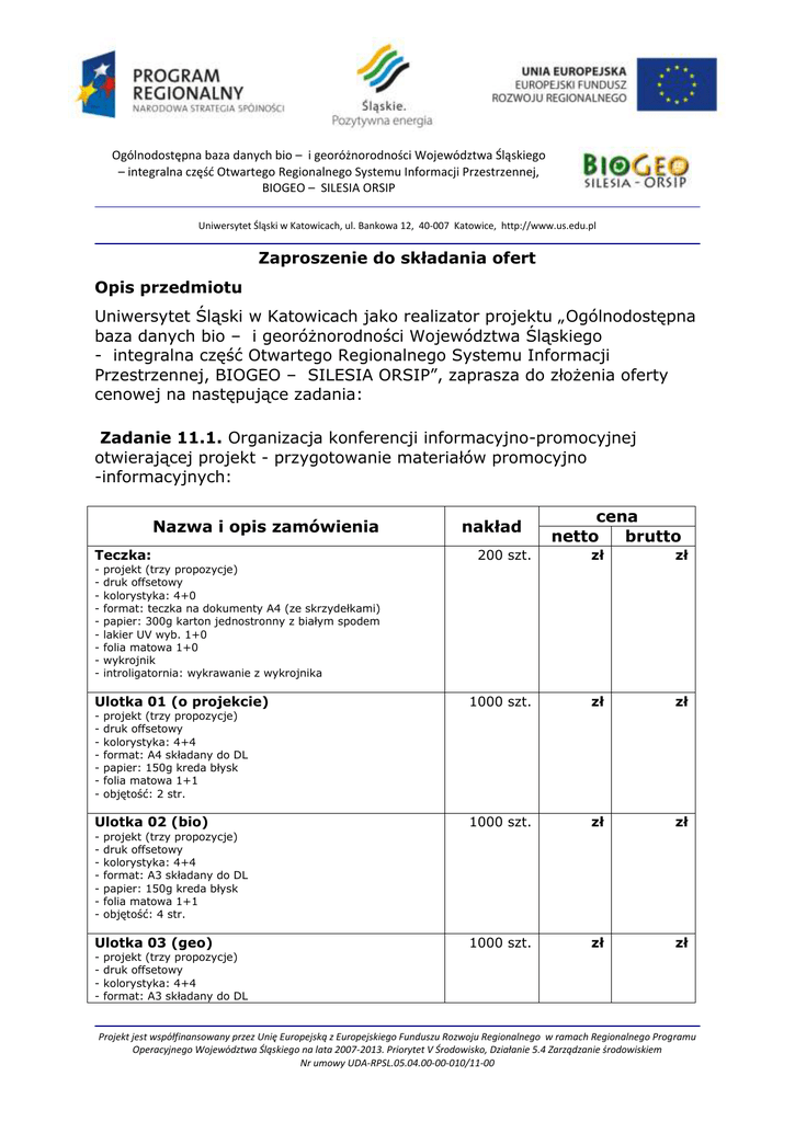 Ogólnodostępna baza danych bio – i georóżnorodności Województwa Śląskiego – integralna część Otwartego Regionalnego Systemu Informacji Przestrzennej, BIOGEO – SILESIA ORSIP Uniwersytet Śląski w Katowicach, ul. Bankowa 12, 40-007 Katowice, http://www.us.edu.pl Zaproszenie do składania ofert Opis przedmiotu Uniwersytet Śląski w Katowicach jako realizator projektu „Ogólnodostępna baza danych bio – i georóżnorodności Województwa Śląskiego - integralna część Otwartego Regionalnego Systemu Informacji Przestrzennej, BIOGEO – SILESIA ORSIP”, zaprasza do złożenia oferty cenowej na następujące zadania: Zadanie 11.1. Organizacja konferencji informacyjno-promocyjnej otwierającej projekt - przygotowanie materiałów promocyjno -informacyjnych: Nazwa i opis zamówienia Teczka: - zł zł 1000 szt. zł zł 1000 szt. zł zł 1000 szt. zł zł projekt (trzy propozycje) druk offsetowy kolorystyka: 4+4 format: A3 składany do DL papier: 150g kreda błysk folia matowa 1+1 objętość: 4 str. Ulotka 03 (geo) - 200 szt. projekt (trzy propozycje) druk offsetowy kolorystyka: 4+4 format: A4 składany do DL papier: 150g kreda błysk folia matowa 1+1 objętość: 2 str. Ulotka 02 (bio) - cena netto brutto projekt (trzy propozycje) druk offsetowy kolorystyka: 4+0 format: teczka na dokumenty A4 (ze skrzydełkami) papier: 300g karton jednostronny z białym spodem lakier UV wyb. 1+0 folia matowa 1+0 wykrojnik introligatornia: wykrawanie z wykrojnika Ulotka 01 (o projekcie) - nakład projekt (trzy propozycje) druk offsetowy kolorystyka: 4+4 format: A3 składany do DL Projekt jest współfinansowany przez Unię Europejską z Europejskiego Funduszu Rozwoju Regionalnego w ramach Regionalnego Programu Operacyjnego Województwa Śląskiego na lata 2007-2013. Priorytet V Środowisko, Działanie 5.4 Zarządzanie środowiskiem Nr umowy UDA-RPSL.05.04.00-00-010/11-00 Ogólnodostępna baza danych bio – i georóżnorodności Województwa Śląskiego – integralna część Otwartego Regionalnego Systemu Informacji Przestrzennej, BIOGEO – SILESIA ORSIP Uniwersytet Śląski w Katowicach, ul. Bankowa 12, 40-007 Katowice, http://www.us.edu.pl - papier: 150g kreda błysk - folia matowa 1+1 - objętość: 4 str. Ulotka 04 (tereny zalewowe) - Notatnik A4 - 1000 szt. zł zł 200 bloków zł zł 200 szt. zł zł projekt (trzy propozycje) druk offsetowy kolorystyka: 4+4 format: A3 składany do DL papier: 150g kreda błysk folia matowa 1+1 objętość: 4 str. projekt (trzy propozycje) druk offsetowy introligatornia: klejenie po krótkim boku kolorystyka: 4+0 format: A4 papier: 90g offset objętość: 20 kartek w bloku Długopis - np. firmy Lecce Pen X-EIGHT http://www.leccepen.com.pl/truly-promotional/x-eightfantazja.html - korpus: pomarańczowy/żółty - skuwka: zielona - mechanizm: automat - tusz: czarny - nadruk: dwustronny czarny 1+1 (logo RPO WSL + www.biogeo.us.edu.pl) Zadanie 11.4. Naklejki informacyjne z projektem graficznym - promocja projektu: Nazwa i opis zamówienia Naklejki 3D małe - cena netto brutto 75 szt. zł zł 100 szt. zł zł projekt graficzny kolorystyka: 4+0 format: 70x35mm wypukłe, 3D Naklejki 3D duże - nakład projekt graficzny kolorystyka: 4+0 format: 100x50mm wypukłe, 3D Projekt jest współfinansowany przez Unię Europejską z Europejskiego Funduszu Rozwoju Regionalnego w ramach Regionalnego Programu Operacyjnego Województwa Śląskiego na lata 2007-2013. Priorytet V Środowisko, Działanie 5.4 Zarządzanie środowiskiem Nr umowy UDA-RPSL.05.04.00-00-010/11-00 Ogólnodostępna baza danych bio – i georóżnorodności Województwa Śląskiego – integralna część Otwartego Regionalnego Systemu Informacji Przestrzennej, BIOGEO – SILESIA ORSIP Uniwersytet Śląski w Katowicach, ul. Bankowa 12, 40-007 Katowice, http://www.us.edu.pl Naklejki - 825 szt. zł zł projekt graficzny kolorystyka: 4+0 format: 70x35mm papier: samoprzylepny błysk Zadanie 11.2. Utworzenie strony internetowej - projekt graficzny, budowa i rozbudowa – etap I + etap II: Etap I – projekt graficzny i budowa (termin realizacji 1 miesiąc od podpisania umowy na realizacje usługi) projekt graficzny strony internetowej – strony głównej i przykładowej podstrony (po trzy propozycje); projekt funkcjonalny strony internetowej; instalacja i konfiguracja wybranych modułów systemu zarządzania treścią CMS (administratorzy + użytkownicy i ich prawa, aktualności, ankiety/formularze/sondy, galeria/zdjęcia, języki (min. PL+ENG), kopia zapasowa, linki, menu główne, menu lewe/prawe, obrazki/zdjęcia na stronie głównej, parametry konfigurujące system, w tym adres email na który będą przychodziły formularze kontaktowe, pliki do pobrania, reklama, newsletter, strony); galeria powinna umożliwiać: dodawanie, kasowanie i edycja katalogów zdjęć konfiguracja katalogów zdjęć - opcje: o nazwa katalogu o opis katalogu o rozmiar, do jakiego ma się zmniejszać miniaturka o rozmiar, do jakiego ma się zmniejszać zdjęcie o wybór zdjęcia tytułowego dla katalogu o kolejność katalogu w spisie katalogów dodawanie, kasowanie i edycja albumów zdjęć konfiguracja albumów zdjęć - opcje: o nazwa albumu o opis albumu o liczba kolumn i wierszy o ustawienie widoczności albumu (widoczny/niewidoczny) o ustawianie możliwości komentowania zdjęć w albumie o ustawianie możliwości oceniania zdjęć w albumie o wybór zdjęcia tytułowego dla albumu Projekt jest współfinansowany przez Unię Europejską z Europejskiego Funduszu Rozwoju Regionalnego w ramach Regionalnego Programu Operacyjnego Województwa Śląskiego na lata 2007-2013. Priorytet V Środowisko, Działanie 5.4 Zarządzanie środowiskiem Nr umowy UDA-RPSL.05.04.00-00-010/11-00 Ogólnodostępna baza danych bio – i georóżnorodności Województwa Śląskiego – integralna część Otwartego Regionalnego Systemu Informacji Przestrzennej, BIOGEO – SILESIA ORSIP Uniwersytet Śląski w Katowicach, ul. Bankowa 12, 40-007 