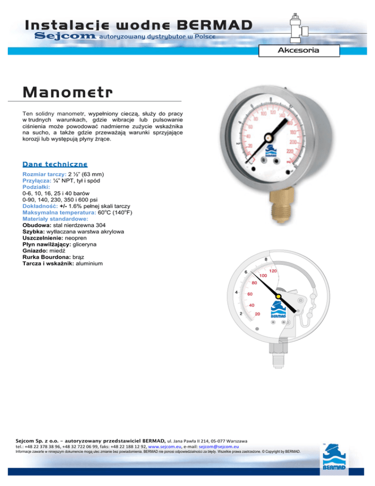 Instalacje wodne BERMAD Sejcom autoryzowany dystrybutor w Polsce Akcesoria Manometr Ten solidny manometr, wypełniony cieczą, służy do pracy w trudnych warunkach, gdzie wibracje lub pulsowanie ciśnienia może powodować nadmierne zużycie wskaźnika na sucho, a także gdzie przeważają warunki sprzyjające korozji lub występują płyny żrące. Dane techniczne Rozmiar tarczy: 2 ½” (63 mm) Przyłącza: ¼” NPT, tył i spód Podziałki: 0-6, 10, 16, 25 i 40 barów 0-90, 140, 230, 350 i 600 psi Dokładność: +/- 1.6% pełnej skali tarczy Maksymalna temperatura: 60oC (140oF) Materiały standardowe: Obudowa: stal nierdzewna 304 Szybka: wytłaczana warstwa akrylowa Uszczelnienie: neopren Płyn nawilżający: gliceryna Gniazdo: miedź Rurka Bourdona: brąz Tarcza i wskaźnik: aluminium Sejcom Sp. z o.o. - autoryzowany przedstawiciel BERMAD, ul. Jana Pawła II 214, 05-‐077 Warszawa tel.: +48 22 378 38 96, +48 32 722 06 99, faks: +48 22 188 12 92, www.sejcom.eu, e-‐mail: [email protected] Informacje zawarte w niniejszym dokumencie mogą ulec zmianie bez powiadomienia. BERMAD nie ponosi odpowiedzialności za błędy. Wszelkie prawa zastrzeżone. © Copyright by BERMAD.