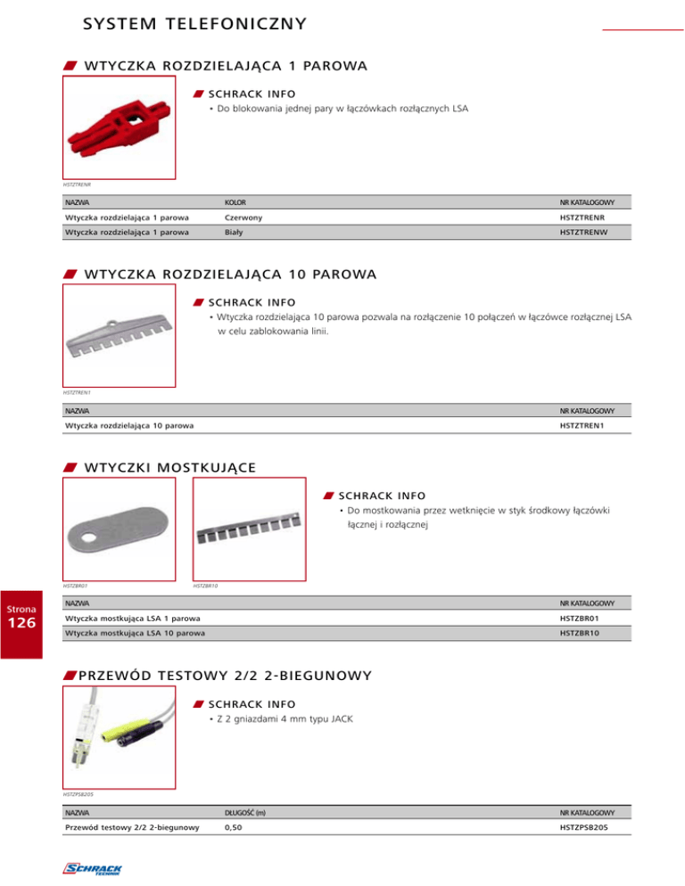 SYSTEM TELEFONICZNY W WTYCZKA ROZDZIELAJĄCA 1 PAROWA W SCHRACK INFO • Do blokowania jednej pary w łączówkach rozłącznych LSA HSTZTRENR NAZWA KOLOR NR KATALOGOWY Wtyczka rozdzielająca 1 parowa Czerwony HSTZTRENR Wtyczka rozdzielająca 1 parowa Biały HSTZTRENW W WTYCZKA ROZDZIELAJĄCA 10 PAROWA W SCHRACK INFO • Wtyczka rozdzielająca 10 parowa pozwala na rozłączenie 10 połączeń w łączówce rozłącznej LSA w celu zablokowania linii. HSTZTREN1 NAZWA NR KATALOGOWY Wtyczka rozdzielająca 10 parowa HSTZTREN1 W WTYCZKI MOSTKUJĄCE W SCHRACK INFO • Do mostkowania przez wetknięcie w styk środkowy łączówki łącznej i rozłącznej HSTZBR01 Strona 126 HSTZBR10 NAZWA NR KATALOGOWY Wtyczka mostkująca LSA 1 parowa HSTZBR01 Wtyczka mostkująca LSA 10 parowa HSTZBR10 WPRZEWÓD TESTOWY 2/2 2-BIEGUNOWY W SCHRACK INFO • Z 2 gniazdami 4 mm typu JACK HSTZPSB205 NAZWA DŁUGOŚĆ (m) NR KATALOGOWY Przewód testowy 2/2 2-biegunowy 0,50 HSTZPSB205