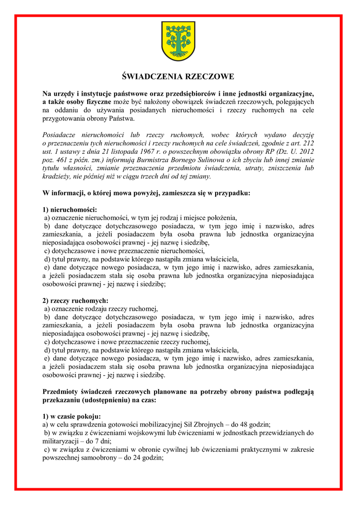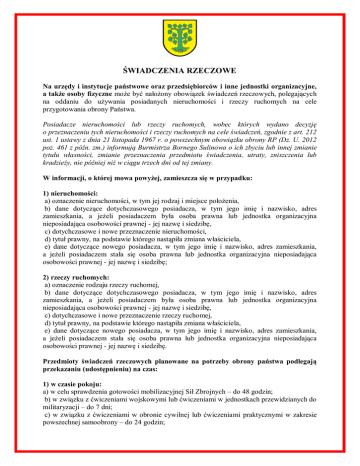 ŚWIADCZENIA RZECZOWE Na urzędy i instytucje państwowe oraz przedsiębiorców i inne jednostki organizacyjne, a także osoby fizyczne może być nałożony obowiązek świadczeń rzeczowych, polegających na oddaniu do używania posiadanych nieruchomości i rzeczy ruchomych na cele przygotowania obrony Państwa. Posiadacze nieruchomości lub rzeczy ruchomych, wobec których wydano decyzję o przeznaczeniu tych nieruchomości i rzeczy ruchomych na cele świadczeń, zgodnie z art. 212 ust. 1 ustawy z dnia 21 listopada 1967 r. o powszechnym obowiązku obrony RP (Dz. U. 2012 poz. 461 z późn. zm.) informują Burmistrza Bornego Sulinowa o ich zbyciu lub innej zmianie tytułu własności, zmianie przeznaczenia przedmiotu świadczenia, utraty, zniszczenia lub kradzieży, nie później niż w ciągu trzech dni od tej zmiany. W informacji, o której mowa powyżej, zamieszcza się w przypadku: 1) nieruchomości: a) oznaczenie nieruchomości, w tym jej rodzaj i miejsce położenia, b) dane dotyczące dotychczasowego posiadacza, w tym jego imię i nazwisko, adres zamieszkania, a jeżeli posiadaczem była osoba prawna lub jednostka organizacyjna nieposiadająca osobowości prawnej - jej nazwę i siedzibę, c) dotychczasowe i nowe przeznaczenie nieruchomości, d) tytuł prawny, na podstawie którego nastąpiła zmiana właściciela, e) dane dotyczące nowego posiadacza, w tym jego imię i nazwisko, adres zamieszkania, a jeżeli posiadaczem stała się osoba prawna lub jednostka organizacyjna nieposiadająca osobowości prawnej - jej nazwę i siedzibę; 2) rzeczy ruchomych: a) oznaczenie rodzaju rzeczy ruchomej, b) dane dotyczące dotychczasowego posiadacza, w tym jego imię i nazwisko, adres zamieszkania, a jeżeli posiadaczem była osoba prawna lub jednostka organizacyjna nieposiadająca osobowości prawnej - jej nazwę i siedzibę, c) dotychczasowe i nowe przeznaczenie rzeczy ruchomej, d) tytuł prawny, na podstawie którego nastąpiła zmiana właściciela, e) dane dotyczące nowego posiadacza, w tym jego imię i nazwisko, adres zamieszkania, a jeżeli posiadaczem stała się osoba prawna lub jednostka organizacyjna nieposiadająca osobowości prawnej - jej nazwę i siedzibę. Przedmioty świadczeń rzeczowych planowane na potrzeby obrony państwa podlegają przekazaniu (udostępnieniu) na czas: 1) w czasie pokoju: a) w celu sprawdzenia gotowości mobilizacyjnej Sił Zbrojnych – do 48 godzin; b) w związku z ćwiczeniami wojskowymi lub ćwiczeniami w jednostkach przewidzianych do militaryzacji – do 7 dni; c) w związku z ćwiczeniami w obronie cywilnej lub ćwiczeniami praktycznymi w zakresie powszechnej samoobrony – do 24 godzin; 2) w razie ogłoszenia mobilizacji i w czasie wojny – do chwili ustania potrzeby ich używania Przedmiotem świadczeń rzeczowych nie mogą być: 1) tereny, pomieszczenia, środki transportowe, maszyny i inny sprzęt, znajdujące się w posiadaniu: a) jednostek organizacyjnych służących bezpośrednio działalności Sejmu i Senatu Rzeczypospolitej Polskiej, Kancelarii Prezydenta Rzeczypospolitej Polskiej, Kancelarii Prezesa Rady Ministrów, ministerstw i urzędów wojewódzkich oraz Narodowego Banku Polskiego i banków, a także Państwowej Wytwórni Papierów Wartościowych i Mennicy Państwowej, b) jednostek organizacyjnych podległych, podporządkowanych lub nadzorowanych odpowiednio przez Ministra Obrony Narodowej, Ministra Sprawiedliwości, ministra właściwego do spraw wewnętrznych, Szefa Agencji Bezpieczeństwa Wewnętrznego, Szefa Agencji Wywiadu oraz Szefa Centralnego Biura Antykorupcyjnego, c) przedstawicielstw dyplomatycznych i urzędów konsularnych państw obcych oraz innych przedstawicielstw i instytucji zrównanych z nimi w zakresie przywilejów i immunitetów na mocy ustaw, umów lub powszechnie ustalonych zwyczajów międzynarodowych, jak również członków tych przedstawicielstw, urzędów i instytucji oraz członków ich rodzin, a także innych osób zrównanych z nimi w zakresie przywilejów i immunitetów, jeżeli nie posiadają obywatelstwa polskiego; 2) biblioteki, muzea, archiwa i zabytki uznane przez Prezydenta Rzeczypospolitej Polskiej za pomniki historii oraz dobra kulturalne, o których mowa w art. 218 ustawy, oraz obiekty wpisane na „listę dziedzictwa światowego” na podstawie Konwencji w sprawie ochrony światowego dziedzictwa kulturalnego i naturalnego, przyjętej w Paryżu dnia 16 listopada 1972 r. (Dz. U. z 1976 r. Nr 32, poz. 190 i 191); 3) zbiory naukowe i artystyczne mające charakter publiczny; 4) świątynie, domy modlitwy oraz pomieszczenia kościołów i innych związków wyznaniowych mających osobowość prawną, wraz ze znajdującymi się w nich przedmiotami przeznaczonymi do wykonywania kultu religijnego; 5) przedmioty wyłączone spod egzekucji stosownie do przepisów ustawy z dnia 17 czerwca 1966 r. o postępowaniu egzekucyjnym w administracji (Dz. U. 2014 r. poz. 1619), z wyjątkiem narzędzi prostych oraz środków transportowych; 6) parki narodowe i rezerwaty przyrody; 7) przedszkola, domy dziecka, zakłady opiekuńczo-wychowawcze, szkoły specjalne i internaty tych szkół, specjalne ośrodki wychowawcze i szkolno-wychowawcze oraz poradnie psychologiczno-pedagogiczne; 8) urządzenia i sieci telekomunikacyjne: a) ujęte w planach działania operatorów publicznych na wypadek sytuacji szczególnych zagrożeń, sporządzonych w trybie określonym w art. 64 ust. 3 ustawy z dnia 21 lipca 2000 r. – Prawo telekomunikacyjne (Dz. U. 2014 poz. 243 z późn. zm.), przewidziane do użycia na potrzeby jednostek organizacyjnych, o których mowa w ust. 2, b) niezbędne do wykonania decyzji nałożonych na operatorów telekomunikacyjnych przez ministra właściwego do spraw łączności w trybie określonym w art. 66 ust. 1 ustawy z dnia 21 lipca 2000 r. – Prawo telekomunikacyjne); 9) pojazdy samochodowe niedopuszczone do ruchu po drogach publicznych oraz używane wyłącznie do przewozu wewnątrz zakładu, po pr