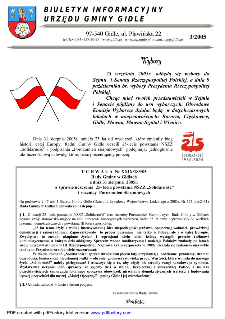 BIULETYN INFORMACYJNY URZĘDU GMINY GIDLE 97-540 Gidle, ul. Pławińska 22 tel./fax (034) 327-20-27 www.gidle.pl www.bip.gidle.pl e-mail: [email protected] 3/2005 Wybory 25 września 2005r. odbędą się wybory do Sejmu i Senatu Rzeczypospolitej Polskiej, a dnia 9 października br. wybory Prezydenta Rzeczypospolitej Polskiej. Chcąc mieć swoich przedstawicieli w Sejmie i Senacie pójdźmy do urn wyborczych. Obwodowe Komisje Wyborcze działać będą w dotychczasowych lokalach w miejscowościach: Borowa, Ciężkowice, Gidle, Pławno, Pławno-Szpital i Włynice. Dnia 31 sierpnia 2005r. minęło 25 lat od wydarzeń, które zmieniły bieg historii całej Europy. Radni Gminy Gidle uczcili 25-lecie powstania NSZZ „Solidarność” i podpisania „Porozumień sierpniowych” podejmując jednogłośnie okolicznościową uchwałę, której treść prezentujemy poniżej. U C H W A Ł A Nr XXIX/183/05 Rady Gminy w Gidlach z dnia 31 sierpnia 2005r. w sprawie uczczenia 25- lecia powstania NSZZ „Solidarność” i rocznicy Porozumień Sierpniowych Na podstawie § 47 ust. 1 Statutu Gminy Gidle (Dziennik Urzędowy Województwa Łódzkiego z 2003r. Nr 275 poz.2431) Rada Gminy w Gidlach uchwala co następuje : § 1. Z okazji 25- lecia powstania NSZZ „Solidarność” oraz rocznicy Porozumień Sierpniowych, Rada Gminy w Gidlach wyraża swoje stanowisko mające na celu uczczenie historycznych wydarzeń, które 25 lat temu doprowadziły do wielkich przemian demokratycznych i powstania III Rzeczypospolitej. „25 lat temu ożyły z wielką intensywnością idee niepodległości państwa, społecznej wolności, prawdziwej demokracji i samorządności. Zapoczątkowało to proces przemian nie tylko w Polsce, ale i w całej Europie. Zwycięstwo to zostało okupione życiem i represjami wielu ludzi, którzy wystąpili przeciw reżimowi komunistycznemu, a którym dziś oddajemy Sprzeciw wobec totalitaryzmu i nadzieje Polaków znalazły po latach swoje urzeczywistnienie w III Rzeczypospolitej. Naprawa kraju rozpoczęta w 1989r. okazała się zadaniem niezwykle trudnym. Przyniosła za sobą wiele rozczarowań. Wielkość dokonań „Solidarności” sprzed dwudziestu pięciu laty przysłaniają codzienne problemy, dramat bezrobocia, konieczność nieustannej walki w obronie godności człowieka pracy. Wartości, które wniosła do naszego życia „Solidarność” należy pielęgnować i troszczyć się o to, aby nigdy nie straciły rangi narodowego symbolu. Wydarzenia sierpnia ’80r. sprawiły, że żyjemy dziś w wolnej, bezpiecznej i suwerennej Polsce, a na nas przedstawicielach samorządu lokalnego spoczywa obowiązek utrwalania demokratycznych wartości i budowania lepszej przyszłości dla naszej „Małej Ojczyzny” - gminy Gidle i jej mieszkańców”. § 2. Uchwała wchodzi w życie z dniem podjęcia. Przewodnicząca Rady Gminy 1 PDF created with pdfFactory trial version www.pdffactory.com Gminne inwestycje Zakończona została wymiana stolarki okiennej przez firmę „Tados – Firek” z Radomska. Wymieniono okna w budynkach: Szkoły Podstawowej w Ciężkowicach, SPZOZ w Gidlach, Przedszkolach w Gidlach i Pławnie, świetlic w Gowarzowie i Pławnie oraz Urzędu Gminy. Łącznie wymieniono 25 sztuk okien za kwotę 26 951,02 zł. ۩ Z początkiem września oddano do użytku chodnik na ulicy Przedborskiej w Pławnie. Inwestycja poprawi bezpieczeństwo dzieci i młodzieży uczęszczających do Zespołu Szkolno – Gimnazjalnego w Pławnie. Wykonawcą była firma „Poziom” z Radomska, a inwestycję sfinansował Urząd Gminy w Gidlach wspierany przez Starostwo Powiatowe w Radomsku. W miesiącu wrześniu i październiku br. przeprowadzony zostanie remont mostu na Kanale Lodowym w miejscowości Michałopol, który przeprowadzi Przedsiębiorstwo Robót Inżynieryjnych „KAMPOL” z Kamyka. Łączny koszt remontu wyniesie: 67 980,72 zł. Przepraszamy mieszkańców za czasowe utrudnienia w ruchu drogowym. ۩ Rozpoczęto prace przy II etapie „Budowy ciągu rowerowo-pieszego” miedzy Pławnem i Gidlami. Wykonawcą jest firma „Poziom” E. Mądry z Radomska. Za wsparcie przy realizacji tak potrzebnej inwestycji dziękujemy Marszałkowi Województwa Łodzkiego Panu Stanisławowi Witaszczykowi oraz Zarządowi Dróg Wojewódzkich w Łodzi. Wykonawcą jest firma „Poziom” E. Mądry z Radomska ۩ W wyniku przetargu na zakup opału – węgla typu: „orzech” na sezon grzewczy 2005/06r., dla jednostek podległych Gminie Gidle wybrano firmę „PROHURT” s.c. Anna i Leszek Siemińscy Pławno, ul. Radomszczańska 23, która przedstawiła najkorzystniejszą ofertę. Programy dla osób bezrobotnych realizowane w GCI w Gidlach Gminne Centrum Informacji w Gidlach jest w trakcie realizacji programów dla osób bezrobotnych, opracowanych w ramach projektu rozwoju GCI. Środki na ten cel zostały pozyskane z IV edycji grantu Ministerstwa Gospodarki i Pracy na tworzenie i rozwój Gminnych Centrów Informacji. Obecnie trwają spotkania aktywizacyjne grupy długotrwale bezrobotnych mężczyzn mających problemy w znalezieniu pracy i nadużywających alkoholu, w których uczestniczy 13 osób. Zajęcia prowadzone są w poniedziałki i środy. Panowie korzystają z pomocy psychologa, terapeuty leczenia uzależnień oraz doradcy zawodowego. Spotkania mają na celu poprawę kondycji psychicznej, dowartościowanie własnej osoby, wyjście z marazmu społecznego, jak również poprawę wzajemnych relacji w gronie rodzinnym. Dodatkowym elementem programu jest „resocjalizacja poprzez pracę” na rzecz gospodarki komunalnej gminy Gidle. Mężczyźni uczestniczący w programie zawarli kontrakty socjalne, w myśl których mają przepracować po 72h każdy, za co otrzymają zasiłek celowy w kwocie 200zł. Planowany termin zakończenia programu 15 października. Jednocześnie zapraszamy osoby bezrobotne pragnące podnieść swoje kwalifikacje do udziału w szkoleniu z zakresu prowadzenia własnej działalności gospodarcze