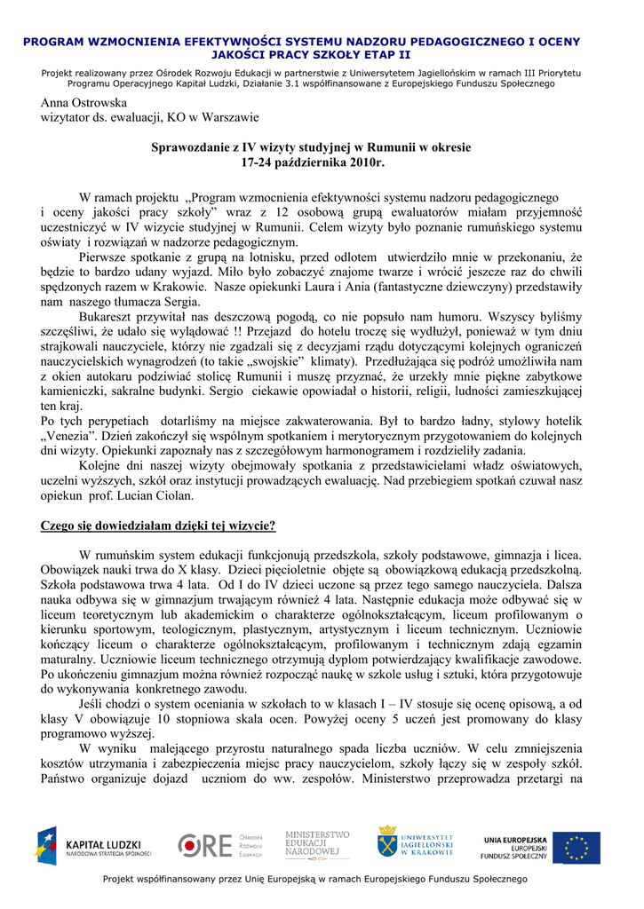PROGRAM WZMOCNIENIA EFEKTYWNOŚCI SYSTEMU NADZORU PEDAGOGICZNEGO I OCENY JAKOŚCI PRACY SZKOŁY ETAP II Projekt realizowany przez Ośrodek Rozwoju Edukacji w partnerstwie z Uniwersytetem Jagiellońskim w ramach III Priorytetu Programu Operacyjnego Kapitał Ludzki, Działanie 3.1 współfinansowane z Europejskiego Funduszu Społecznego Anna Ostrowska wizytator ds. ewaluacji, KO w Warszawie Sprawozdanie z IV wizyty studyjnej w Rumunii w okresie 17-24 października 2010r. W ramach projektu „Program wzmocnienia efektywności systemu nadzoru pedagogicznego i oceny jakości pracy szkoły” wraz z 12 osobową grupą ewaluatorów miałam przyjemność uczestniczyć w IV wizycie studyjnej w Rumunii. Celem wizyty było poznanie rumuńskiego systemu oświaty i rozwiązań w nadzorze pedagogicznym. Pierwsze spotkanie z grupą na lotnisku, przed odlotem utwierdziło mnie w przekonaniu, że będzie to bardzo udany wyjazd. Miło było zobaczyć znajome twarze i wrócić jeszcze raz do chwili spędzonych razem w Krakowie. Nasze opiekunki Laura i Ania (fantastyczne dziewczyny) przedstawiły nam naszego tłumacza Sergia. Bukareszt przywitał nas deszczową pogodą, co nie popsuło nam humoru. Wszyscy byliśmy szczęśliwi, że udało się wylądować !! Przejazd do hotelu troczę się wydłużył, ponieważ w tym dniu strajkowali nauczyciele, którzy nie zgadzali się z decyzjami rządu dotyczącymi kolejnych ograniczeń nauczycielskich wynagrodzeń (to takie „swojskie” klimaty). Przedłużająca się podróż umożliwiła nam z okien autokaru podziwiać stolicę Rumunii i muszę przyznać, że urzekły mnie piękne zabytkowe kamieniczki, sakralne budynki. Sergio ciekawie opowiadał o historii, religii, ludności zamieszkującej ten kraj. Po tych perypetiach dotarliśmy na miejsce zakwaterowania. Był to bardzo ładny, stylowy hotelik „Venezia”. Dzień zakończył się wspólnym spotkaniem i merytorycznym przygotowaniem do kolejnych dni wizyty. Opiekunki zapoznały nas z szczegółowym harmonogramem i rozdzieliły zadania. Kolejne dni naszej wizyty obejmowały spotkania z przedstawicielami władz oświatowych, uczelni wyższych, szkół oraz instytucji prowadzących ewaluację. Nad przebiegiem spotkań czuwał nasz opiekun prof. Lucian Ciolan. Czego się dowiedziałam dzięki tej wizycie? W rumuńskim system edukacji funkcjonują przedszkola, szkoły podstawowe, gimnazja i licea. Obowiązek nauki trwa do X klasy. Dzieci pięcioletnie objęte są obowiązkową edukacją przedszkolną. Szkoła podstawowa trwa 4 lata. Od I do IV dzieci uczone są przez tego samego nauczyciela. Dalsza nauka odbywa się w gimnazjum trwającym również 4 lata. Następnie edukacja może odbywać się w liceum teoretycznym lub akademickim o charakterze ogólnokształcącym, liceum profilowanym o kierunku sportowym, teologicznym, plastycznym, artystycznym i liceum technicznym. Uczniowie kończący liceum o charakterze ogólnokształcącym, profilowanym i technicznym zdają egzamin maturalny. Uczniowie liceum technicznego otrzymują dyplom potwierdzający kwalifikacje zawodowe. Po ukończeniu gimnazjum można również rozpocząć naukę w szkole usług i sztuki, która przygotowuje do wykonywania konkretnego zawodu. Jeśli chodzi o system oceniania w szkołach to w klasach I – IV stosuje się ocenę opisową, a od klasy V obowiązuje 10 stopniowa skala ocen. Powyżej oceny 5 uczeń jest promowany do klasy programowo wyższej. W wyniku malejącego przyrostu naturalnego spada liczba uczniów. W celu zmniejszenia kosztów utrzymania i zabezpieczenia miejsc pracy nauczycielom, szkoły łączy się w zespoły szkół. Państwo organizuje dojazd uczniom do ww. zespołów. Ministerstwo przeprowadza przetargi na Projekt współfinansowany przez Unię Europejską w ramach Europejskiego Funduszu Społecznego PROGRAM WZMOCNIENIA EFEKTYWNOŚCI SYSTEMU NADZORU PEDAGOGICZNEGO I OCENY JAKOŚCI PRACY SZKOŁY ETAP II Projekt realizowany przez Ośrodek Rozwoju Edukacji w partnerstwie z Uniwersytetem Jagiellońskim w ramach III Priorytetu Programu Operacyjnego Kapitał Ludzki, Działanie 3.1 współfinansowane z Europejskiego Funduszu Społecznego „gimbusy”. 10% wszystkich szkół stanowią przedszkola prywatne i szkoły wyższe prywatne. System finansowania oświaty jest scentralizowany i ściśle określony. System zarządzania jakością w edukacji w Rumunii jest podzielony między instytucjami: CNDIPT – Centrum Nadzoru nad szkołami zawodowymi . ARACIP - Agencja Zarządzania Jakością - sprawuje nadzór całościowy. Zajmuje się ona akredytacją szkół i ewaluacją zewnętrzną. Prowadzi krajowy rejestr niezależnych ewalutorów, którzy są czynnymi nauczycielami. Lista ta zawiera 600 nazwisk. W celu zachowania transparentności i obiektywizmu ewaluatorzy nie mogą badać szkoły z terenu swojego zamieszkania. Czas zbierania danych i wizyta w szkole trwa 1-2 dni. Czas pracy ewaluatora dostosowuje się do czasu pracy w szkole. Raport (w postaci tabelarycznej) sporządzony przez ewaluatora opisuje jeden obszar i zawiera ocenę słowną. Narzędzia badawcze są ogólnie dostępne. Raporty z ewaluacji zewnętrznej jak i wewnętrznej są obowiązkowo umieszczane na stronach internetowych. Instytut Badań i Edukacji (Institute of Educational Sciences – IES) to instytucja mająca wpływ na system jakości w edukacji rumuńskiej. Jest to jednostka samodzielna, podległa bezpośrednio Ministerstwu Edukacji Narodowej. Zajmuje się opracowywaniem i realizacją projektów edukacyjnych, przygotowywaniem narzędzi do badań, testowaniem ich, wydaniem publikacji z zakresu pomiaru, ewaluacji itp. Instytut zatrudnia najlepszych specjalistów w kraju z socjologii, psychologii, pedagogiki. Raz do roku instytut jest zobowiązany przedstawić parlamentowi raport ze swojej działalności. Inspektorat - (jest odpowiednikiem polskiego Kuratorium, a wizytatora – inspektor). Praca Inspektoratu polega przede wszystkim na prowadzeniu monitoringu