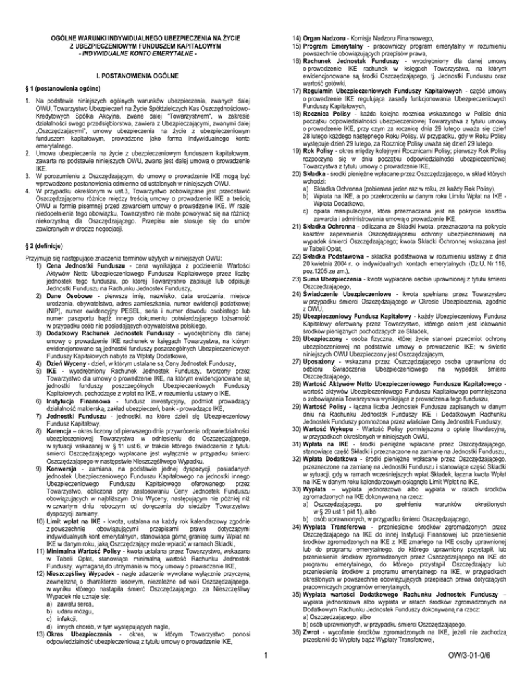 OGÓLNE WARUNKI INDYWIDUALNEGO UBEZPIECZENIA NA ŻYCIE Z UBEZPIECZENIOWYM FUNDUSZEM KAPITAŁOWYM - INDYWIDUALNE KONTO EMERYTALNE - 14) Organ Nadzoru - Komisja Nadzoru Finansowego, 15) Program Emerytalny - pracowniczy program emerytalny w rozumieniu powszechnie obowiązujących przepisów prawa, 16) Rachunek Jednostek Funduszy - wyodrębniony dla danej umowy o prowadzenie IKE rachunek w księgach Towarzystwa, na którym ewidencjonowane są środki Oszczędzającego, tj. Jednostki Funduszu oraz wartość gotówki, 17) Regulamin Ubezpieczeniowych Funduszy Kapitałowych - część umowy o prowadzenie IKE regulująca zasady funkcjonowania Ubezpieczeniowych Funduszy Kapitałowych, 18) Rocznica Polisy - każda kolejna rocznica wskazanego w Polisie dnia początku odpowiedzialności ubezpieczeniowej Towarzystwa z tytułu umowy o prowadzenie IKE, przy czym za rocznicę dnia 29 lutego uważa się dzień 28 lutego każdego następnego Roku Polisy. W przypadku, gdy w Roku Polisy występuje dzień 29 lutego, za Rocznicę Polisy uważa się dzień 29 lutego, 19) Rok Polisy - okres między kolejnymi Rocznicami Polisy; pierwszy Rok Polisy rozpoczyna się w dniu początku odpowiedzialności ubezpieczeniowej Towarzystwa z tytułu umowy o prowadzenie IKE, 20) Składka - środki pieniężne wpłacane przez Oszczędzającego, w skład których wchodzi: a) Składka Ochronna (pobierana jeden raz w roku, za każdy Rok Polisy), b) Wpłata na IKE, a po przekroczeniu w danym roku Limitu Wpłat na IKE Wpłata Dodatkowa, c) opłata manipulacyjna, która przeznaczana jest na pokrycie kosztów zawarcia i administrowania umową o prowadzenie IKE, 21) Składka Ochronna - odliczana ze Składki kwota, przeznaczona na pokrycie kosztów zapewnienia Oszczędzającemu ochrony ubezpieczeniowej na wypadek śmierci Oszczędzającego; kwota Składki Ochronnej wskazana jest w Tabeli Opłat, 22) Składka Podstawowa - składka podstawowa w rozumieniu ustawy z dnia 20 kwietnia 2004 r. o indywidualnych kontach emerytalnych (Dz.U. Nr 116, poz.1205 ze zm.), 23) Suma Ubezpieczenia - kwota wypłacana osobie uprawnionej z tytułu śmierci Oszczędzającego, 24) Świadczenie Ubezpieczeniowe - kwota spełniana przez Towarzystwo w przypadku śmierci Oszczędzającego w Okresie Ubezpieczenia, zgodnie z OWU, 25) Ubezpieczeniowy Fundusz Kapitałowy - każdy Ubezpieczeniowy Fundusz Kapitałowy oferowany przez Towarzystwo, którego celem jest lokowanie środków pieniężnych pochodzących ze Składek, 26) Ubezpieczony - osoba fizyczna, której życie stanowi przedmiot ochrony ubezpieczeniowej na podstawie umowy o prowadzenie IKE; w świetle niniejszych OWU Ubezpieczony jest Oszczędzającym, 27) Uposażony - wskazana przez Oszczędzającego osoba uprawniona do odbioru Świadczenia Ubezpieczeniowego na wypadek śmierci Oszczędzającego, 28) Wartość Aktywów Netto Ubezpieczeniowego Funduszu Kapitałowego wartość aktywów Ubezpieczeniowego Funduszu Kapitałowego pomniejszona o zobowiązania Towarzystwa wynikające z prowadzenia tego funduszu, 29) Wartość Polisy - łączna liczba Jednostek Funduszu zapisanych w danym dniu na Rachunku Jednostek Funduszy IKE i Dodatkowym Rachunku Jednostek Funduszy pomnożona przez właściwe Ceny Jednostek Funduszy, 30) Wartość Wykupu - Wartość Polisy pomniejszona o opłatę likwidacyjną, w przypadkach określonych w niniejszych OWU, 31) Wpłata na IKE - środki pieniężne wpłacane przez Oszczędzającego, stanowiące część Składki i przeznaczone na zamianę na Jednostki Funduszu, 32) Wpłata Dodatkowa - środki pieniężne wpłacane przez Oszczędzającego, przeznaczone na zamianę na Jednostki Funduszu i stanowiące część Składki w sytuacji, gdy w ramach wcześniejszych wpłat Składek, łączna kwota Wpłat na IKE w danym roku kalendarzowym osiągnęła Limit Wpłat na IKE, 33) Wypłata – wypłata jednorazowa albo wypłata w ratach środków zgromadzonych na IKE dokonywaną na rzecz: a) Oszczędzającego, po spełnieniu warunków określonych w § 29 ust 1 pkt 1), albo b) osób uprawnionych, w przypadku śmierci Oszczędzającego, 34) Wypłata Transferowa - przeniesienie środków zgromadzonych przez Oszczędzającego na IKE do innej Instytucji Finansowej lub przeniesienie środków zgromadzonych na IKE z IKE zmarłego na IKE osoby uprawnionej lub do programu emerytalnego, do którego uprawniony przystąpił, lub przeniesienie środków zgromadzonych przez Oszczędzającego na IKE do programu emerytalnego, do którego przystąpił Oszczędzający lub przeniesienie środków z programu emerytalnego na IKE, w przypadkach określonych w powszechnie obowiązujących przepisach prawa dotyczących pracowniczych programów emerytalnych, 35) Wypłata wartości Dodatkowego Rachunku Jednostek Funduszy – wypłata jednorazowa albo wypłata w ratach środków zgromadzonych na Dodatkowym Rachunku Jednostek Funduszy dokonywaną na rzecz: a) Oszczędzającego, albo b) osób uprawnionych, w przypadku śmierci Oszczędzającego, 36) Zwrot - wycofanie środków zgromadzonych na IKE, jeżeli nie zachodzą przesłanki do Wypłaty bądź Wypłaty Transferowej, I. POSTANOWIENIA OGÓLNE § 1 (postanowienia ogólne) 1. Na podstawie niniejszych ogólnych warunków ubezpieczenia, zwanych dalej OWU, Towarzystwo Ubezpieczeń na Życie Spółdzielczych Kas OszczędnościowoKredytowych Spółka Akcyjna, zwane dalej "Towarzystwem", w zakresie działalności swego przedsiębiorstwa, zawiera z Ubezpieczającymi, zwanymi dalej „Oszczędzającymi”, umowy ubezpieczenia na życie z ubezpieczeniowym funduszem kapitałowym, prowadzone jako forma indywidualnego konta emerytalnego. 2. Umowa ubezpieczenia na życie z ubezpieczeniowym funduszem kapitałowym, zawarta na podstawie niniejszych OWU, zwana jest dalej umową o prowadzenie IKE. 3. W porozumieniu z Oszczędzającym, do umowy o prowadzenie IKE mogą być wprowadzone postanowienia odmienne od ustalonych w niniejszych OWU. 4. W przypadku określonym w ust.3, Towarzystwo zob