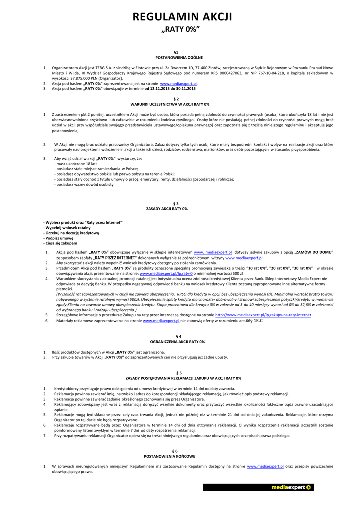 REGULAMIN AKCJI „RATY 0%” §1 POSTANOWIENIA OGÓLNE 1. 2. 3. Organizatorem Akcji jest TERG S.A. z siedzibą w Złotowie przy ul. Za Dworcem 1D, 77-400 Złotów, zarejestrowaną w Sądzie Rejonowym w Poznaniu Poznań Nowe Miasto i Wilda, IX Wydział Gospodarczy Krajowego Rejestru Sądowego pod numerem KRS 0000427063, nr NIP 767-10-04-218, o kapitale zakładowym w wysokości 37.875.000 PLN,(Organizator). Akcja pod hasłem „RATY 0%” zaprezentowana jest na stronie www.mediaexpert.pl. Akcja pod hasłem „RATY 0%” obowiązuje w terminie od 12.11.2015 do 30.11.2015 §2 WARUNKI UCZESTNICTWA W AKCJI RATY 0% 1 Z zastrzeżeniem pkt.2 poniżej, uczestnikiem Akcji może być osoba, która posiada pełną zdolność do czynności prawnych (osoba, która ukończyła 18 lat i nie jest ubezwłasnowolniona częściowo lub całkowicie w rozumieniu kodeksu cywilnego. Osoby które nie posiadają pełnej zdolności do czynności prawnych mogą brać udział w akcji przy współudziale swojego przedstawiciela ustawowego/opiekuna prawnego) oraz zapoznała się z treścią niniejszego regulaminu i akceptuje jego postanowienia; 2. W Akcji nie mogą brać udziału pracownicy Organizatora. Zakaz dotyczy tylko tych osób, które miały bezpośredni kontakt i wpływ na realizacje akcji oraz które pracowały nad projektem i wdrożeniem akcji a także ich dzieci, rodziców, rodzeństwa, małżonków, oraz osób pozostających w stosunku przysposobienia. 3. Aby wziąć udział w akcji „RATY 0%” wystarczy, że: - masz ukończone 18 lat; - posiadasz stałe miejsce zamieszkania w Polsce; - posiadasz obywatelstwo polskie lub prawo pobytu na terenie Polski; - posiadasz stały dochód z tytułu umowy o pracę, emerytury, renty, działalności gospodarczej i rolniczej; - posiadasz ważny dowód osobisty. §3 ZASADY AKCJI RATY 0% - Wybierz produkt oraz "Raty przez Internet" - Wypełnij wniosek ratalny - Oczekuj na decyzję kredytową - Podpisz umowę - Ciesz się zakupem 1. 2. 3. 4. 5. 6. Akcja pod hasłem „RATY 0%” obowiązuje wyłącznie w sklepie internetowym www. mediaexpert.pl dotyczy jedynie zakupów z opcją „ZAMÓW DO DOMU” ze sposobem zapłaty „RATY PRZEZ INTERNET” dokonanych wyłącznie za pośrednictwem witryny www.mediaexpert.pl. Aby skorzystać z akcji należy wypełnić wniosek kredytowy dostępny po złożeniu zamówienia. Przedmiotem Akcji pod hasłem „RATY 0%” są produkty oznaczone specjalną promocyjną zawieszką o treści ”10 rat 0%”, ”20 rat 0%”, ”30 rat 0%” w okresie obowiązywania akcji, prezentowane na stronie: www.mediaexpert.pl/lp,raty-0 o minimalnej wartości 500 zł. Warunkiem skorzystania z aktualnej promocji ratalnej jest indywidualna ocena zdolności kredytowej Klienta przez Bank. Sklep Internetowy Media Expert nie odpowiada za decyzję Banku. W przypadku negatywnej odpowiedzi banku na wniosek kredytowy Klienta zostaną zaproponowane inne alternatywne formy płatności. (Wysokość rat zaprezentowanych w akcji nie zawiera ubezpieczenia. RRSO dla kredytu w opcji bez ubezpieczenia wynosi 0%. Minimalna wartość brutto towaru nabywanego w systemie ratalnym wynosi 500zł. Ubezpieczenie spłaty kredytu ma charakter dobrowolny i stanowi zabezpieczenie pożyczki/kredytu w momencie zgody Klienta na zawarcie umowy ubezpieczenia kredytu. Stopa procentowa dla kredytu 0% w zakresie od 3 do 40 miesięcy wynosi od 0% do 32,6% w zależności od wybranego banku i rodzaju ubezpieczenia.) Szczegółowe informacje o procedurze Zakupu na raty przez internet są dostępne na stronie http://www.mediaexpert.pl/lp,zakupy-na-raty-internet Materiały reklamowe zaprezentowane na stronie www.mediaexpert.pl nie stanowią oferty w rozumieniu art.66§ 1K.C §4 OGRANICZENIA AKCJI RATY 0% 1. 3. Ilość produktów dostępnych w Akcji „RATY 0%” jest ograniczona. Przy zakupie towarów w Akcji „RATY 0%” od zaprezentowanych cen nie przysługują już żadne upusty. §5 ZASADY POSTĘPOWANIA REKLAMACJI ZAKUPU W AKCJI RATY 0% 1. 2. 3. 4. 5. 6. 7. Kredytobiorcy przysługuje prawo odstąpienia od umowy kredytowej w terminie 14 dni od daty zawarcia. Reklamacja powinna zawierać imię, nazwisko i adres do korespondencji składającego reklamację, jak również opis podstawy reklamacji. Reklamacja powinna zawierać żądanie określonego zachowania się przez Organizatora. Reklamujący zobowiązany jest wraz z reklamacją doręczyć wszelkie dokumenty oraz przytoczyć wszystkie okoliczności faktyczne bądź prawne uzasadniające żądanie. Reklamacje mogą być składane przez cały czas trwania Akcji, jednak nie później niż w terminie 21 dni od dnia jej zakończenia. Reklamacje, które otrzyma Organizator po tej dacie nie będą rozpatrywane. Reklamcaje rozpatrywane będą przez Organizatora w terminie 14 dni od dnia otrzymania reklamacji. O wyniku rozpatrzenia reklamacji Uczestnik zostanie poinformowany listem zwykłym w terminie 7 dni od daty rozpatrzenia reklamacji. Przy rozpatrywaniu reklamacji Organizator opiera się na treści niniejszego regulaminu oraz obowiązujących przepisach prawa polskiego. §6 POSTANOWIENIA KOŃCOWE 1. W sprawach nieuregulowanych niniejszym Regulaminem ma zastosowanie Regulamin dostępny na stronie www.mediaexpert.pl oraz przepisy powszechnie obowiązującego prawa.