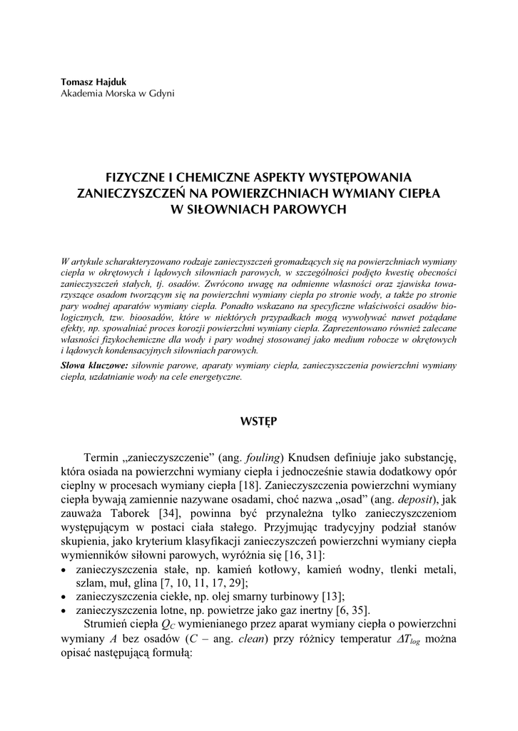 Tomasz Hajduk Akademia Morska w Gdyni FIZYCZNE I CHEMICZNE ASPEKTY WYSTĘPOWANIA ZANIECZYSZCZEŃ NA POWIERZCHNIACH WYMIANY CIEPŁA W SIŁOWNIACH PAROWYCH W artykule scharakteryzowano rodzaje zanieczyszczeń gromadzących się na powierzchniach wymiany ciepła w okrętowych i lądowych siłowniach parowych, w szczególności podjęto kwestię obecności zanieczyszczeń stałych, tj. osadów. Zwrócono uwagę na odmienne własności oraz zjawiska towarzyszące osadom tworzącym się na powierzchni wymiany ciepła po stronie wody, a także po stronie pary wodnej aparatów wymiany ciepła. Ponadto wskazano na specyficzne właściwości osadów biologicznych, tzw. bioosadów, które w niektórych przypadkach mogą wywoływać nawet pożądane efekty, np. spowalniać proces korozji powierzchni wymiany ciepła. Zaprezentowano również zalecane własności fizykochemiczne dla wody i pary wodnej stosowanej jako medium robocze w okrętowych i lądowych kondensacyjnych siłowniach parowych. Słowa kluczowe: siłownie parowe, aparaty wymiany ciepła, zanieczyszczenia powierzchni wymiany ciepła, uzdatnianie wody na cele energetyczne. WSTĘP Termin „zanieczyszczenie” (ang. fouling) Knudsen definiuje jako substancję, która osiada na powierzchni wymiany ciepła i jednocześnie stawia dodatkowy opór cieplny w procesach wymiany ciepła [18]. Zanieczyszczenia powierzchni wymiany ciepła bywają zamiennie nazywane osadami, choć nazwa „osad” (ang. deposit), jak zauważa Taborek [34], powinna być przynależna tylko zanieczyszczeniom występującym w postaci ciała stałego. Przyjmując tradycyjny podział stanów skupienia, jako kryterium klasyfikacji zanieczyszczeń powierzchni wymiany ciepła wymienników siłowni parowych, wyróżnia się [16, 31]: • zanieczyszczenia stałe, np. kamień kotłowy, kamień wodny, tlenki metali, szlam, muł, glina [7, 10, 11, 17, 29]; • zanieczyszczenia ciekłe, np. olej smarny turbinowy [13]; • zanieczyszczenia lotne, np. powietrze jako gaz inertny [6, 35]. Strumień ciepła QC wymienianego przez aparat wymiany ciepła o powierzchni wymiany A bez osadów (C – ang. clean) przy różnicy temperatur ΔTlog można opisać następującą formułą: 60 ZESZYTY NAUKOWE AKADEMII MORSKIEJ W GDYNI, nr 96, grudzień 2016 Q C = 1 × A × ΔTlog , rk , C (1) gdzie: rk,C – opór cieplny właściwy przenikaniu ciepła dla wymiennika bez osadów. Następstwem tworzenia się zanieczyszczeń na powierzchni wymiany ciepła danego wymiennika, z racji ich dużego oporu przewodzenia ciepła rf, jest zazwyczaj utrata wydajności cieplnej wymiennika do wartości QF (F – ang. fouled), nazywana coraz częściej mianem degradacji termicznej (cieplnej) wymiennika ciepła [5, 6]. Powyższą kwestię można uzasadnić na podstawie zależności: Q F = 1 × A × ΔTlog . rk , F (2) Ponieważ rk , F = rk ,C + r f ∧ r f > 0 ⇒ 1 < 1 , rk ,C + r f rk ,C to uwzględniając zależności (1), (2), ostateczną konkluzję można zapisać następująco: Q F < Q C , q.e.d . Obecność zanieczyszczeń na powierzchni rurek wymienników ciepła w układach parowych siłowni cieplnych okrętowych i lądowych (skraplacze, regeneracyjne podgrzewacze wody zasilającej) jest przyczyną m.in. wzrostu spiętrzeń temperatur, a w przypadku skraplaczy – związanego z tym pogorszenia stopnia próżni [4, 6, 8, 15, 37]. Ostatecznie proces degradacji termicznej wymienników ciepła prowadzi do zmniejszenia sprawności danego bloku energetycznego [8, 19, 22]. Powoduje to zawsze wzrost kosztów przetwarzania energii, w konsekwencji prowadząc do zwiększonej degradacji środowiska naturalnego, chociażby poprzez większe niż to konieczne zużycie surowców energetycznych [32]. Warto dodać, że zanieczyszczenia odkładające się wewnątrz rur wymiennika ciepła, tj. po stronie wody, mogą dodatkowo zapoczątkować proces obliteracji przewodów. W szczególności zjawisko to jest charakterystyczne dla skraplaczy cieplnych chłodzonych wodą morską [16, 34]. Zmniejszając światło pojedynczej rury, osady powodują wzrost oporów przepływu z jednoczesnym zmniejszeniem wydajności pompy wody chłodzącej skraplacz (rys. 1, pkt B). W efekcie prowadzi to do zmniejszenia prędkości przepływu wody, co skutkuje dodatkowym wzrostem oporu wnikania ciepła. Zmniejszenie prędkości przepływu wody powoduje ponadto wzrost intensywności wytrącania się osadów [3, 26], nasilając w ten sposób zjawisko zarastania rurek. Aby z powrotem uzyskać nominalne natężenie przepływu wody chłodzącej przez zanieczyszczony skraplacz, należałoby zmienić charakterystykę przepływu pompy wody chłodzącej, np. zwiększając odpowiednio jej obroty. Jednak taki zabieg wiąże się ze zwiększonym zapotrzebowaniem mocy silnika napędowego pompy, w konsekwencji powodując wzrost energochłonności układu chłodzenia siłowni parowej (rys. 1, punkt C). Zatem uwzględniając dodatkowo zjawisko obliteracji T. Hajduk, Fizyczne i chemiczne aspekty występowania zanieczyszczeń na powierzchniach wymiany ciepła... 61 Y – jednostkowa praca użyteczna rur, np. w skraplaczach siłowni parowych, można stwierdzić, że w tym przypadku obecność zanieczyszczeń na powierzchni wymiany ciepła prowadzi nie tylko do ich degradacji cieplnej, ale szerzej – do ich degradacji cieplno-przepływowej. YC n2 n1 C n1 < n2 B YA A FR2 FR1 VB < VA = V C wydajność pompy Rys. 1. Współpraca pompy wody chłodzącej skraplacz siłowni parowej wyposażonej w regulację prędkości obrotowej n z instalacją o różnych oporach przepływu FR; FR1 – skraplacz bez osadów, FR2 – skraplacz z osadami Fig. 1. Cooperation between the condenser cooling pump equipped with speed control and the steam power plant installation in different flow resistance state FR; FR1 – condenser without deposits, FR2 – condenser with deposits Źródłem pochodzenia zanieczyszczeń stałych gromadzących się na powierzchniach wymiany ciepła wymienników si
